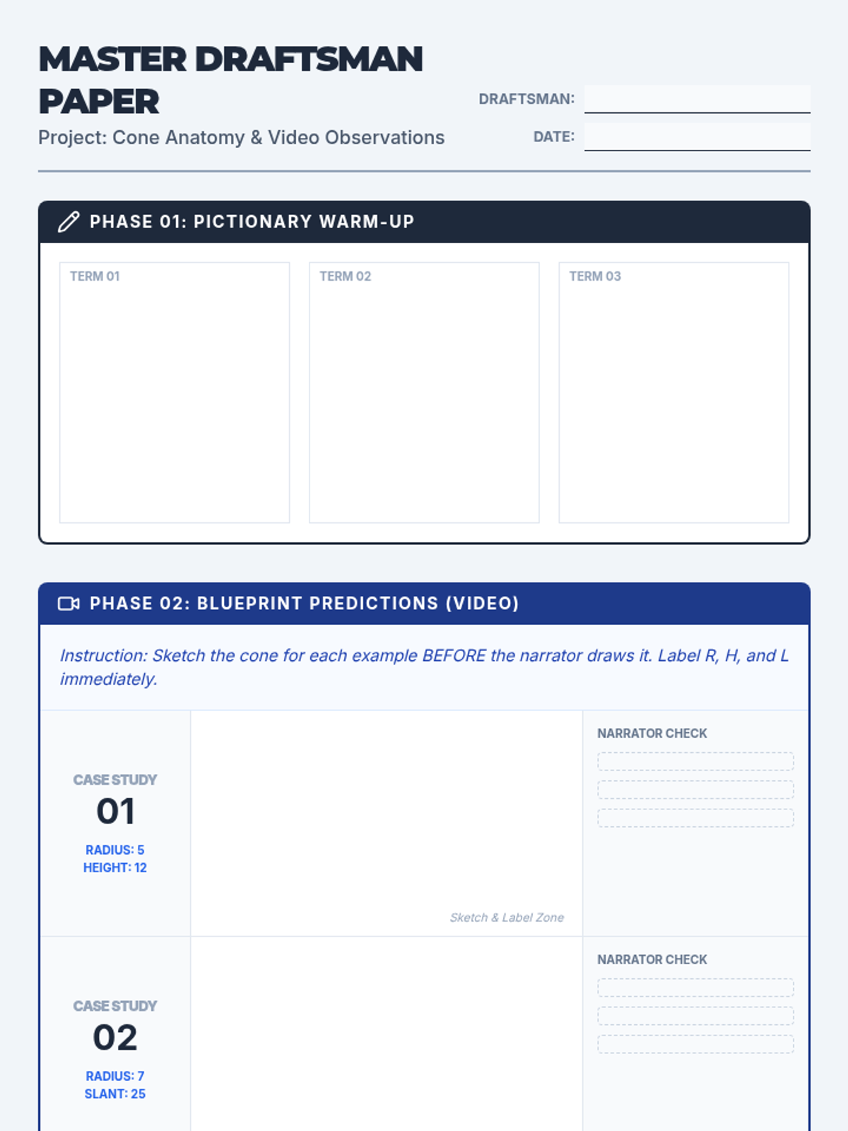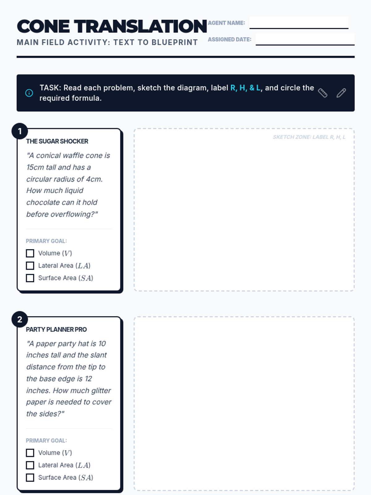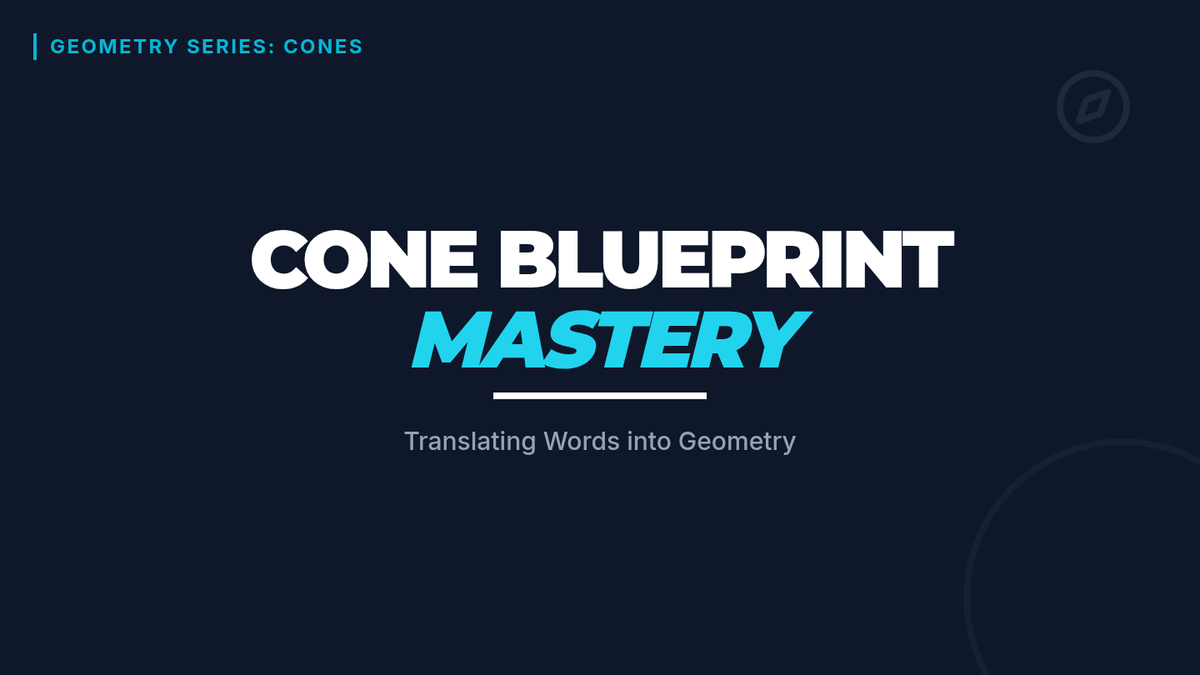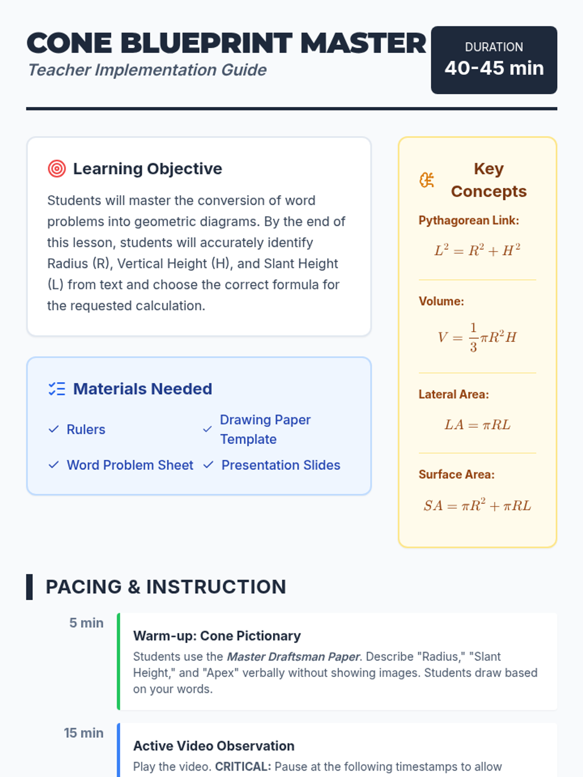 Students will learn to translate complex verbal descriptions of cones into accurate geometric diagrams. The lesson focuses on identifying key dimensions (Radius, Height, Slant Height) and selecting appropriate formulas for Volume, Lateral Area, and Surface Area through a video-guided drawing exercise and word problem translation activity.