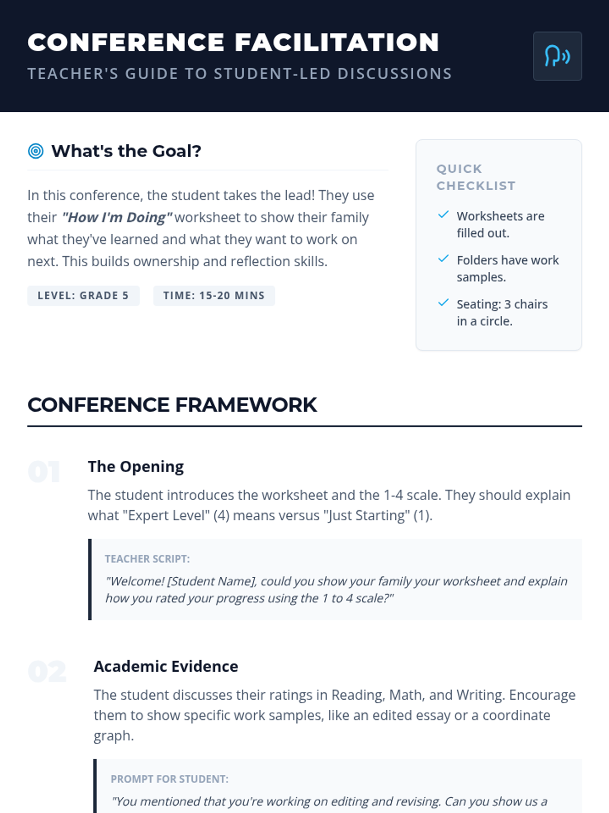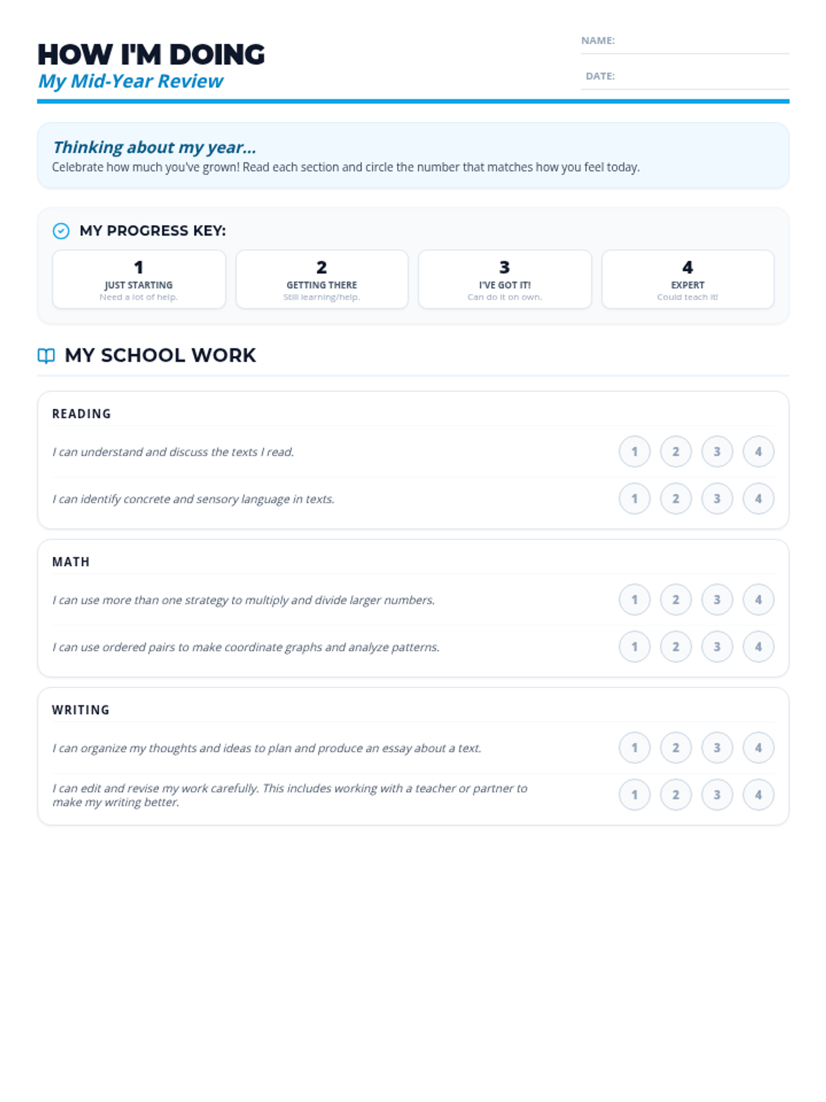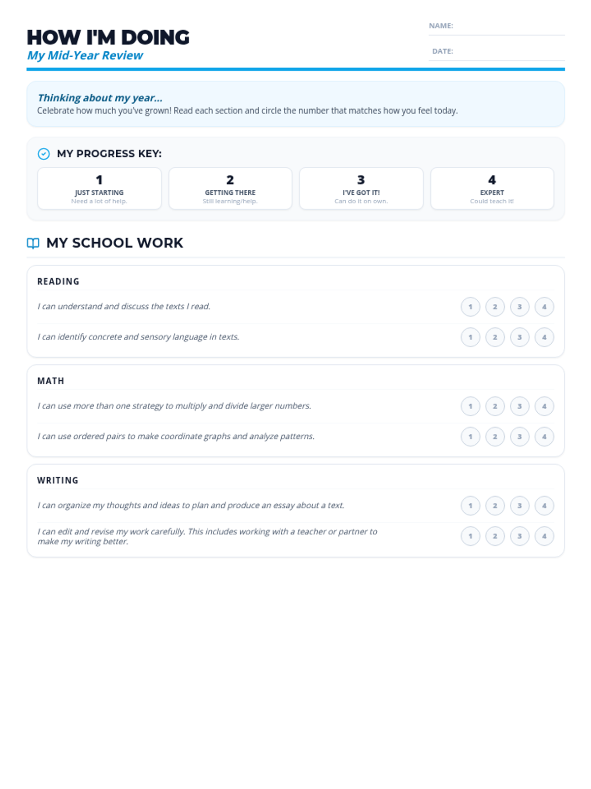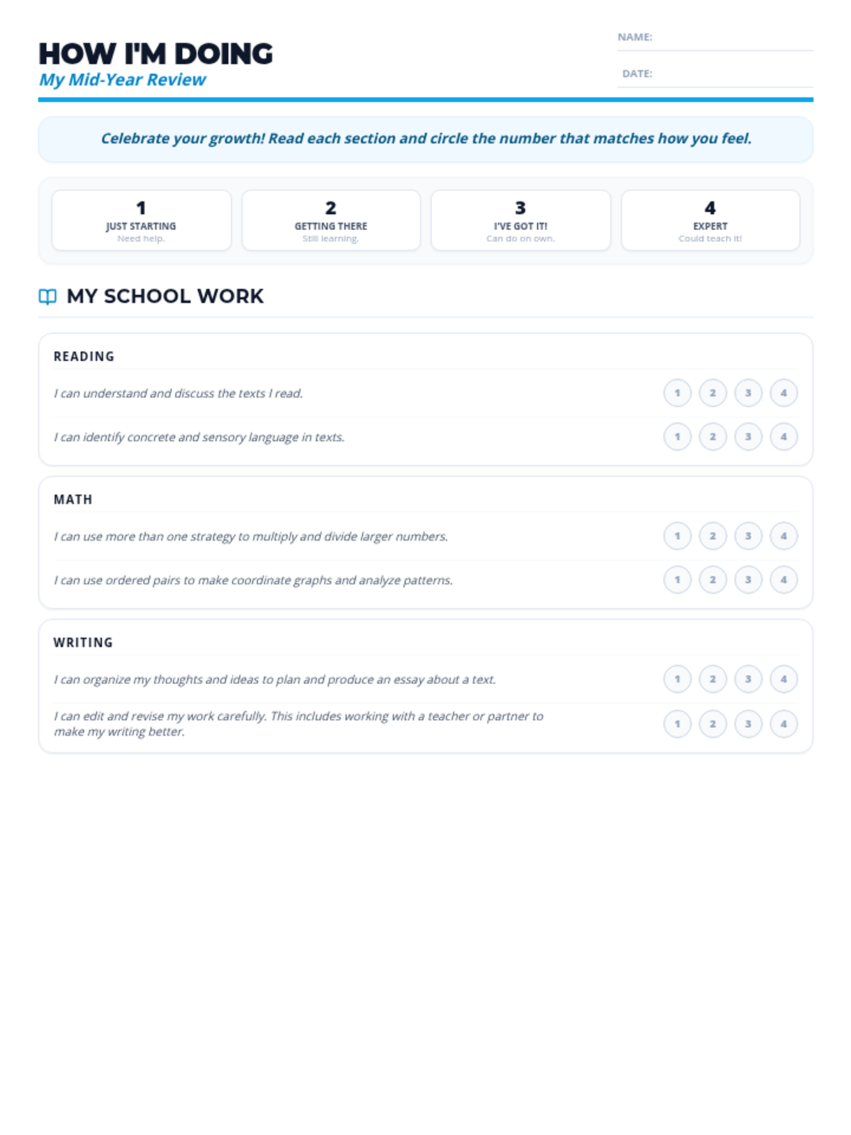 A lesson designed to help fifth-grade students prepare for mid-year conferences by reflecting on their academic progress, social habits, and future goals through a mountain-climbing themed self-assessment.