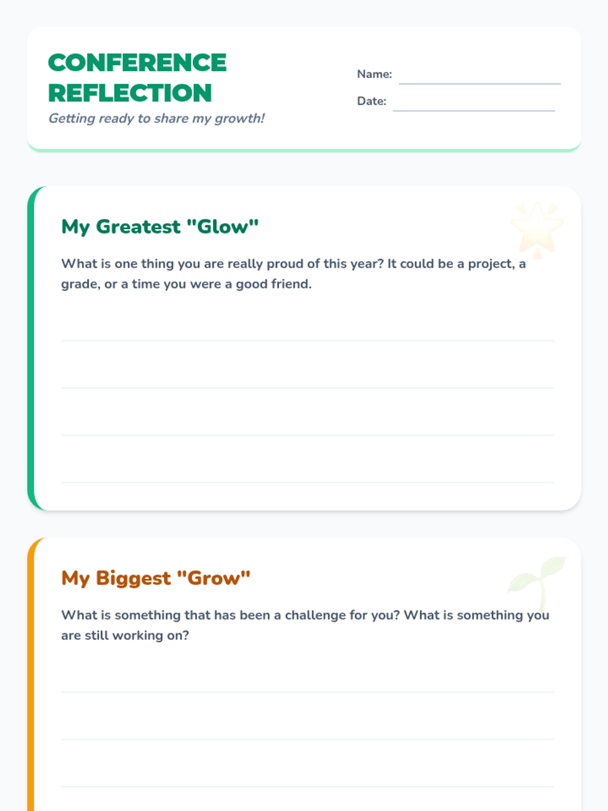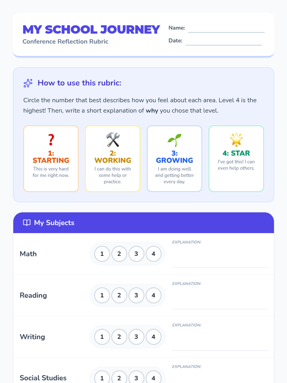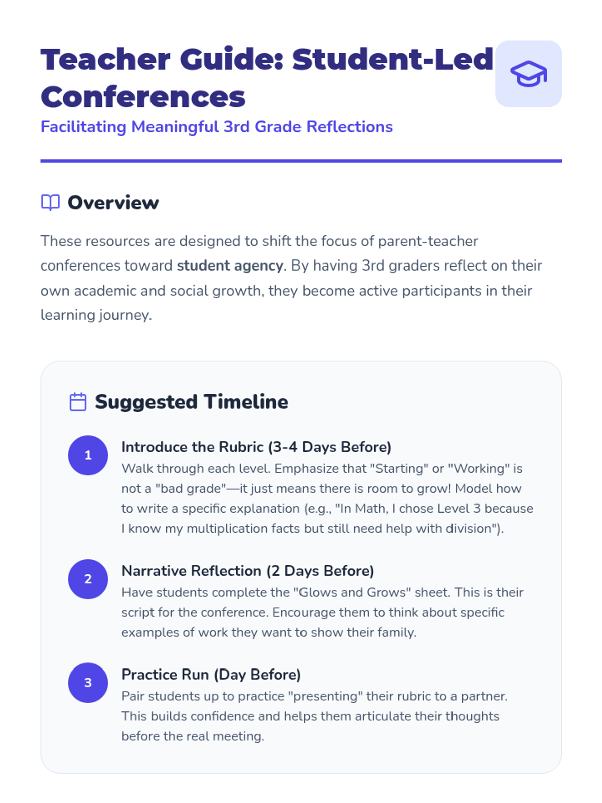A set of resources designed to help third-grade students reflect on their academic and social progress in preparation for parent-teacher conferences. Includes a student-facing rubric and a reflection guide to facilitate student-led discussions.