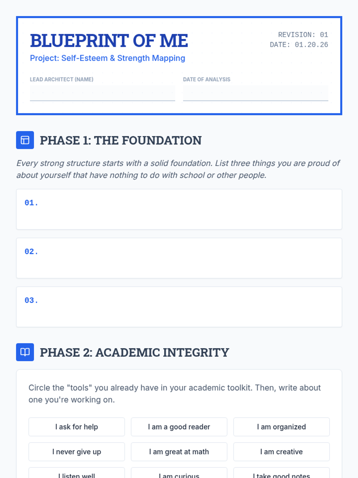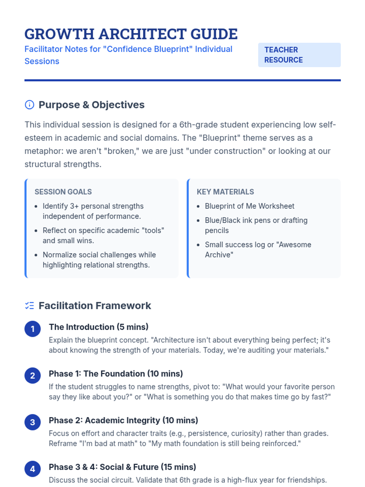 A specialized individual session designed to boost self-esteem in 6th-grade students by identifying strengths in academics and social interactions through a 'Blueprint' themed self-reflection.