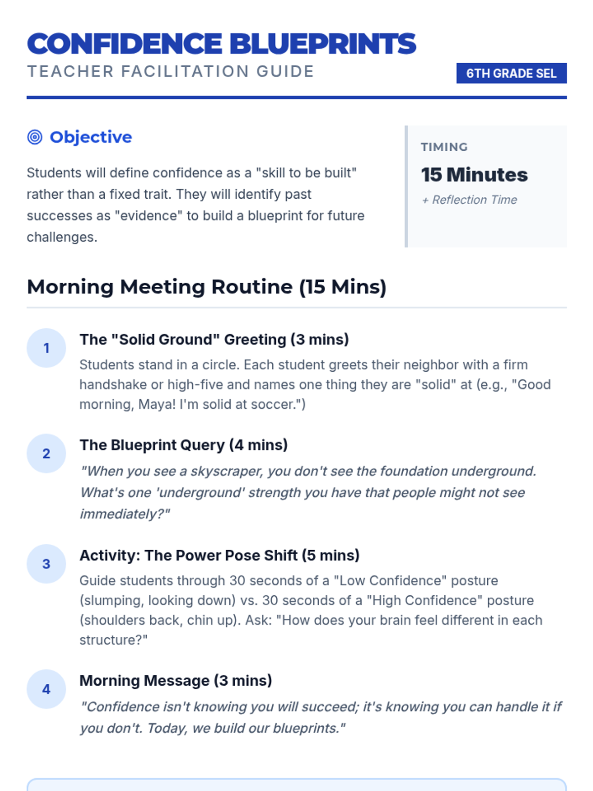 A quick, impactful 15-minute morning meeting session focused on building self-confidence through recognizing personal strengths and 'evidence' of past successes, followed by a reflective graphic organizer activity.