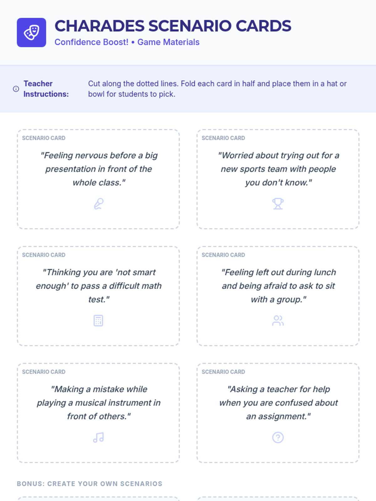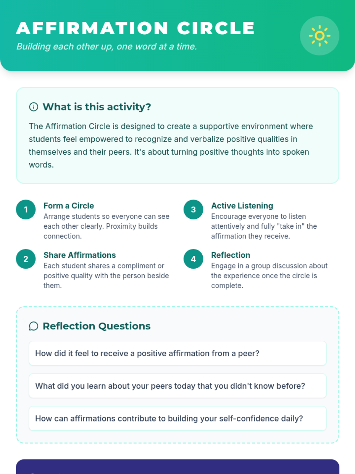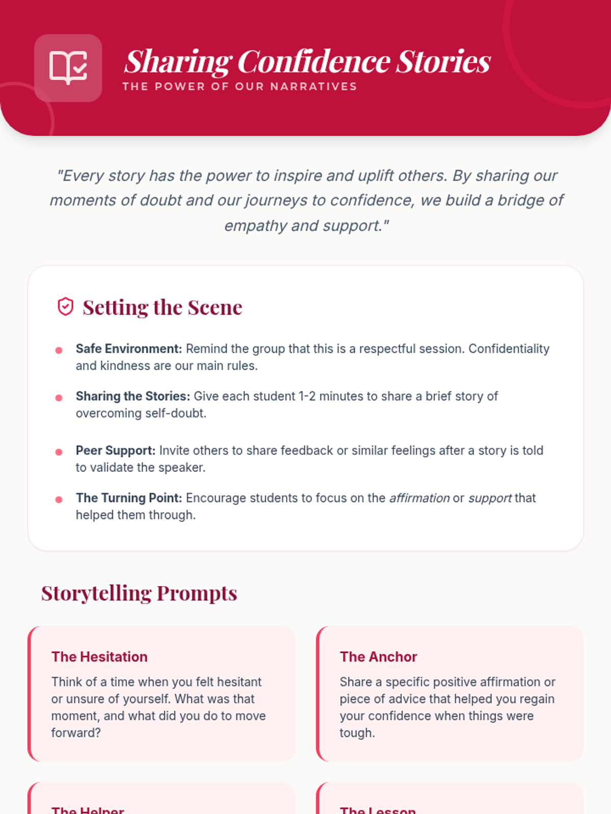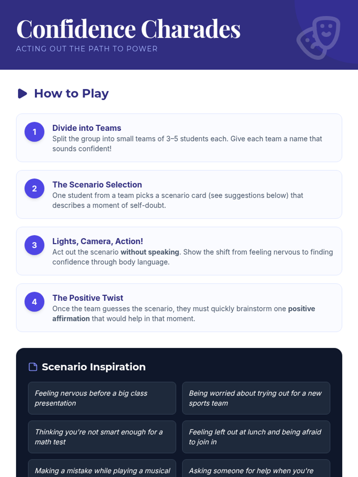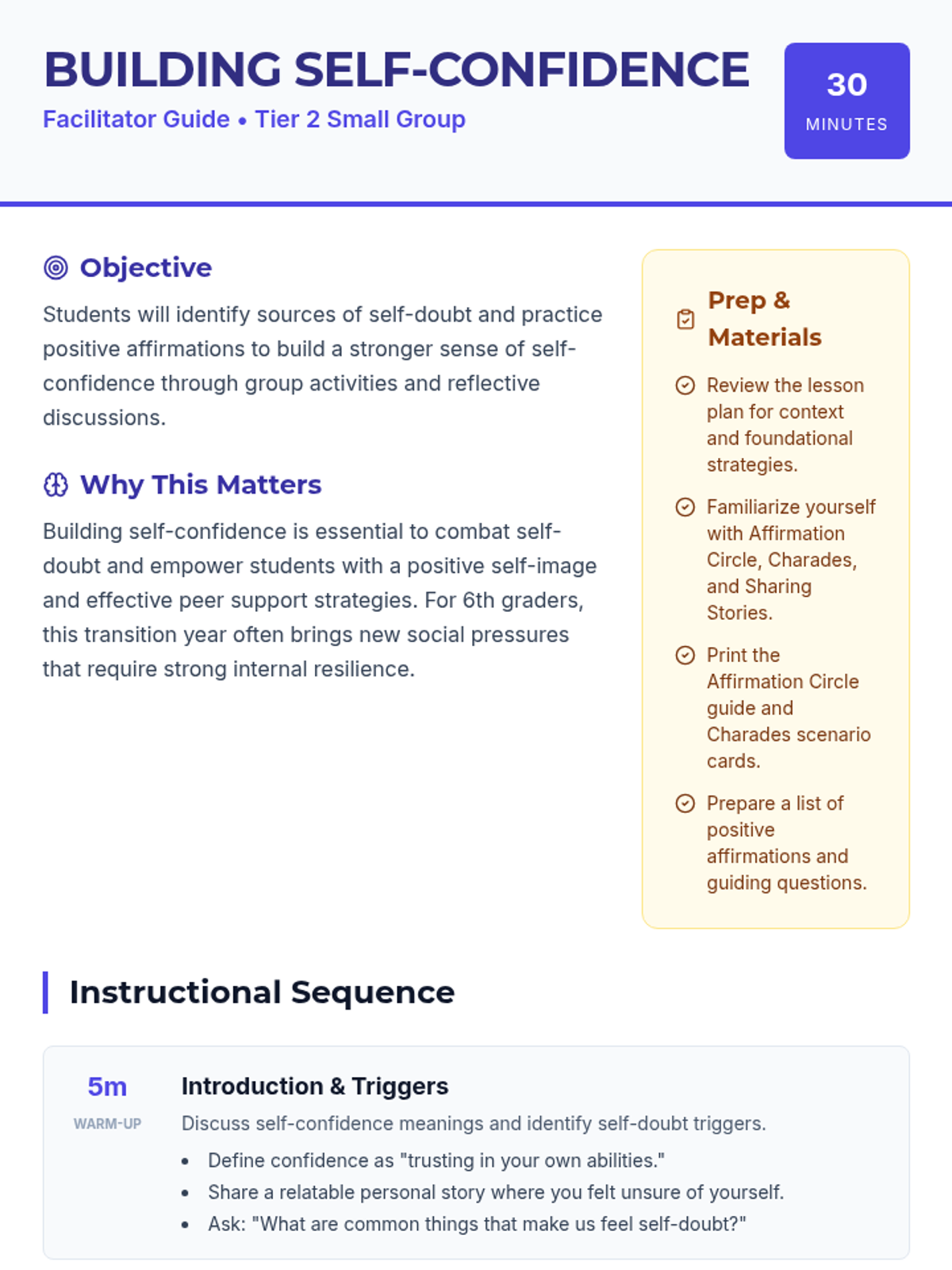 A Tier 2 small group lesson for 6th graders focused on identifying self-doubt and using positive affirmations to build self-confidence. includes interactive games and personal storytelling.