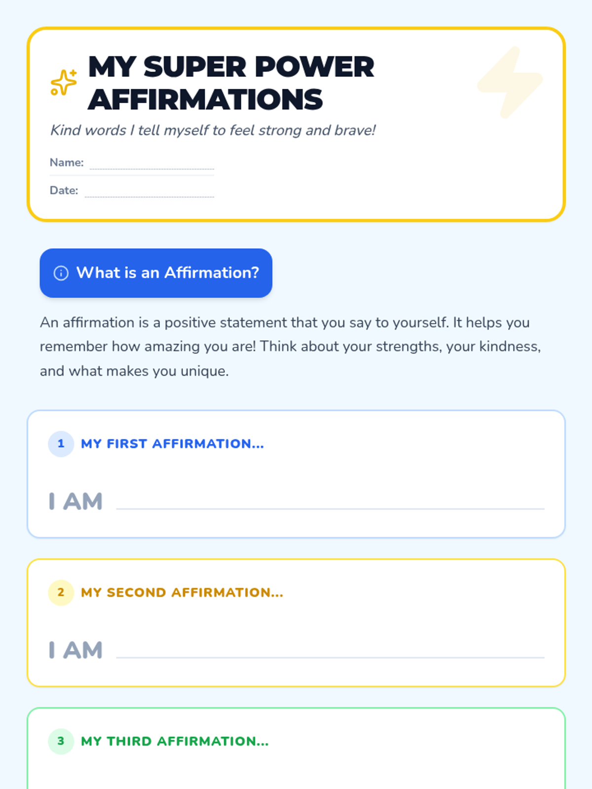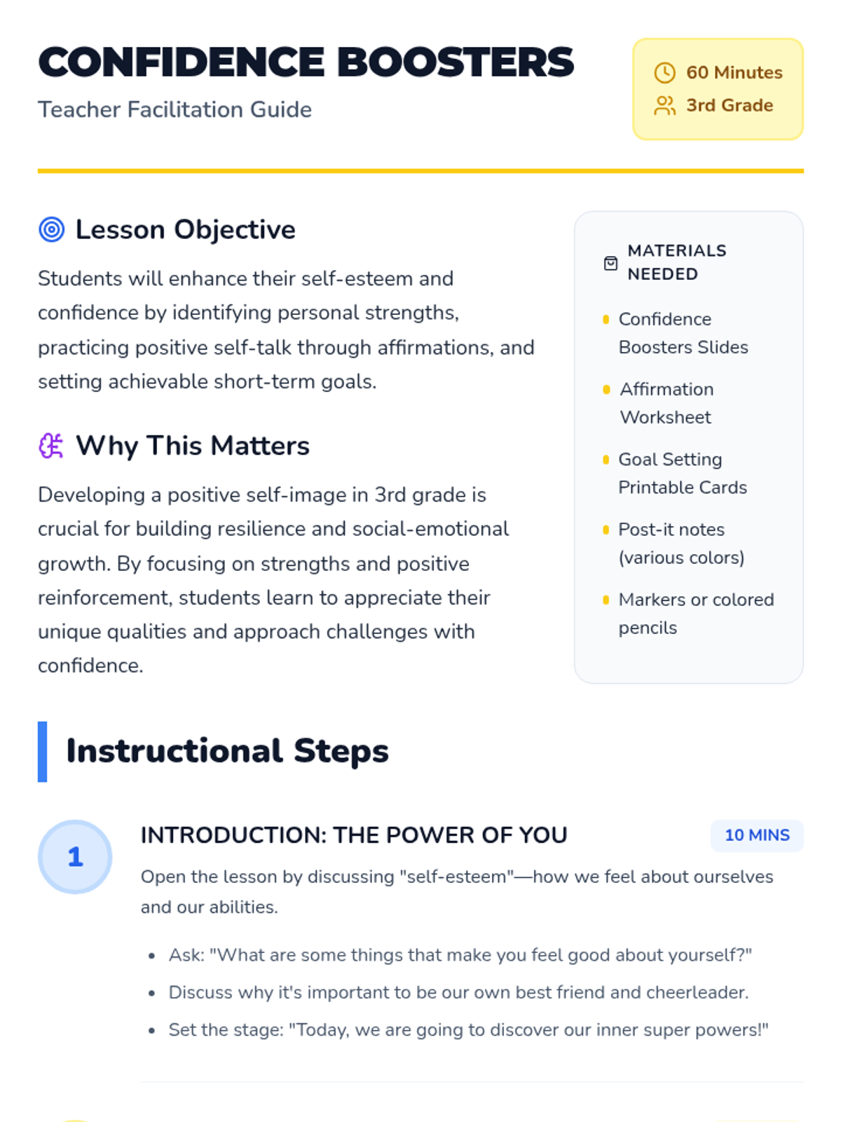 A lesson designed to enhance self-esteem and confidence in third graders through affirmations, goal setting, and positive reinforcement. Students will identify their strengths, set achievable goals, and practice giving and receiving compliments to foster a positive self-image.