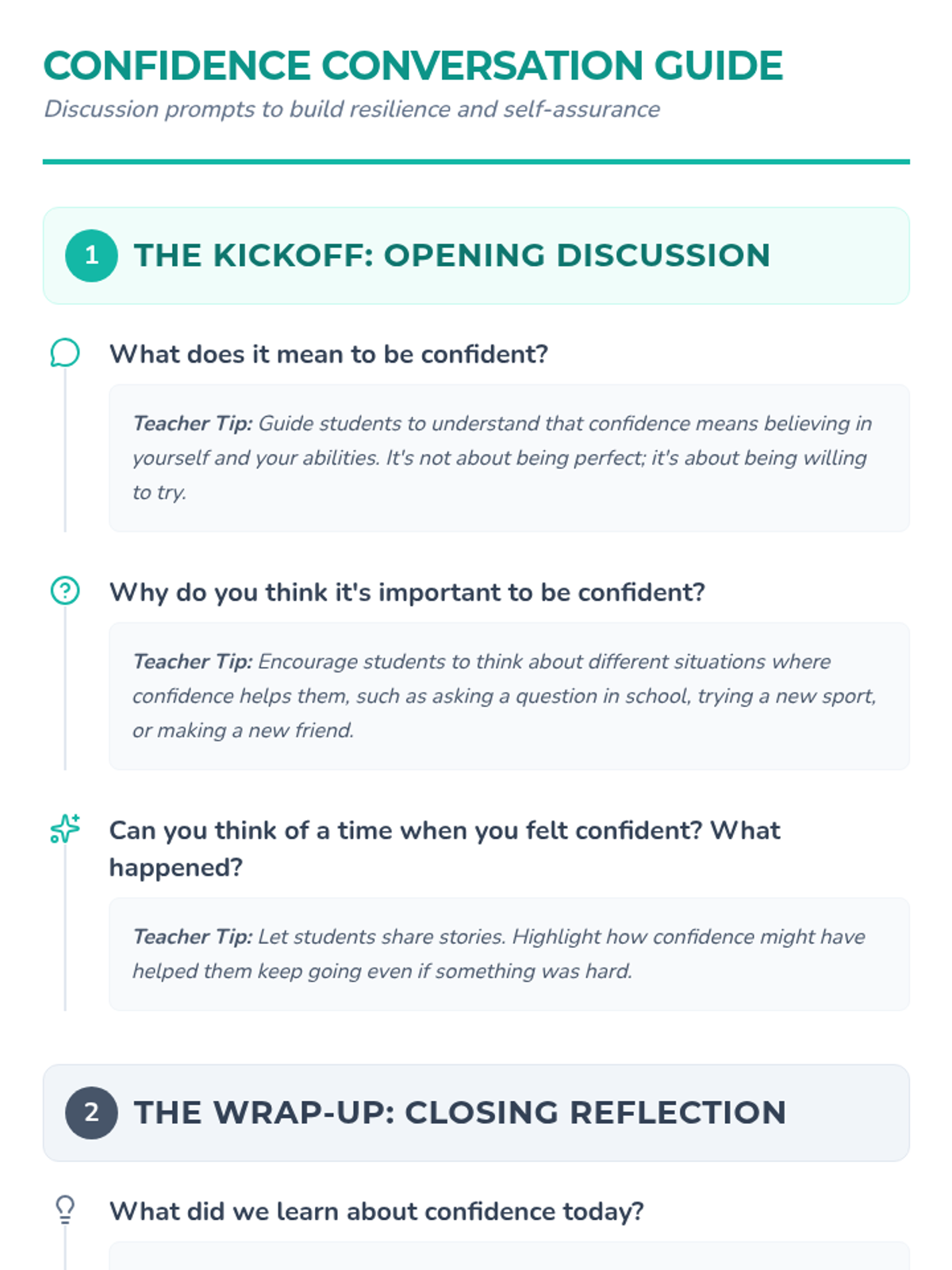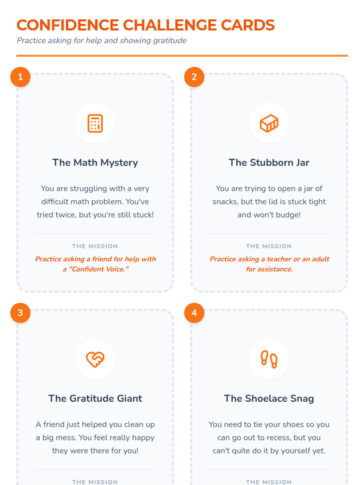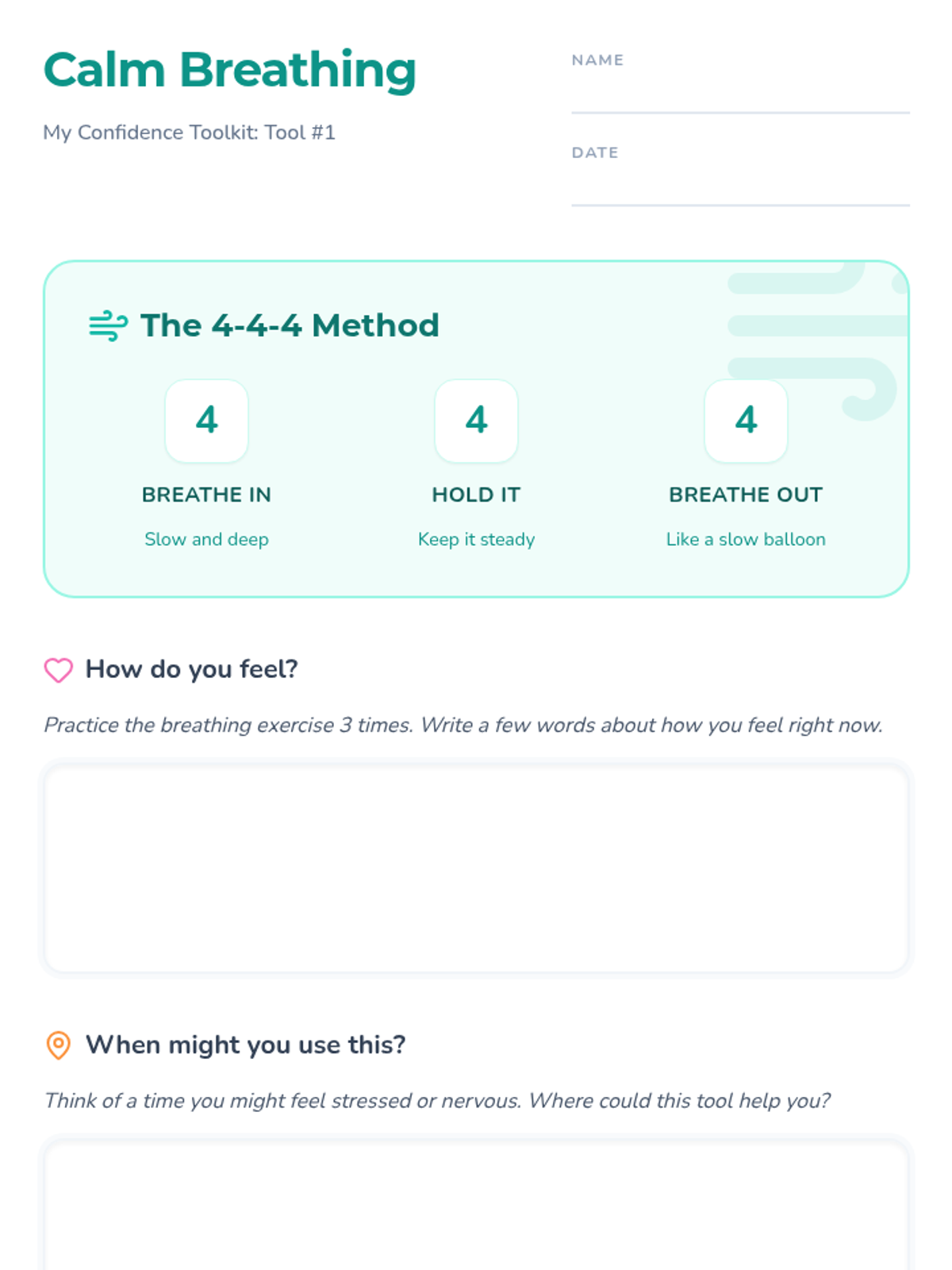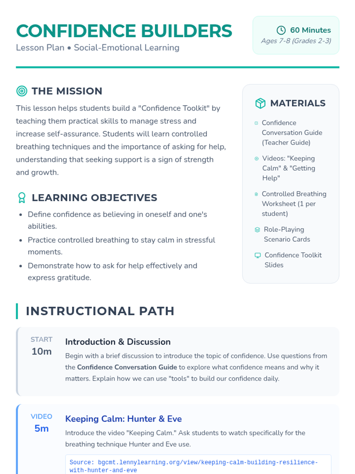 A comprehensive lesson designed for 7-8 year olds to build self-assurance through practical stress-management techniques like controlled breathing and the social skill of asking for help. Students explore resilience through videos, guided practice, and role-playing scenarios.