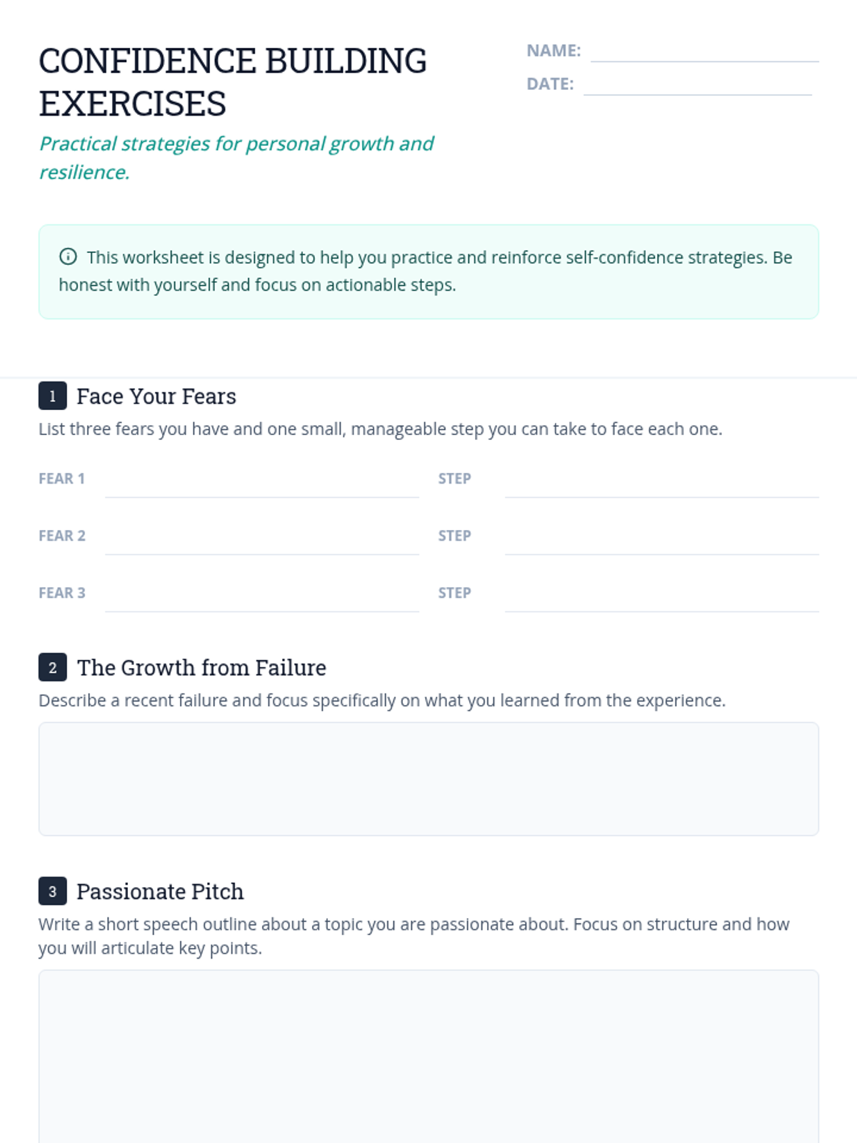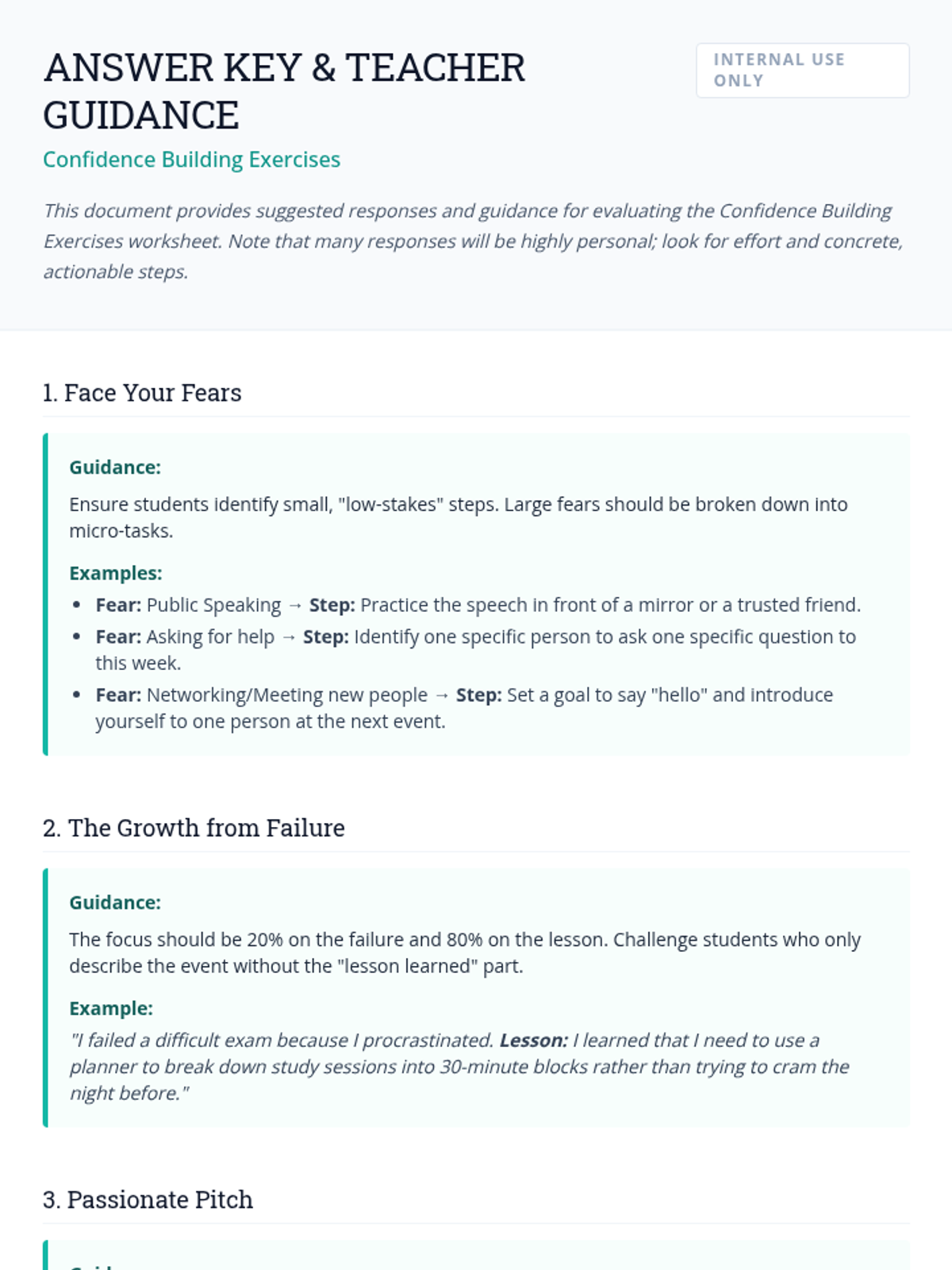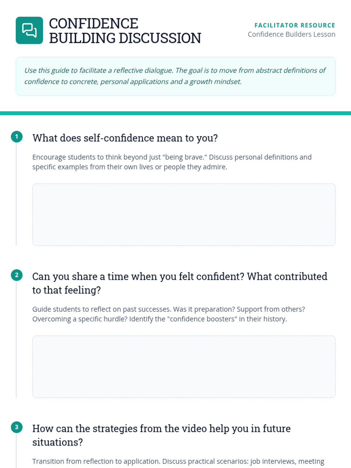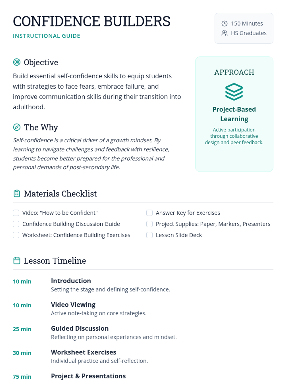 A comprehensive lesson for high school graduates focused on developing self-confidence through reflection, discussion, and practical application. Students will learn strategies to face fears, embrace failure, and project confidence through body language and speech.