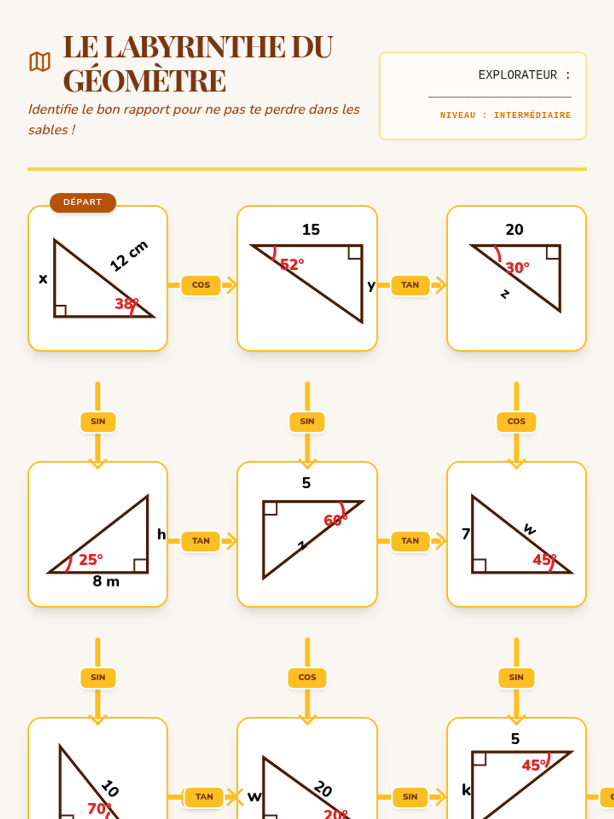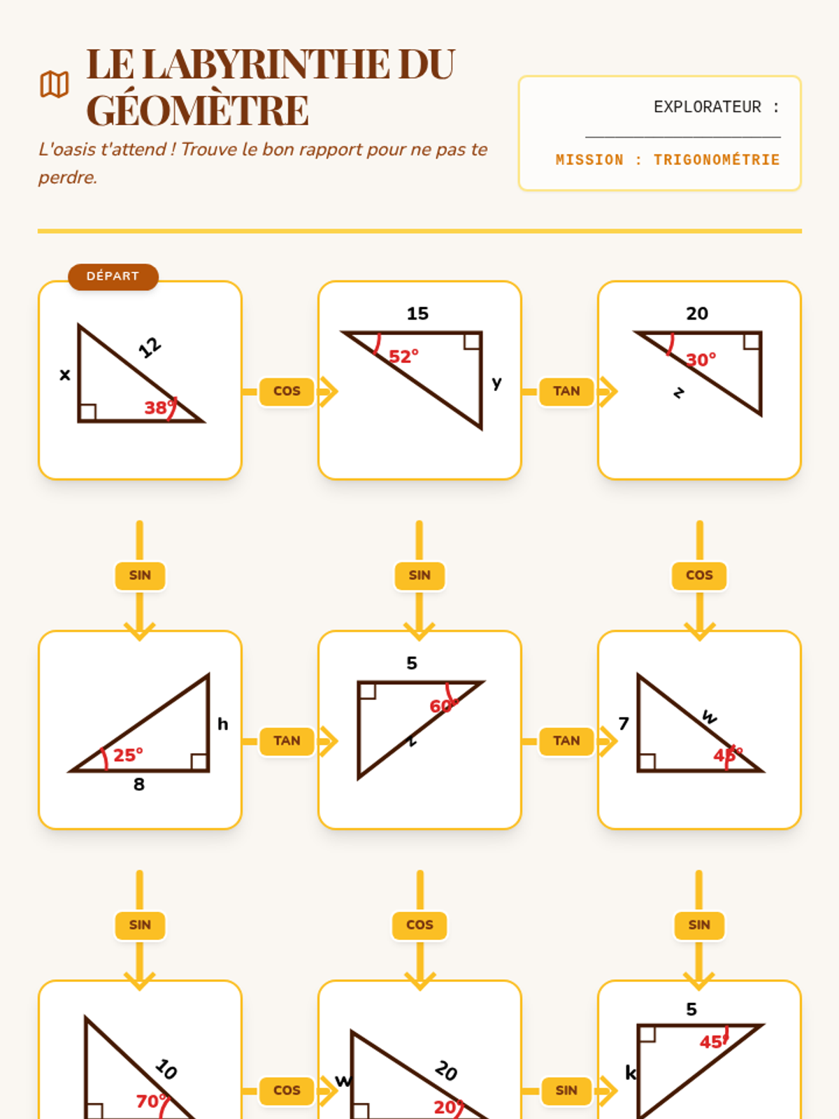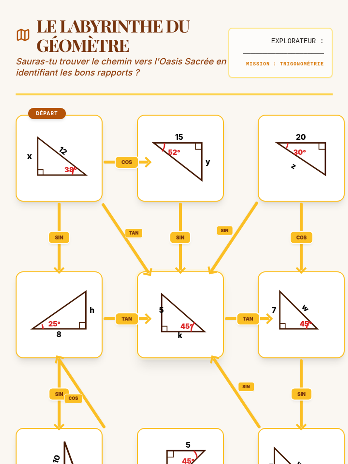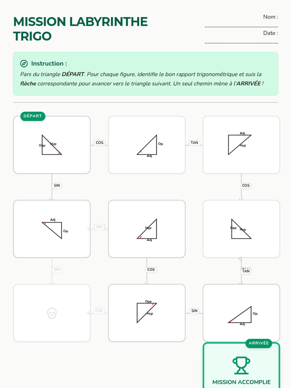 Une leçon interactive centrée sur l'identification des rapports trigonométriques (sinus, cosinus, tangente) dans des triangles rectangles à travers un défi de labyrinthe.