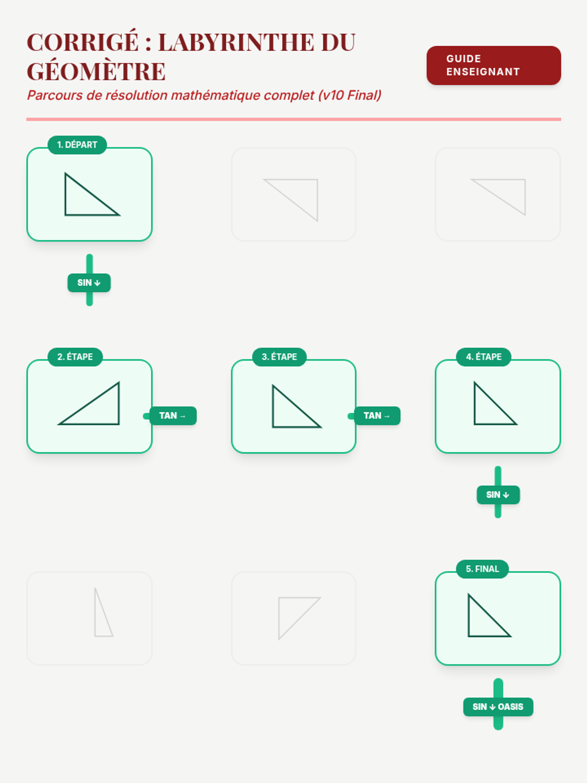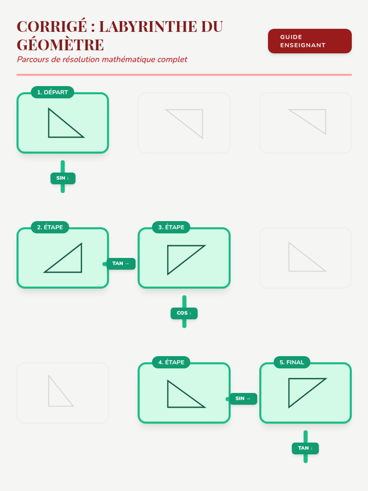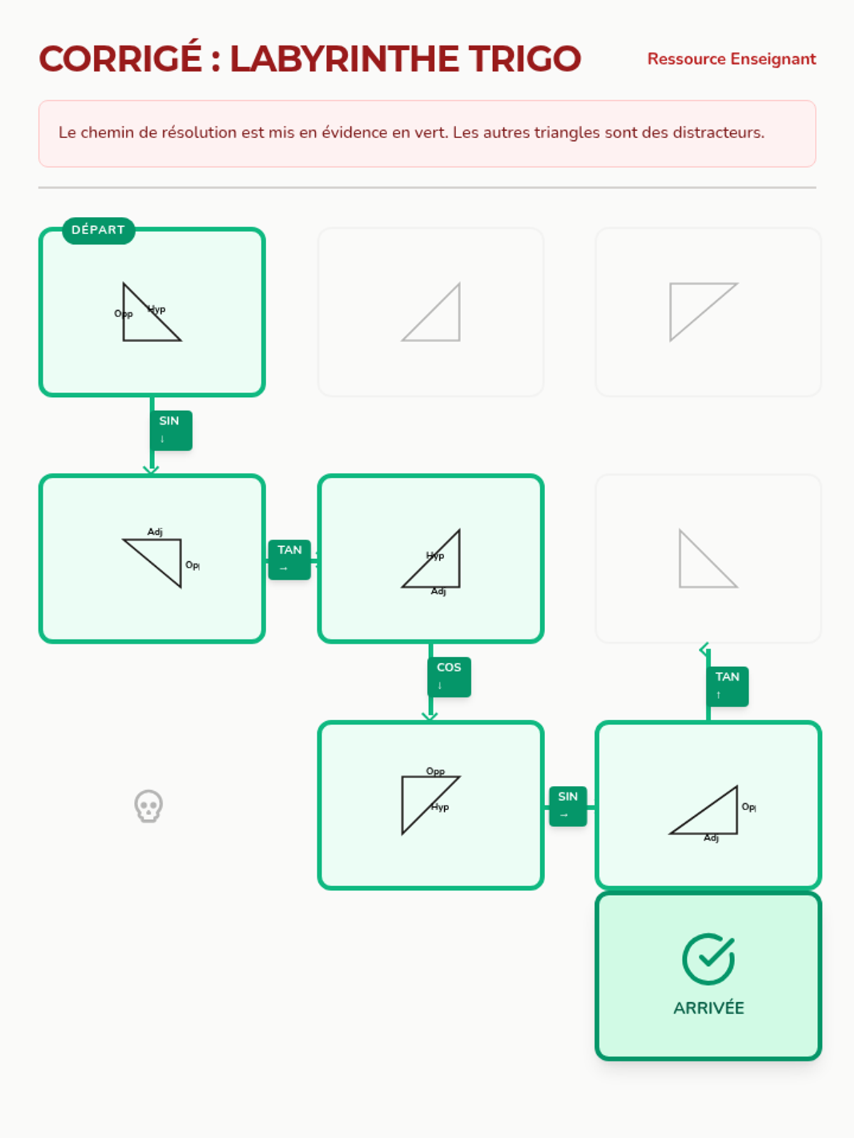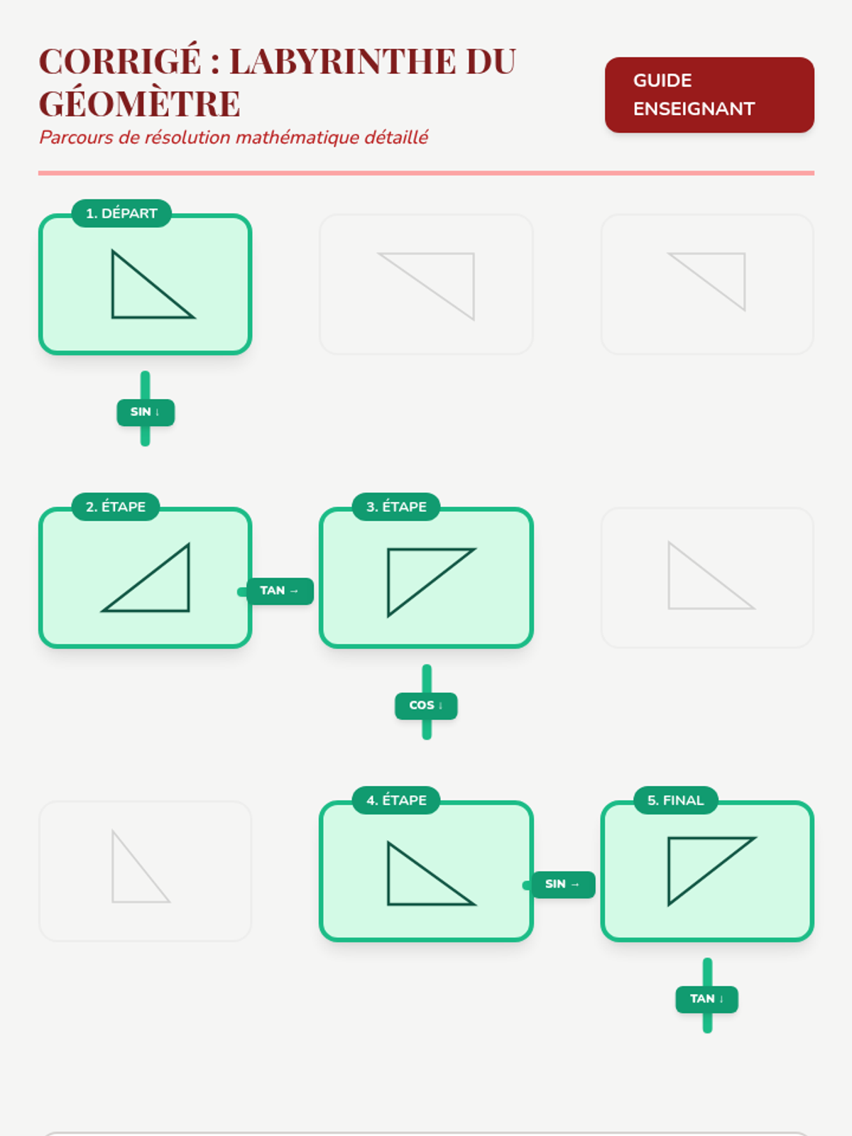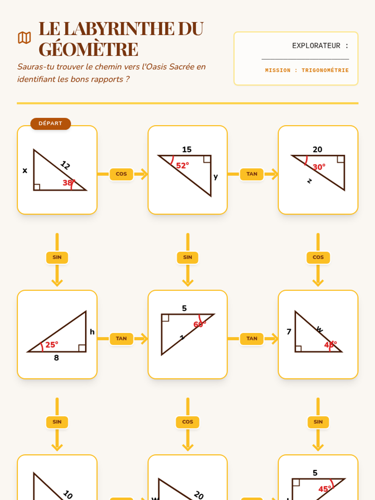 Une leçon interactive centrée sur l'identification des rapports trigonométriques (sinus, cosinus, tangente) dans des triangles rectangles à travers un défi de labyrinthe.