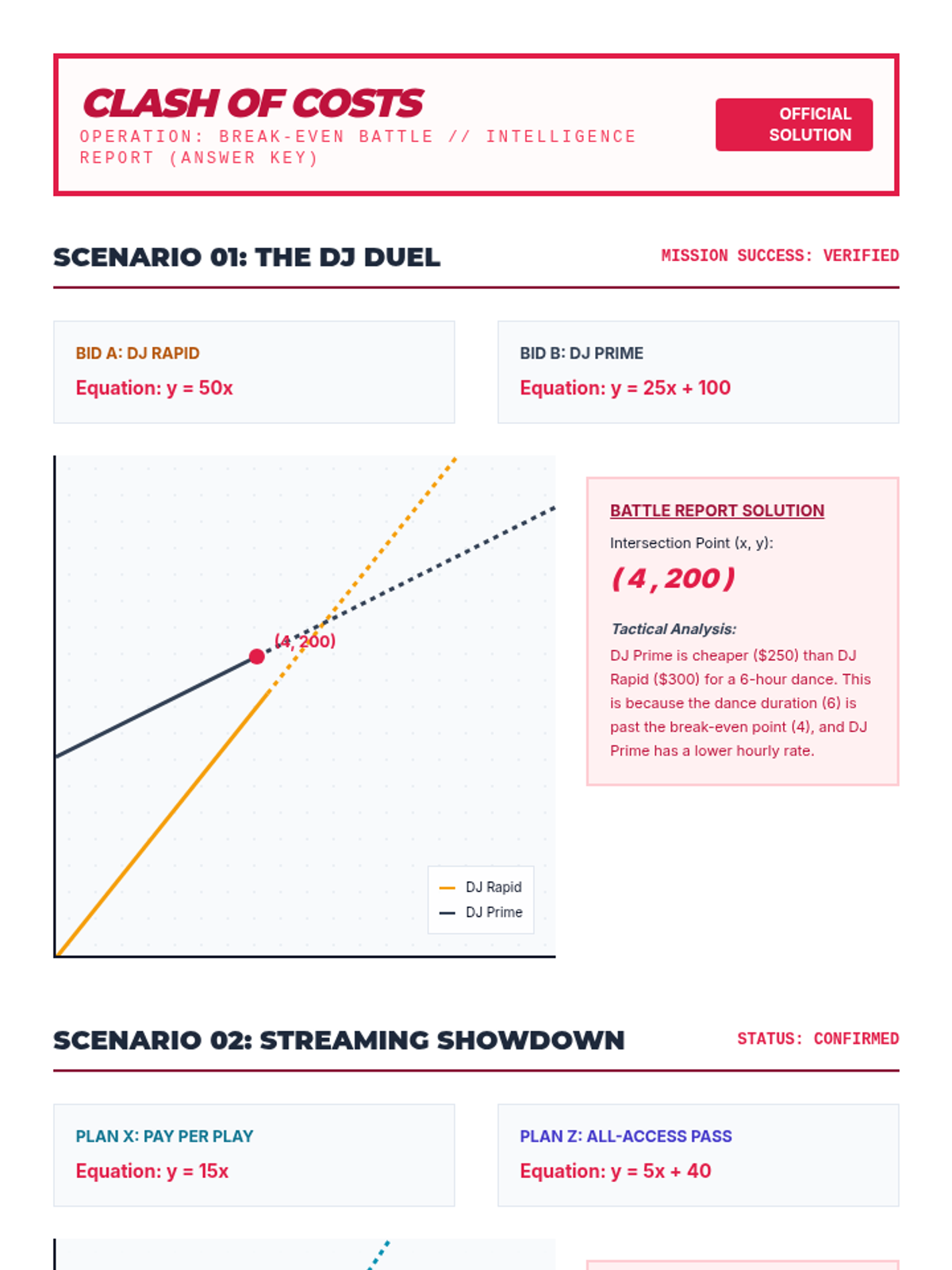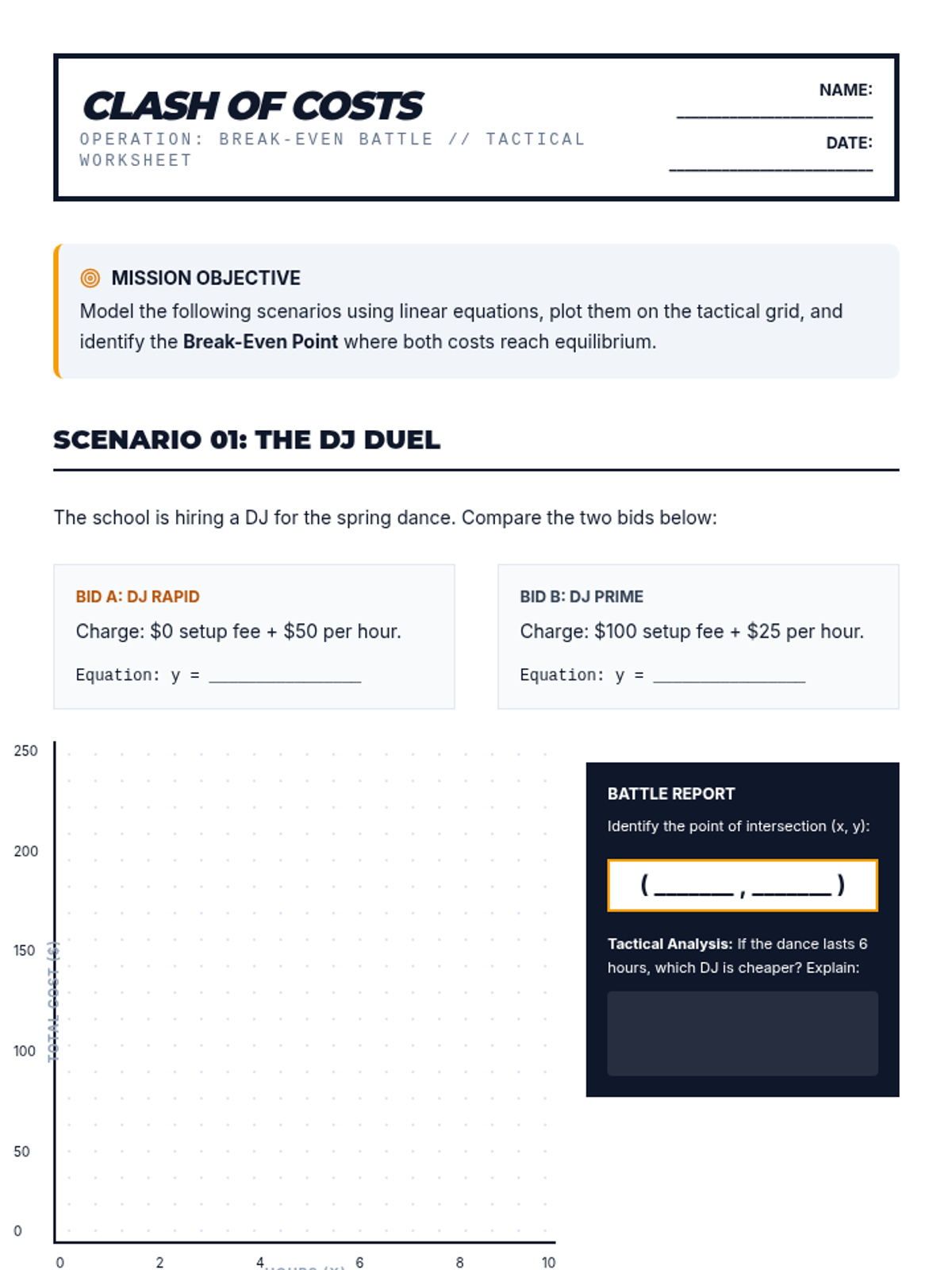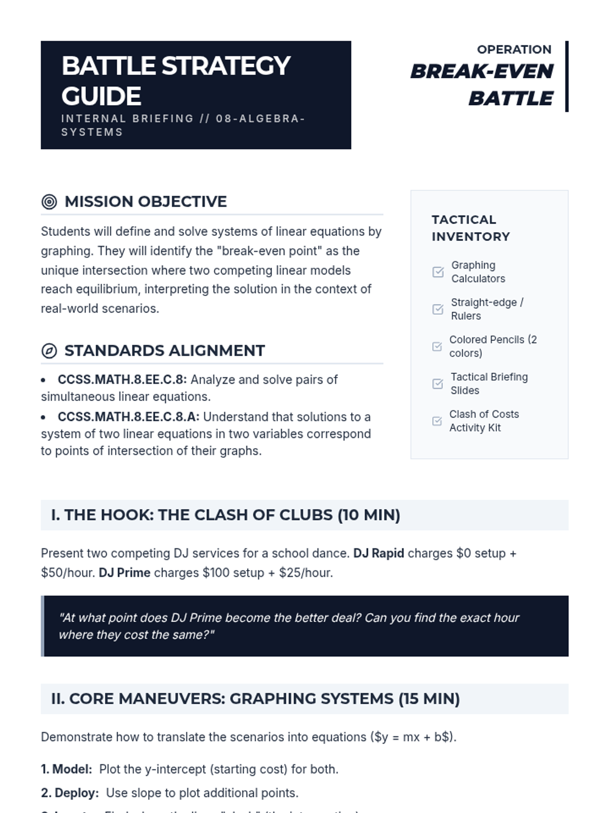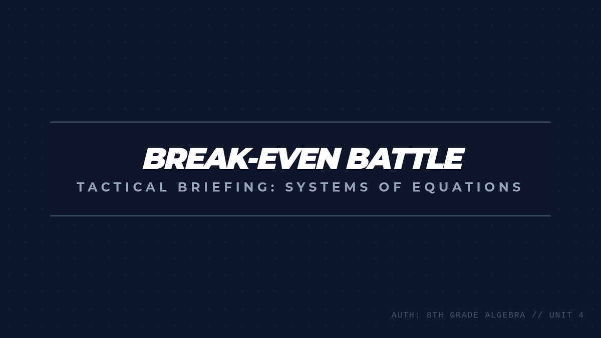 An 8th-grade algebra lesson where students master systems of linear equations by graphing. Through the lens of a 'Break-Even Battle,' students identify the intersection point of two paths to find equilibrium between competing rates of change.