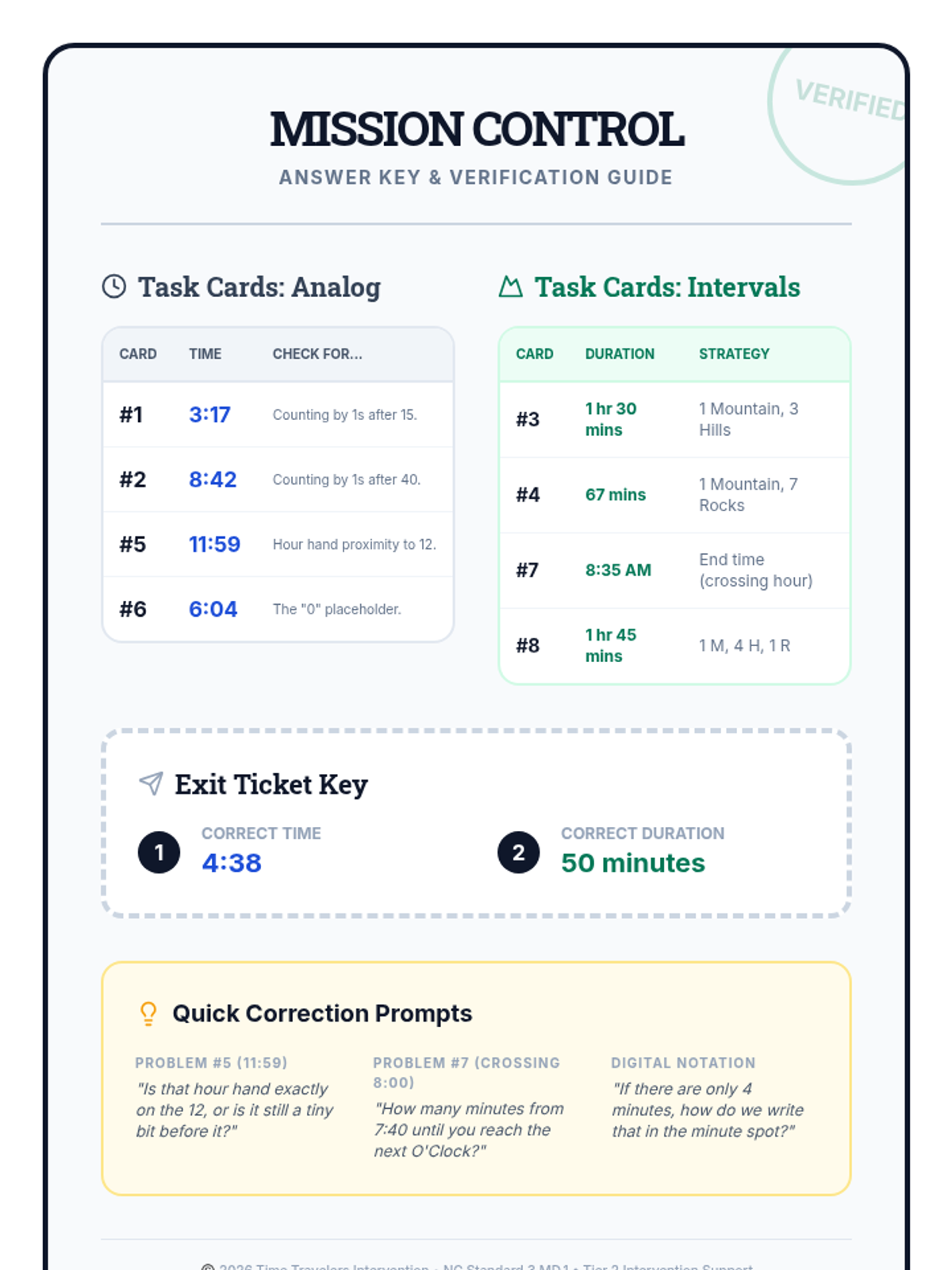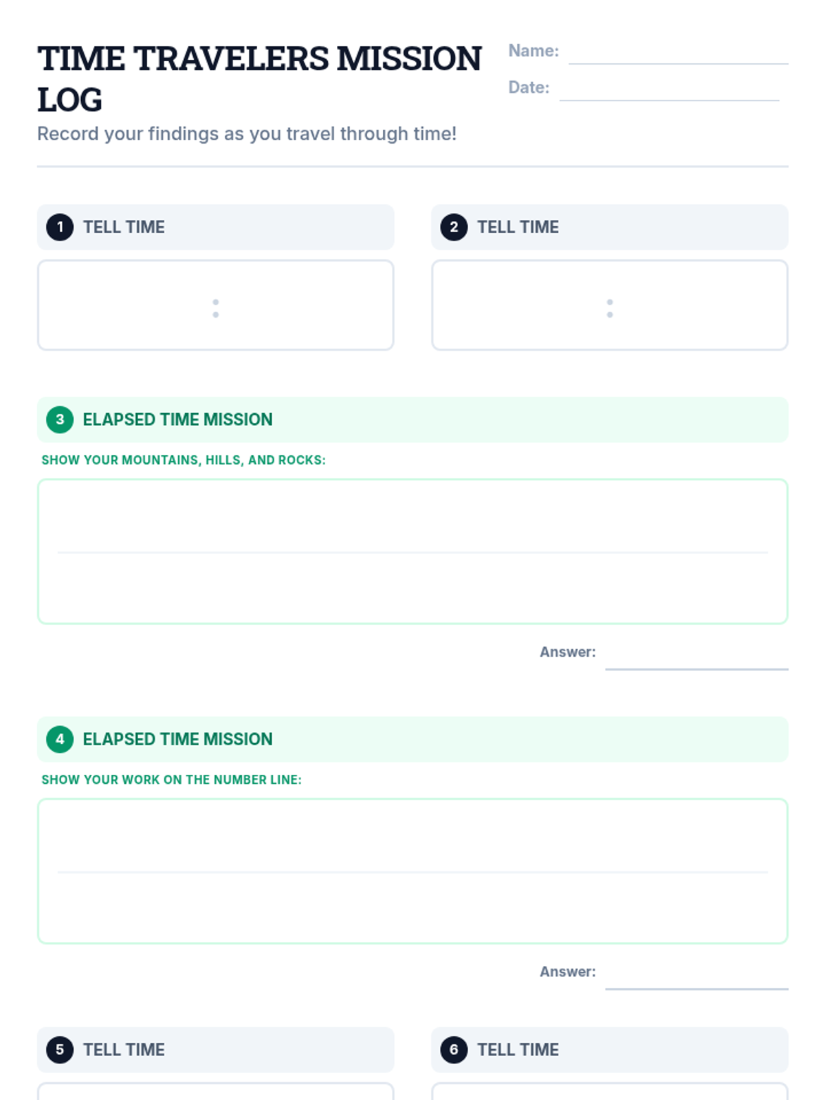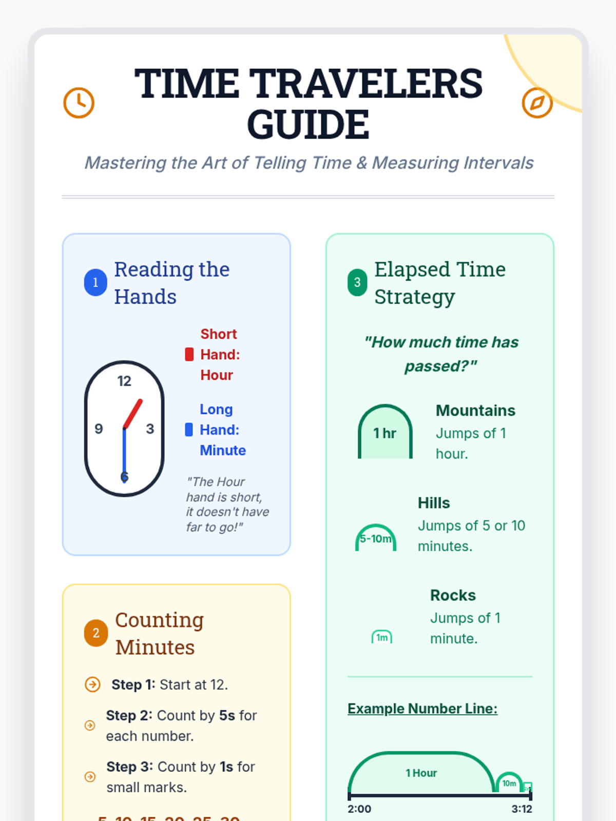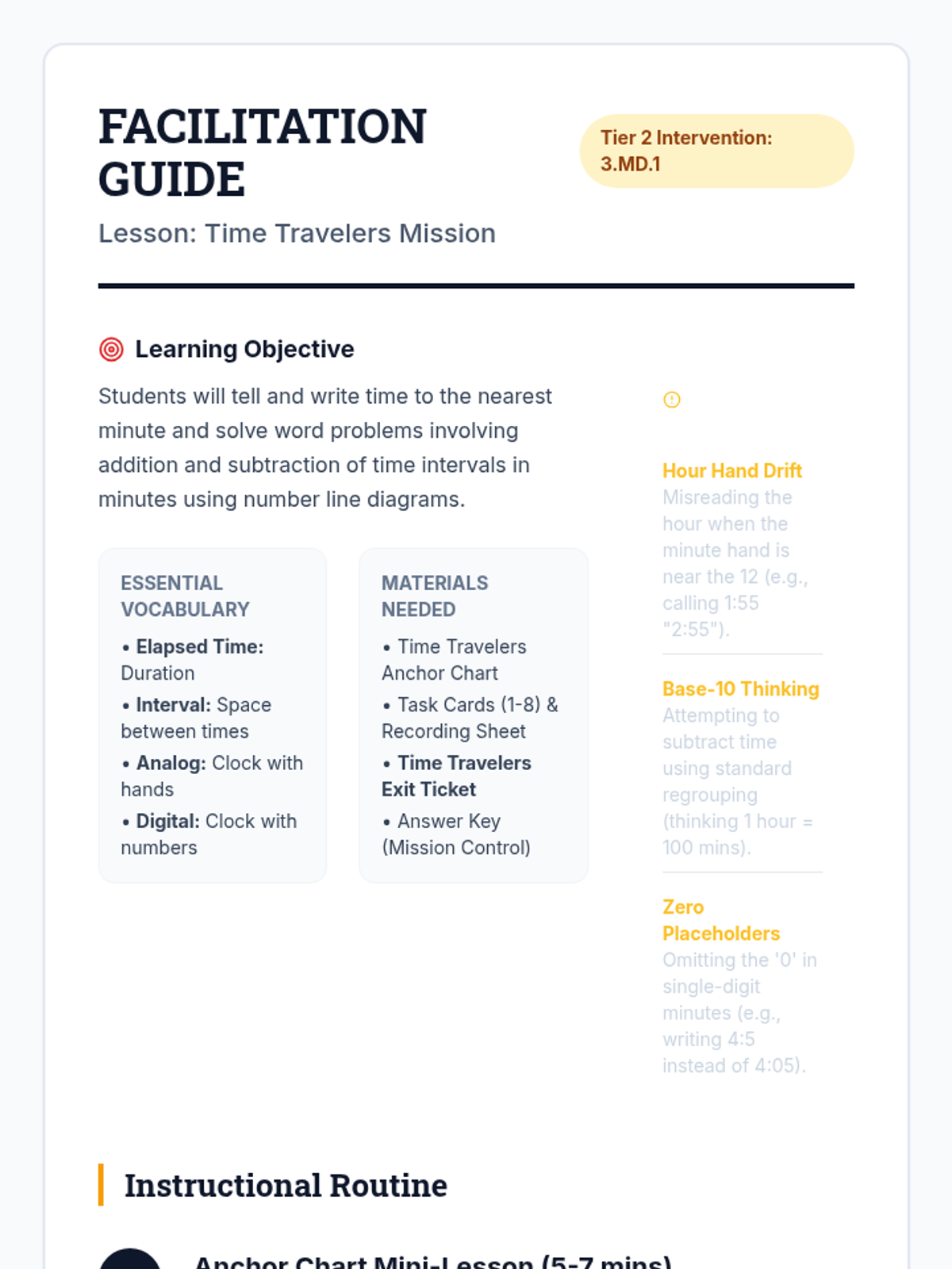 A Tier 2 intervention lesson focusing on telling time to the nearest minute and solving elapsed time word problems using number line strategies. Students will use visual scaffolds to master these essential measurement skills.