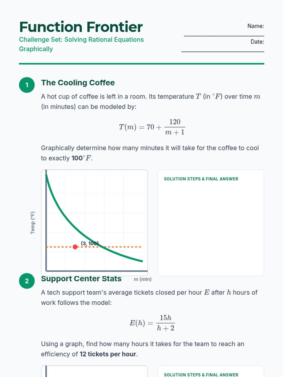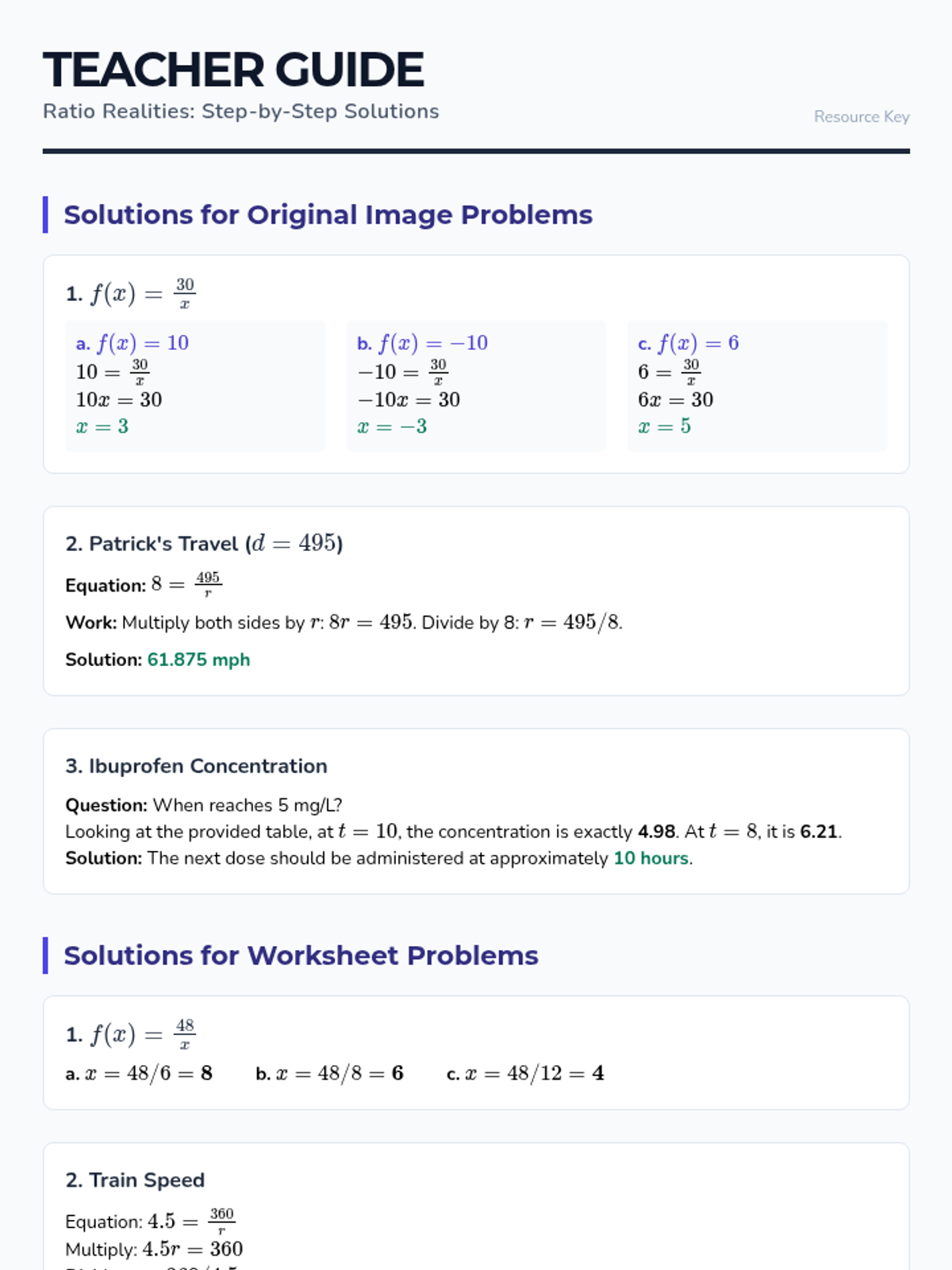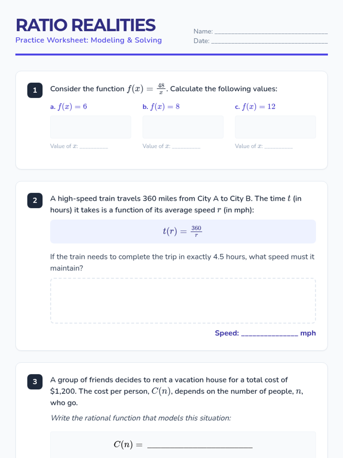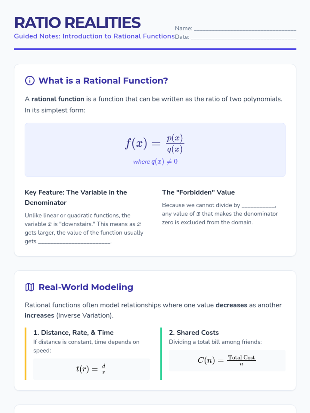 An introduction to rational functions through real-world modeling, evaluating functions, and interpreting graphs and tables. Students will explore how variables change in inverse proportion and apply these concepts to distance, cost, and concentration scenarios.