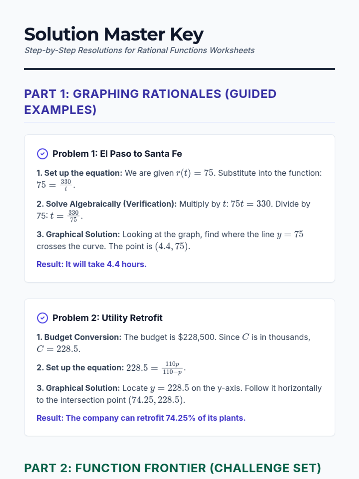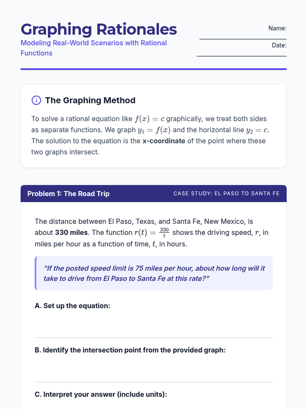 A lesson focused on modeling real-world scenarios using rational functions and solving them through graphing and algebraic techniques. Students analyze distance-speed-time relationships and cost-efficiency models.