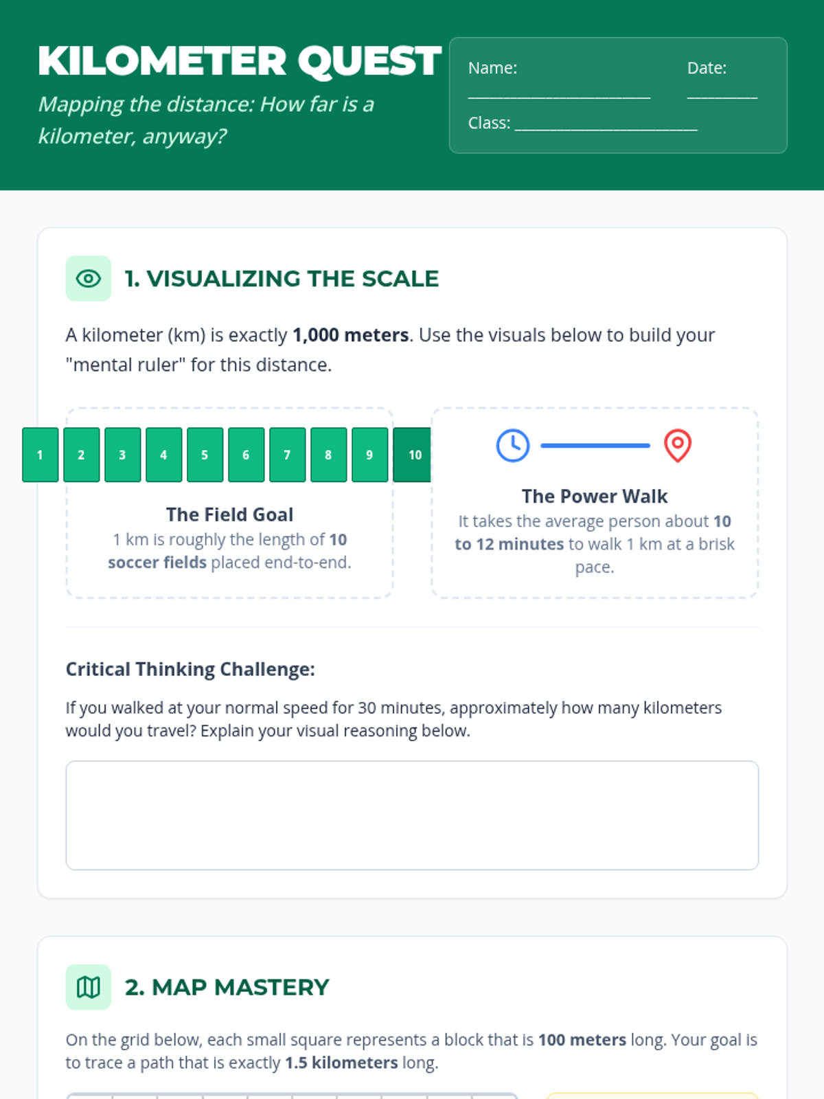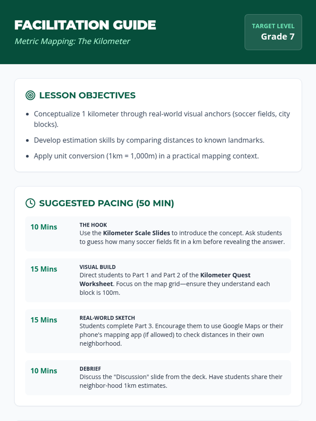 A lesson focused on conceptualizing the kilometer as a unit of measurement through visual comparisons, real-world mapping, and estimation strategies.