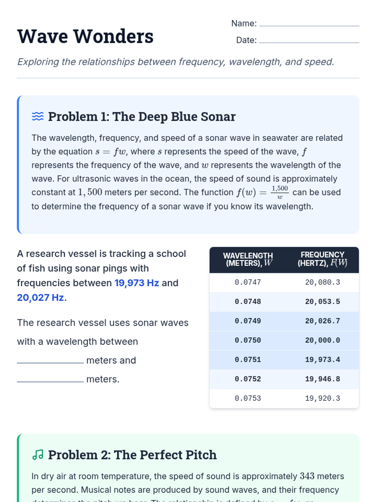 A lesson focused on calculating wave properties (frequency and wavelength) using the constant speed formula in various media.