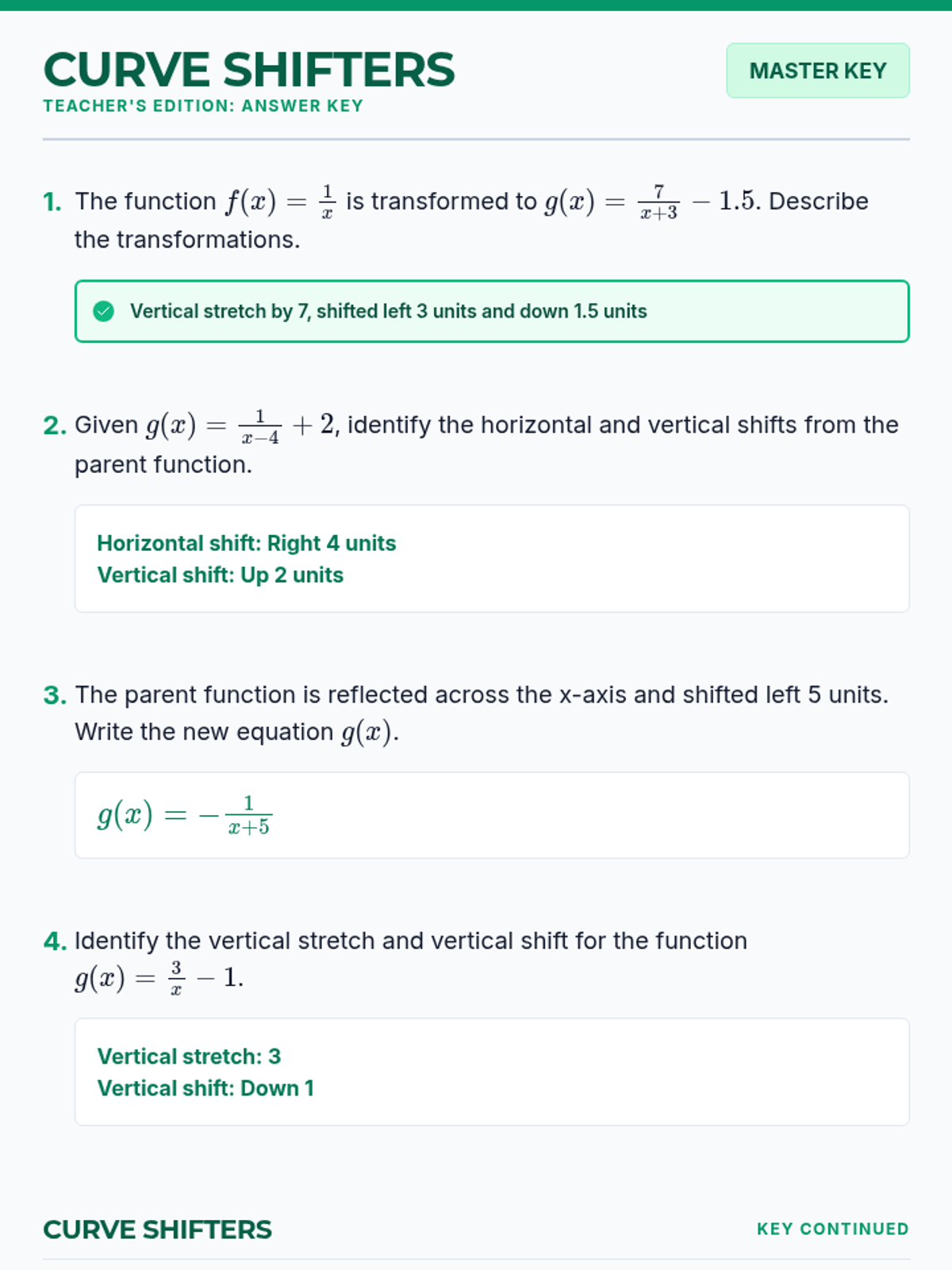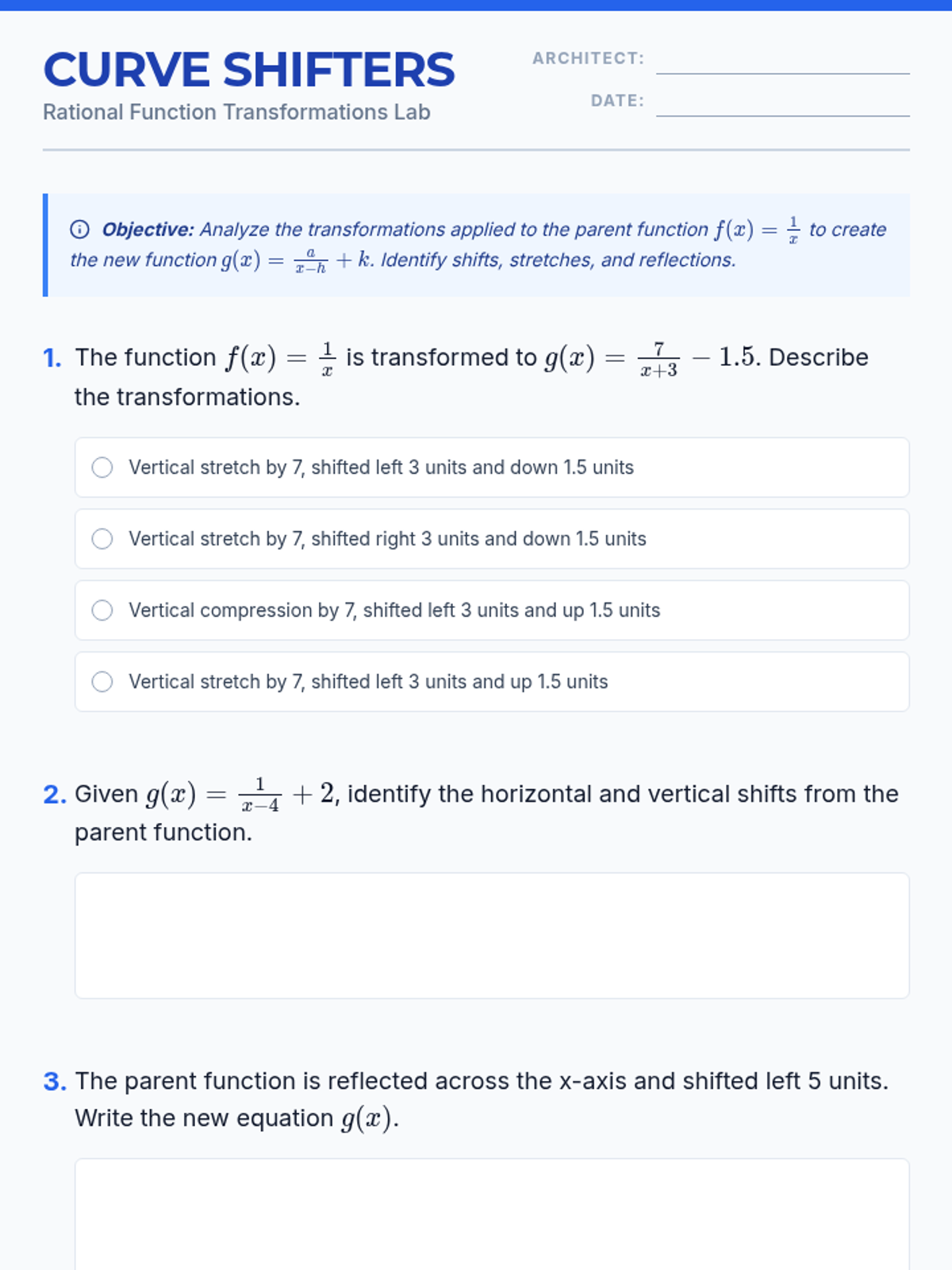 A lesson focused on identifying and applying transformations to the rational parent function f(x) = 1/x. Students will master horizontal and vertical shifts, vertical stretches and compressions, and reflections.