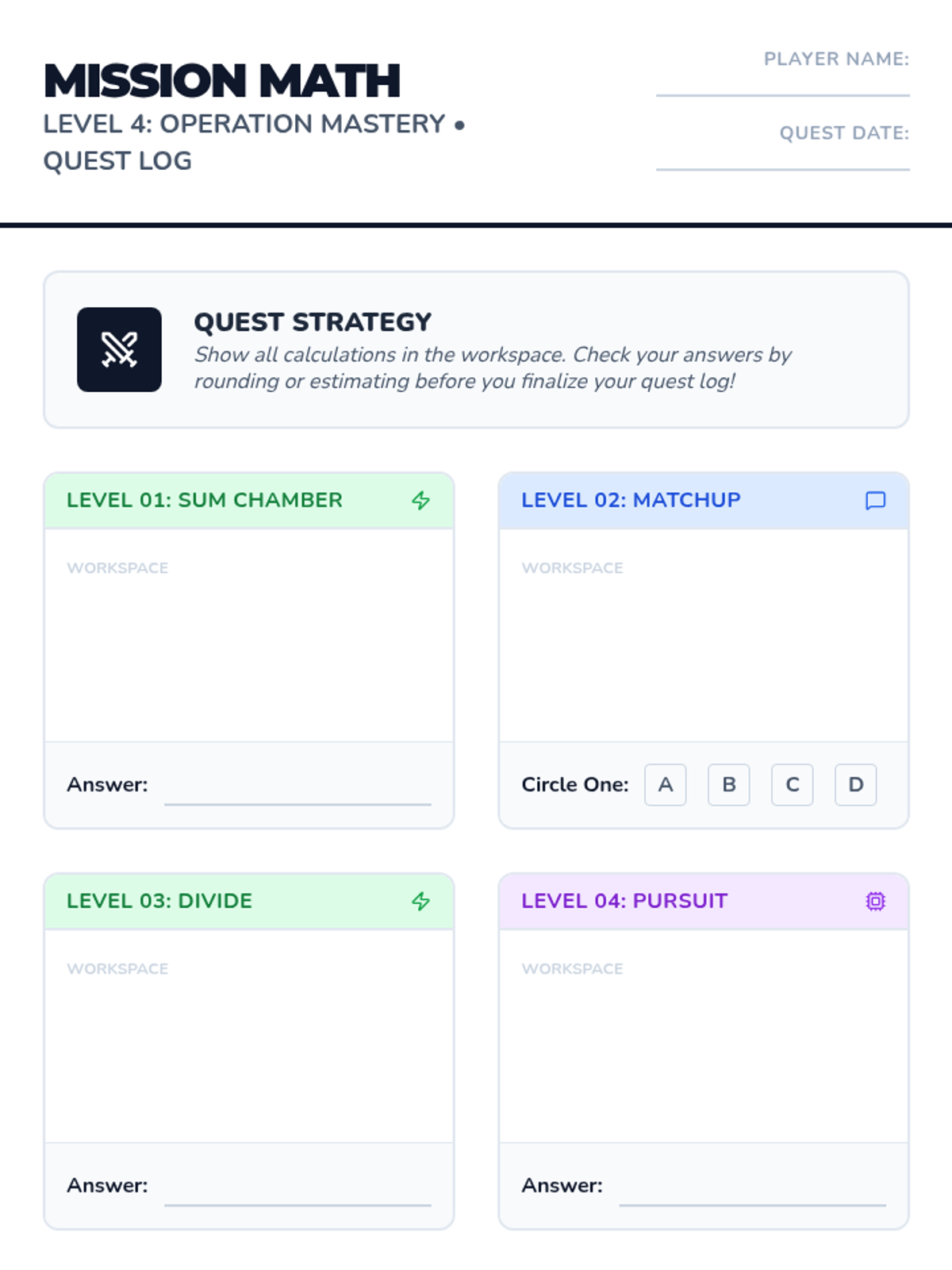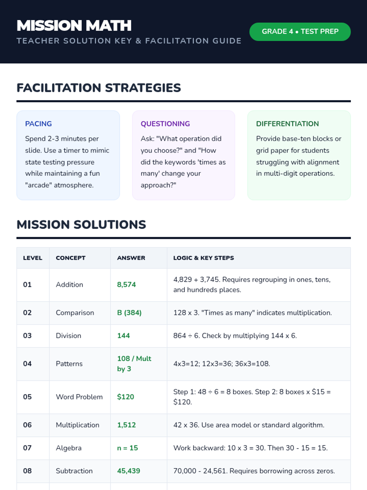 A high-energy, arcade-themed review session covering 4th-grade math operations, word problems, and algebraic thinking to prepare students for state testing.