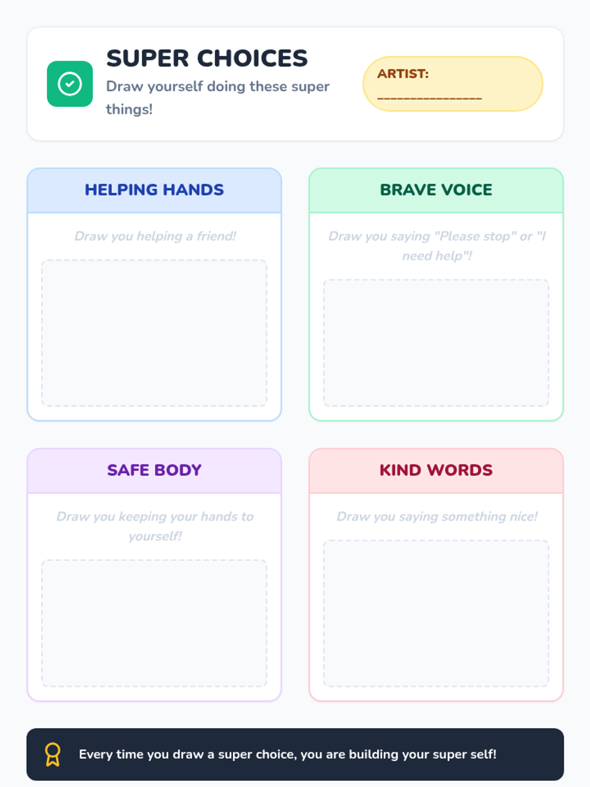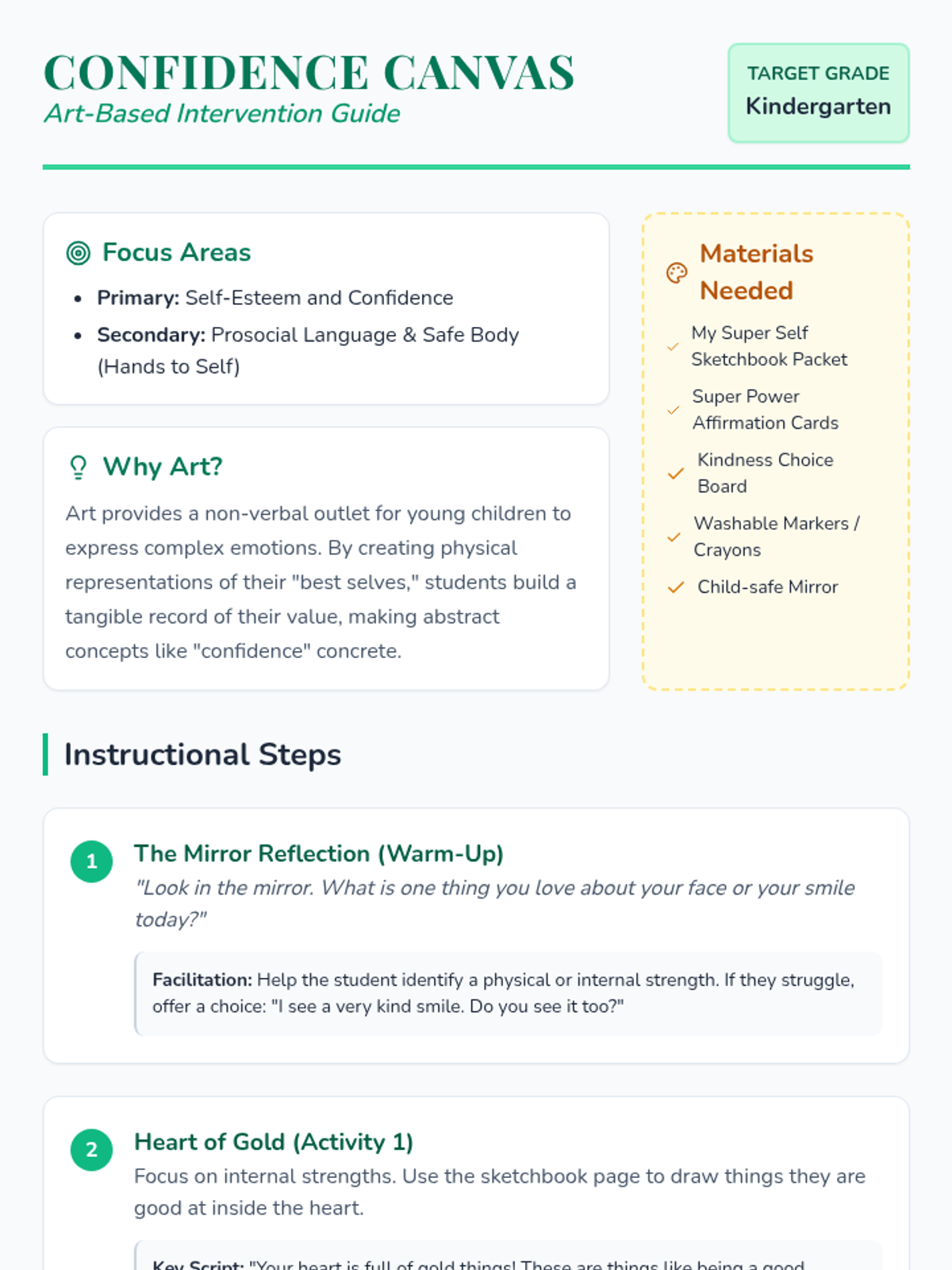 A therapeutic art-based lesson designed to build self-esteem and confidence in kindergarteners through creative expression and positive self-reflection.