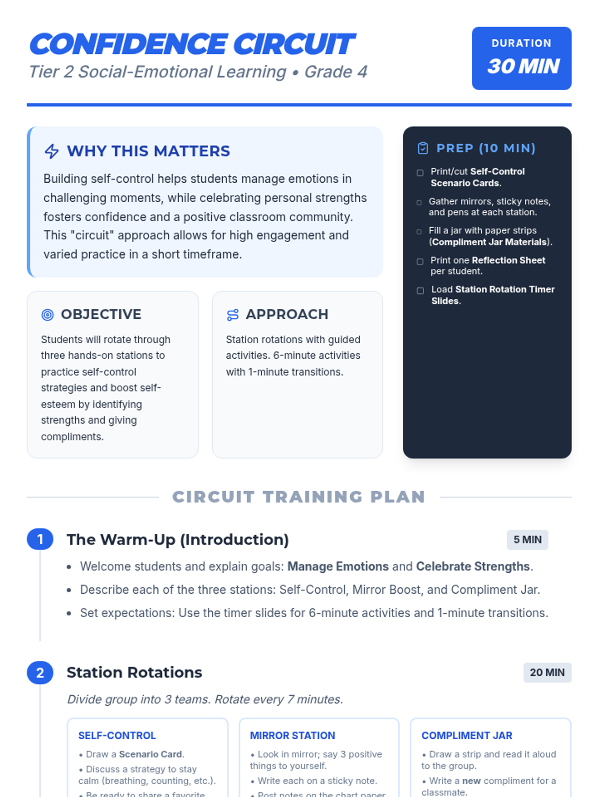 A 30-minute Tier 2 group session for 4th graders focusing on self-control strategies and self-esteem through three interactive station rotations.