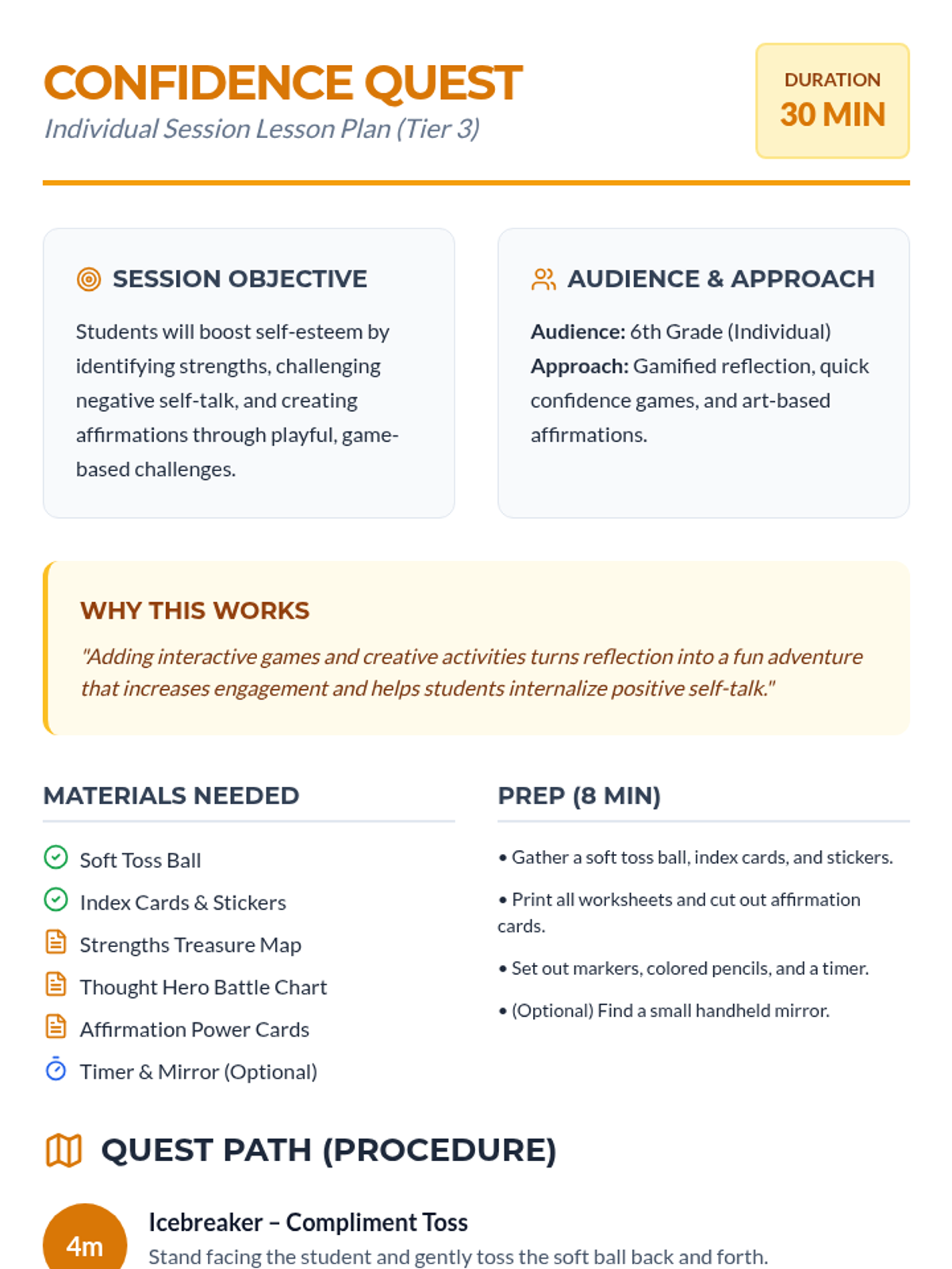 An adventure-themed individual counseling session for 6th graders to boost self-esteem, identify personal strengths, and reframe negative self-talk.