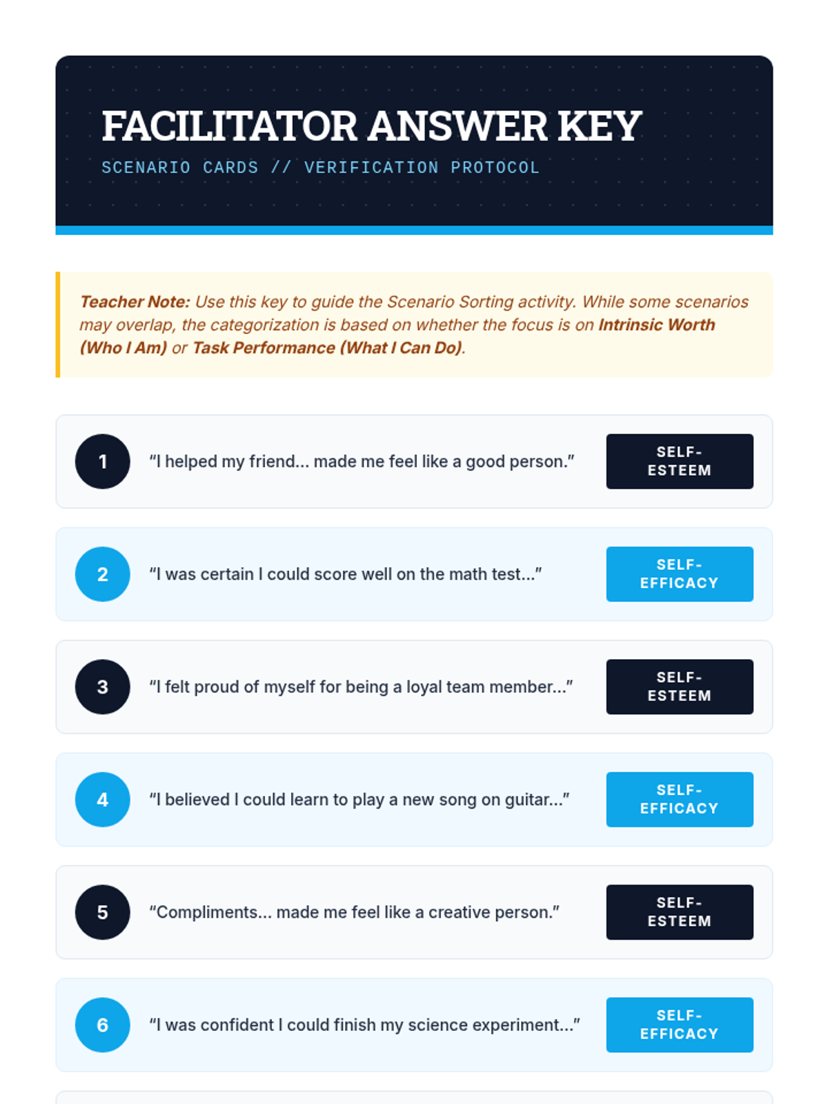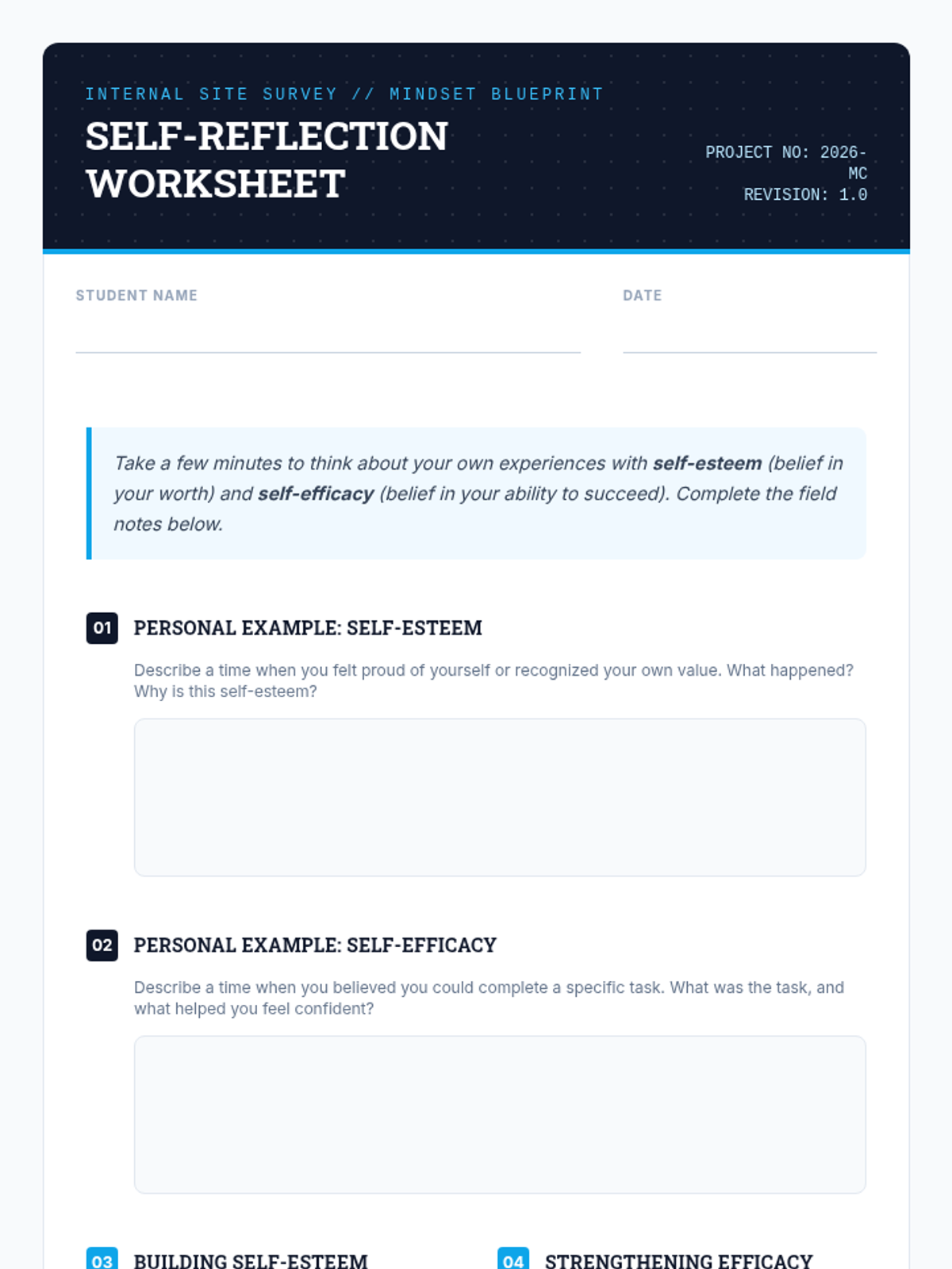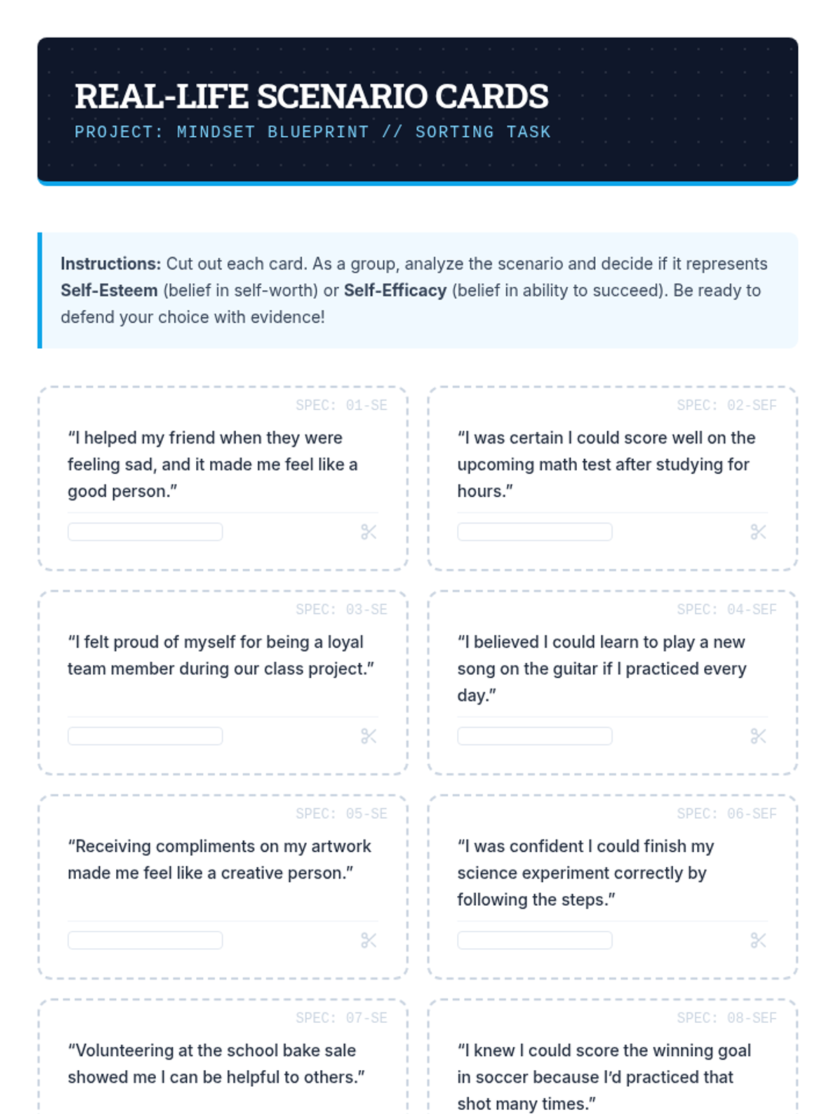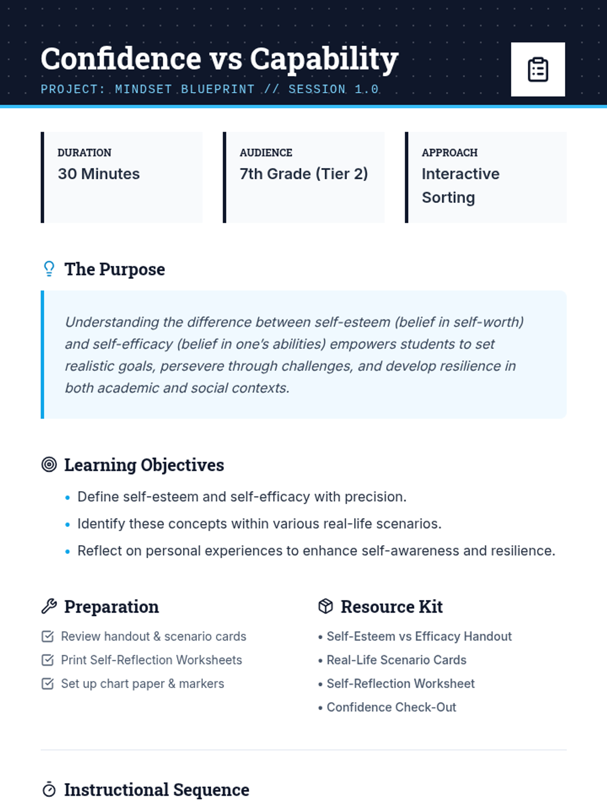 In this 30-minute Tier 2 small-group session, 7th graders will explore the difference between self-esteem and self-efficacy through interactive discussions and activities. Understanding these concepts helps students build a resilient mindset and improve their academic and social skills.