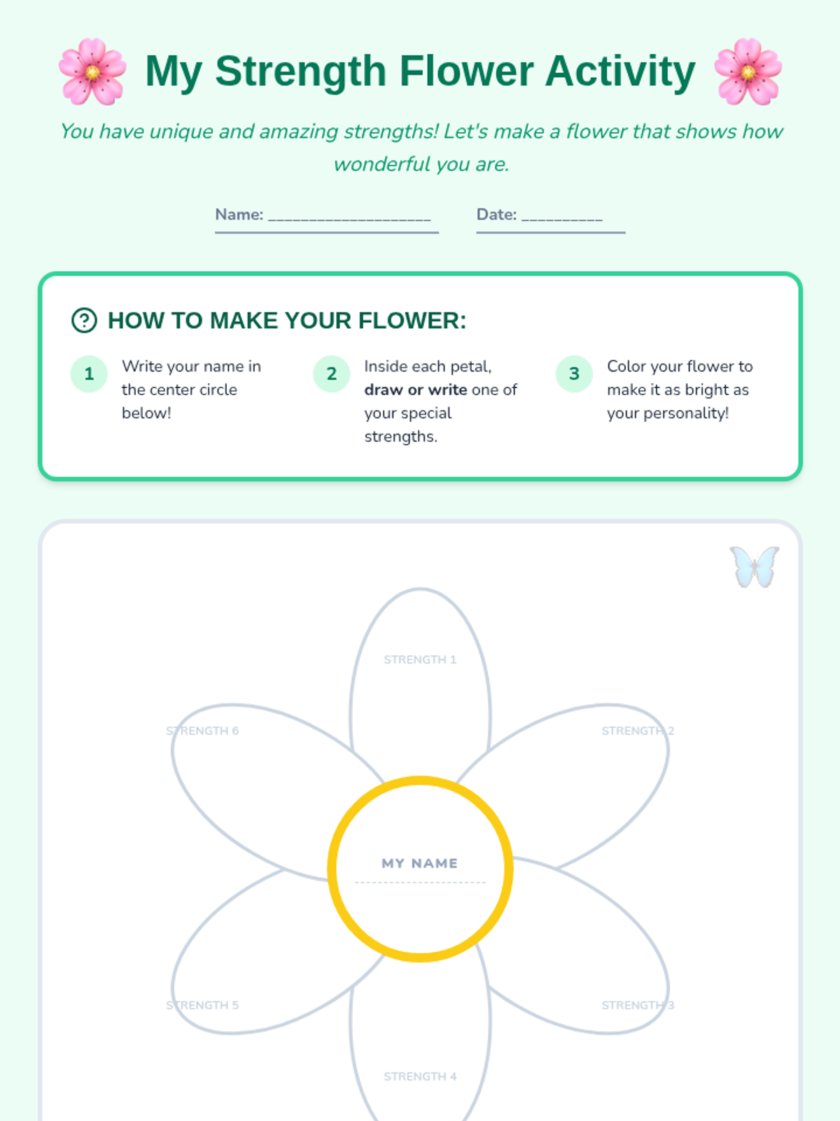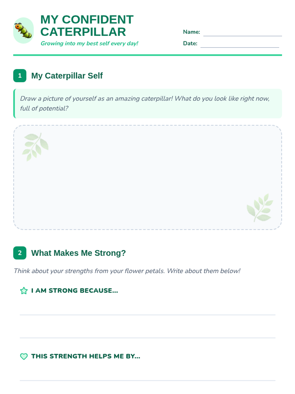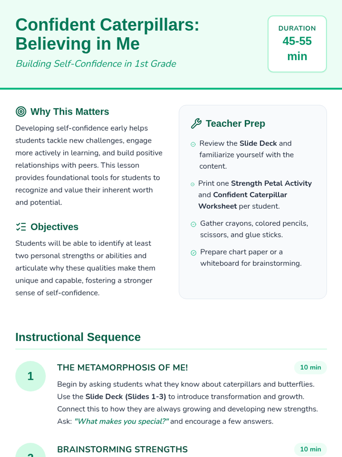An empowering 1st-grade lesson that uses the metaphor of a caterpillar's metamorphosis to help students identify their unique strengths and build self-confidence. Students engage in discussions, a creative flower-building activity, and reflective writing to foster a 'can-do' attitude.