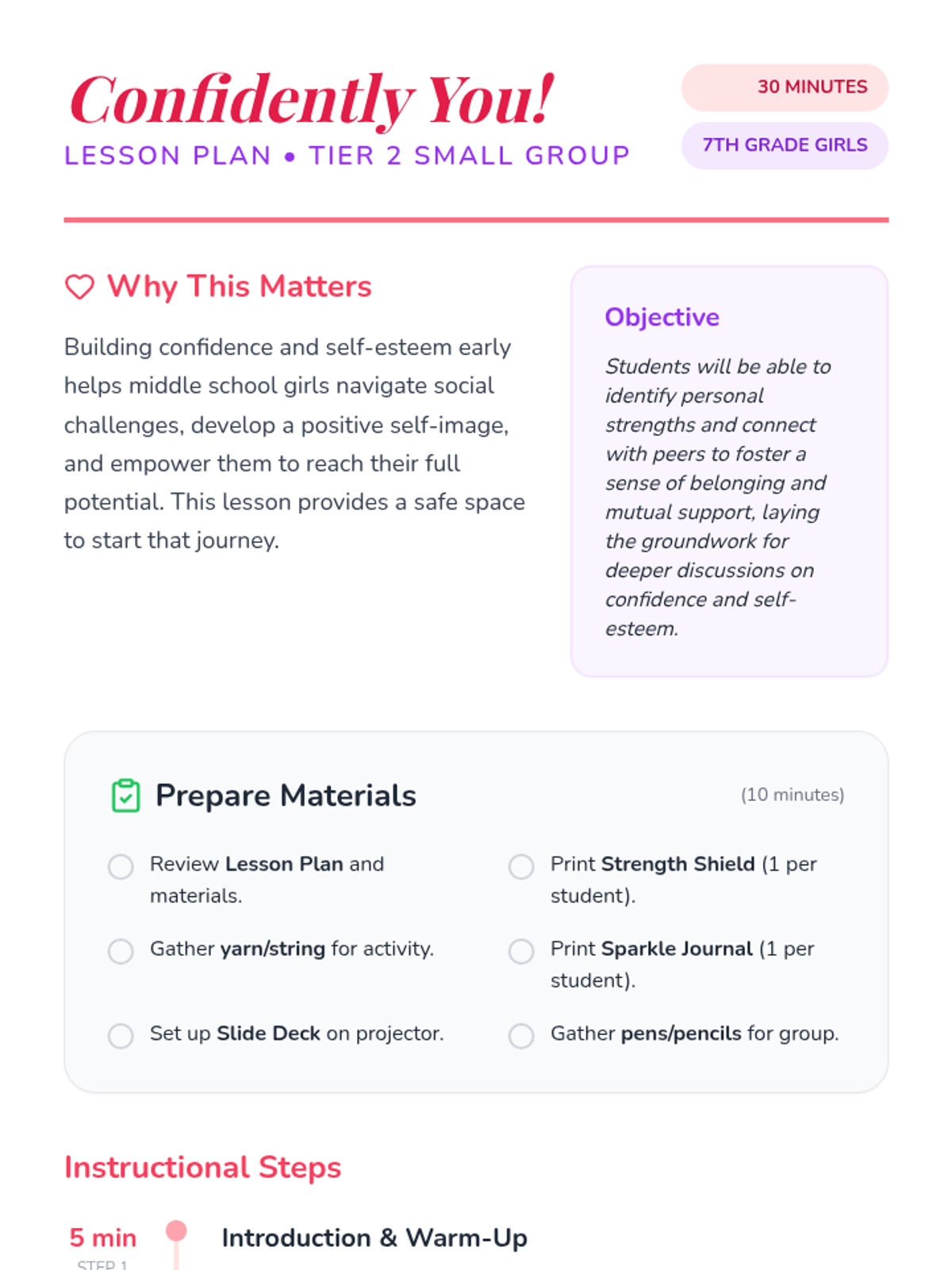 A 30-minute Tier 2 group lesson for 7th-grade girls focused on building confidence and self-esteem through strengths identification and peer connection.