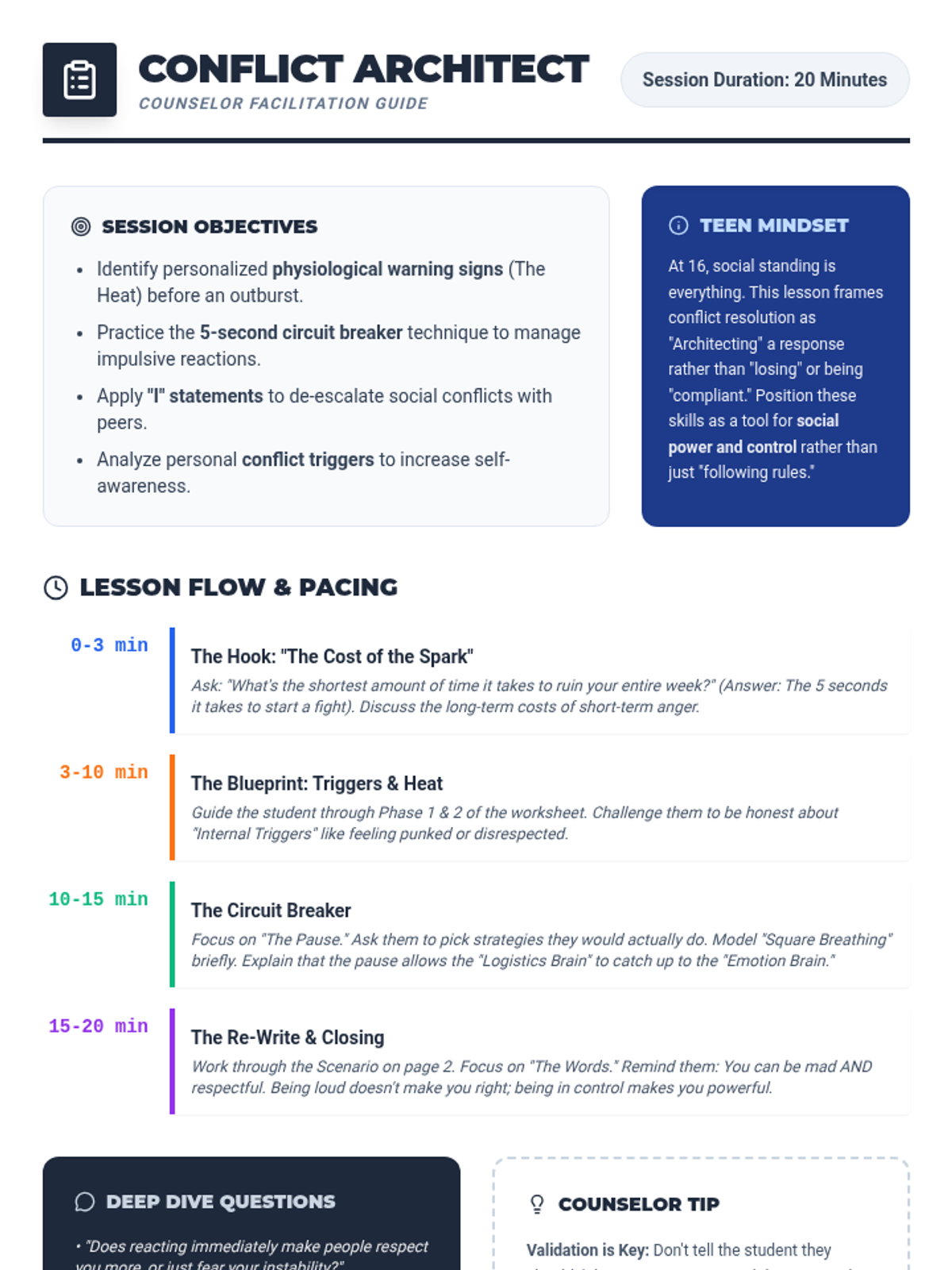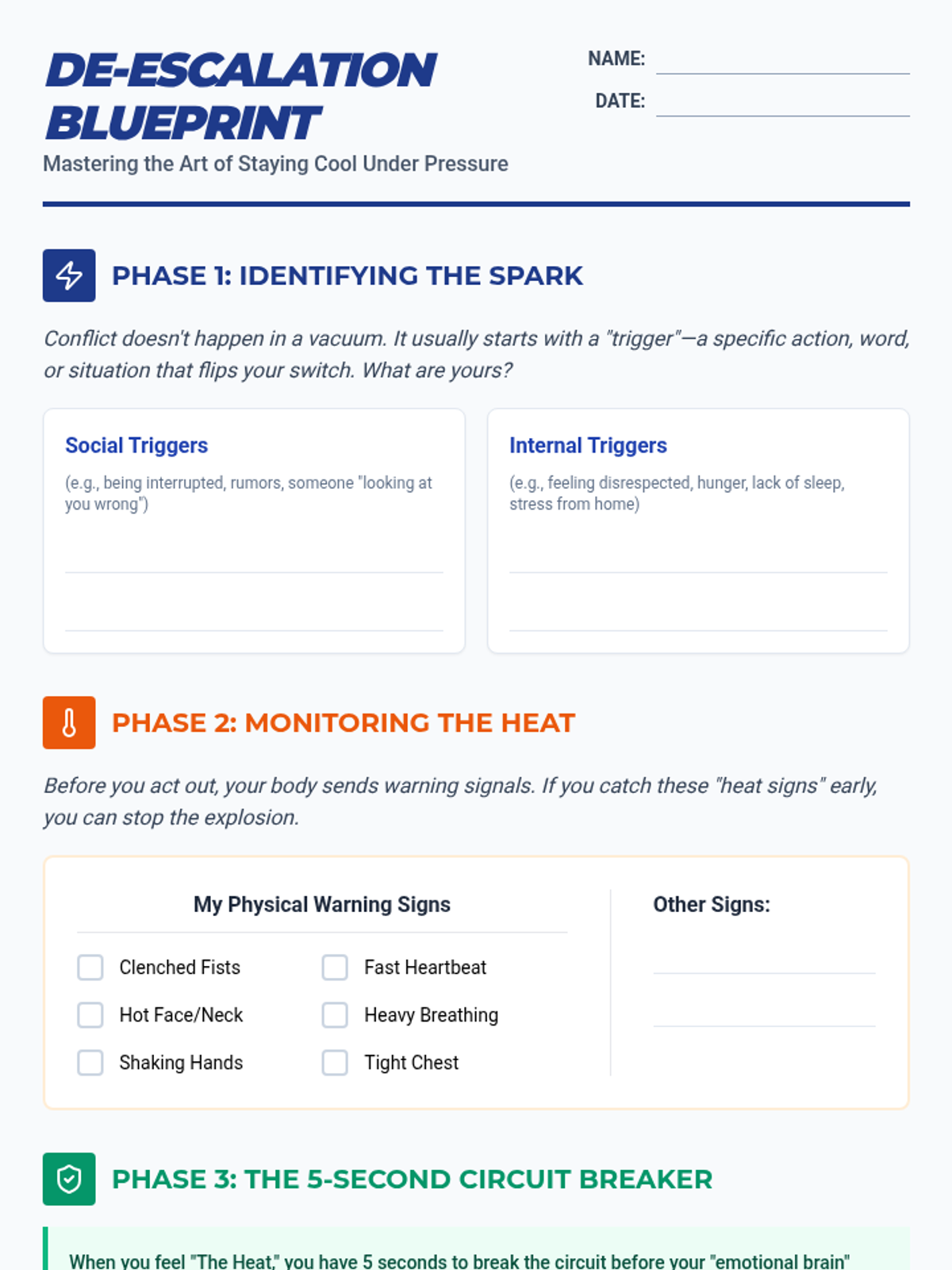 A high-impact counseling lesson designed for teenagers to master conflict resolution and anger management through the 'De-escalation Blueprint' framework.
