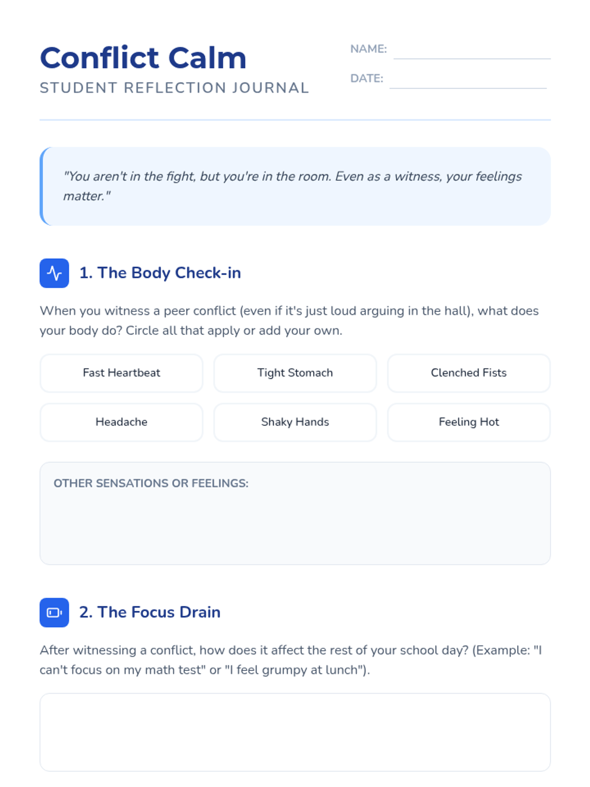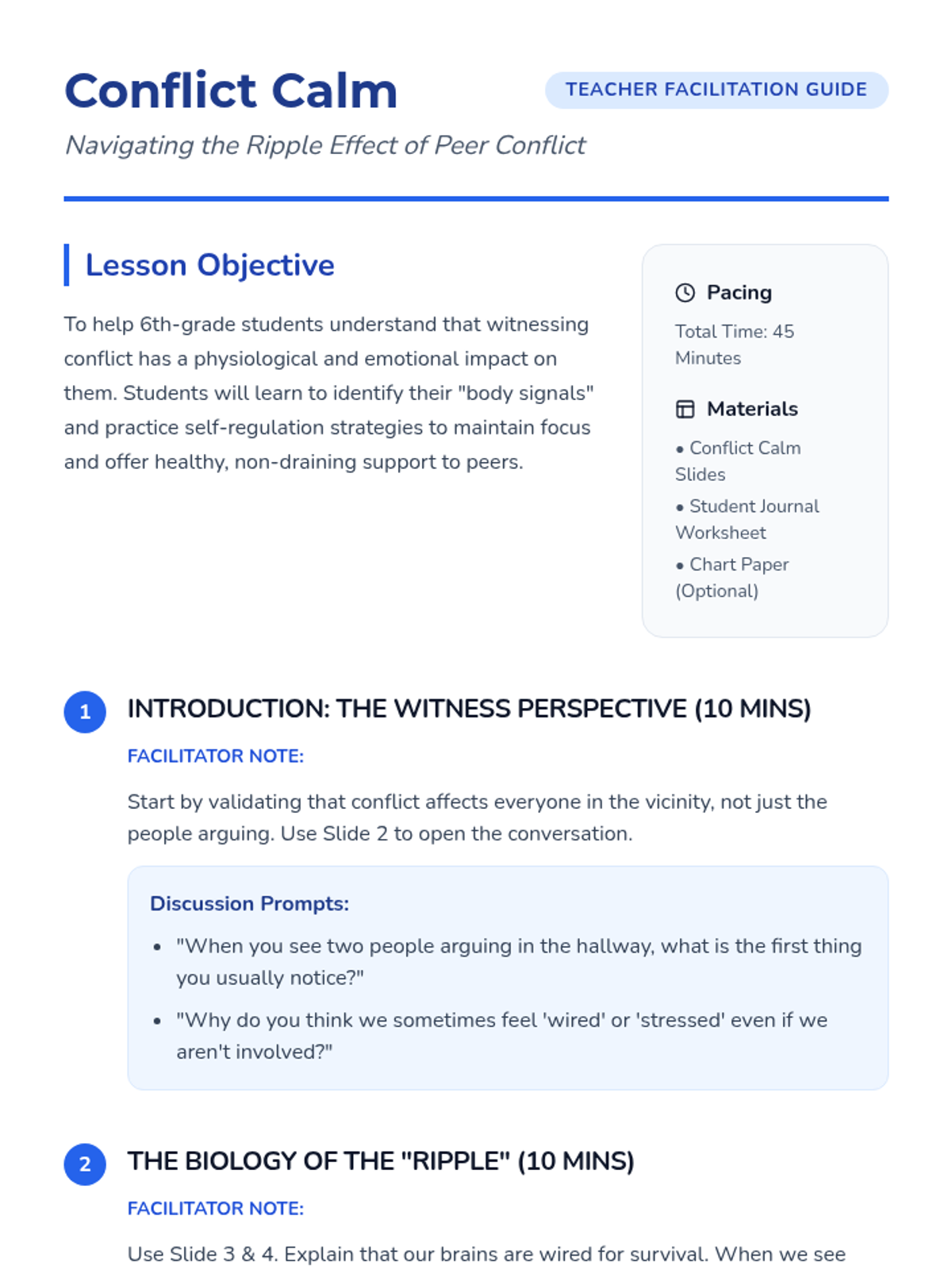 A lesson designed to help 6th-grade students navigate the emotional impact of witnessing peer conflict, focusing on self-regulation and healthy supportive behaviors.