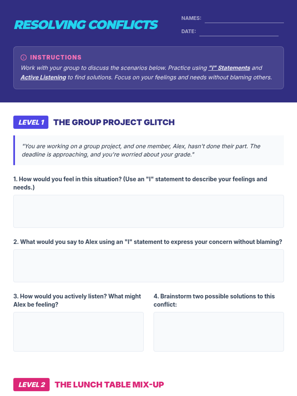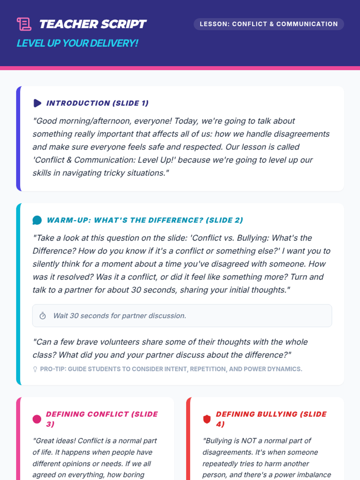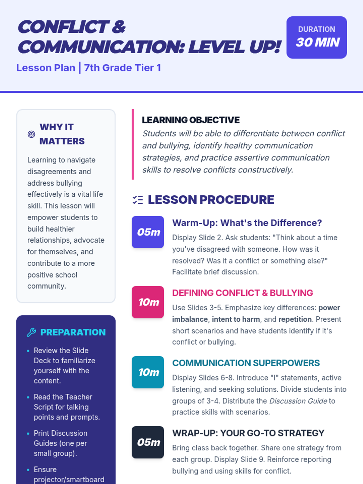 A 30-minute interactive lesson for 7th-graders to distinguish between conflict and bullying while mastering assertive communication 'superpowers'. Students practice 'I' statements and active listening through scenario analysis.