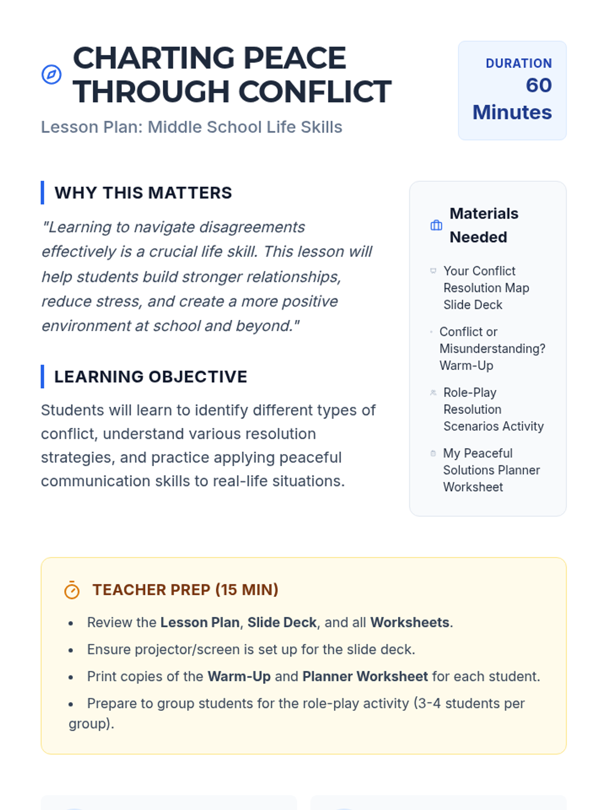 This lesson guides students through navigating disagreements and finding peaceful resolutions. It empowers them with essential communication and problem-solving skills for both school and life.