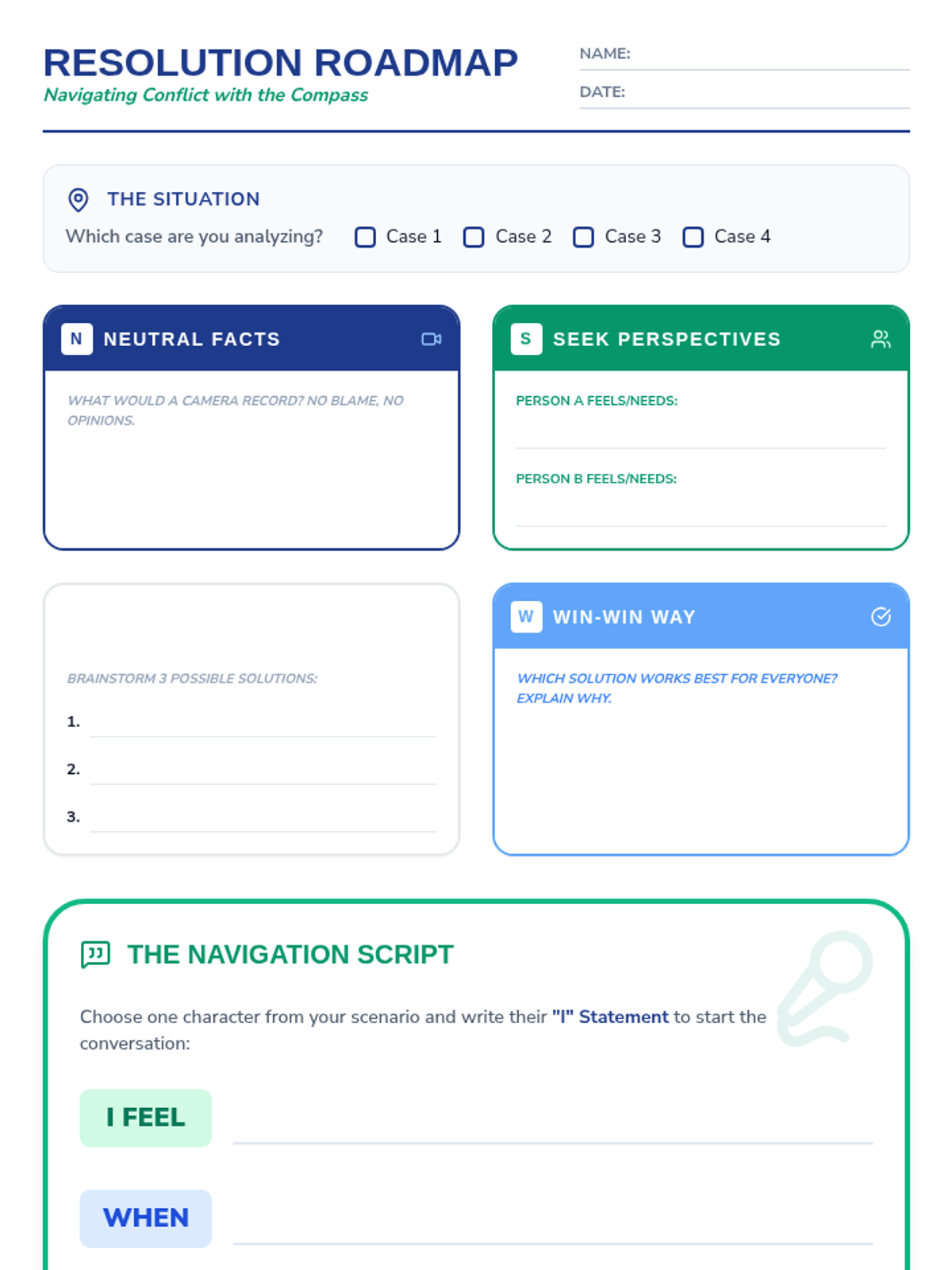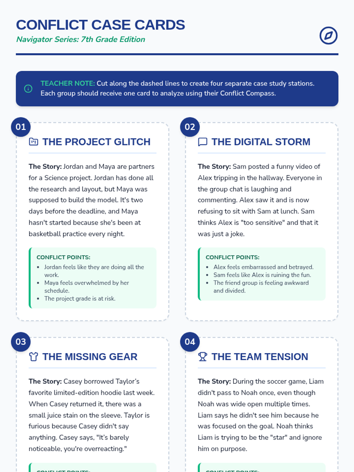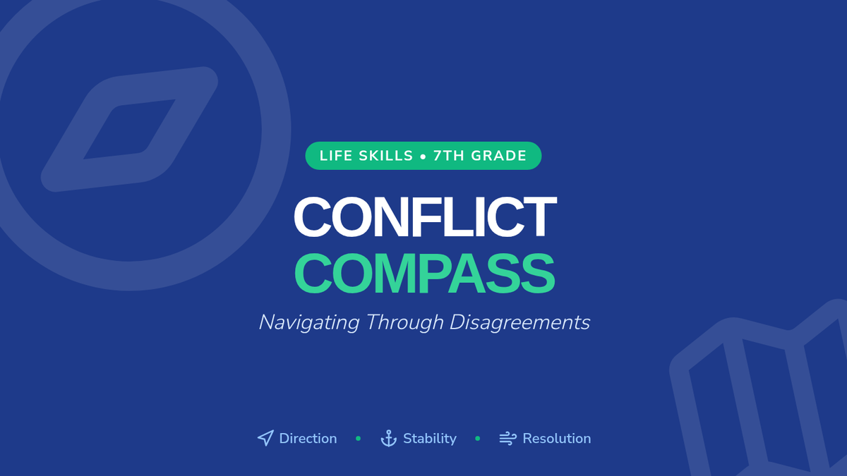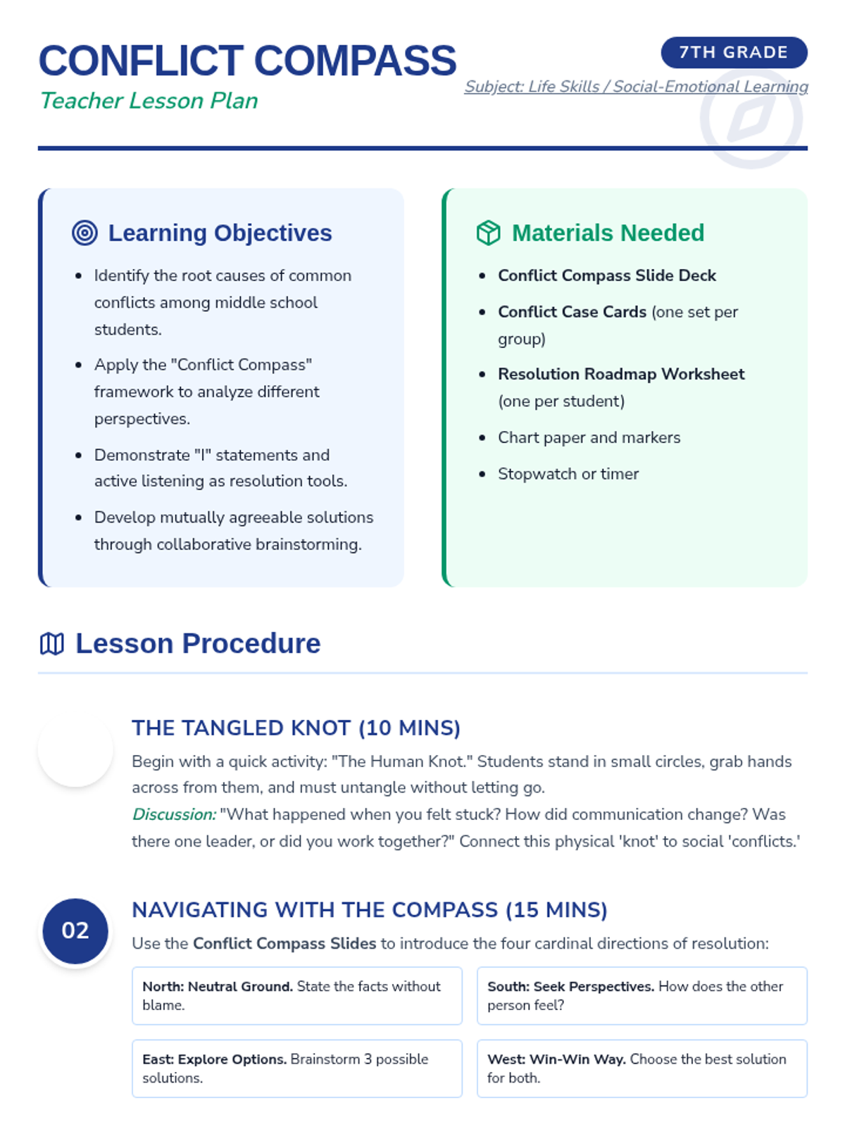A comprehensive 7th-grade lesson on conflict resolution, utilizing a 'navigation' framework to help students identify core issues, understand perspectives, and reach mutually agreeable solutions through case studies and practical techniques.