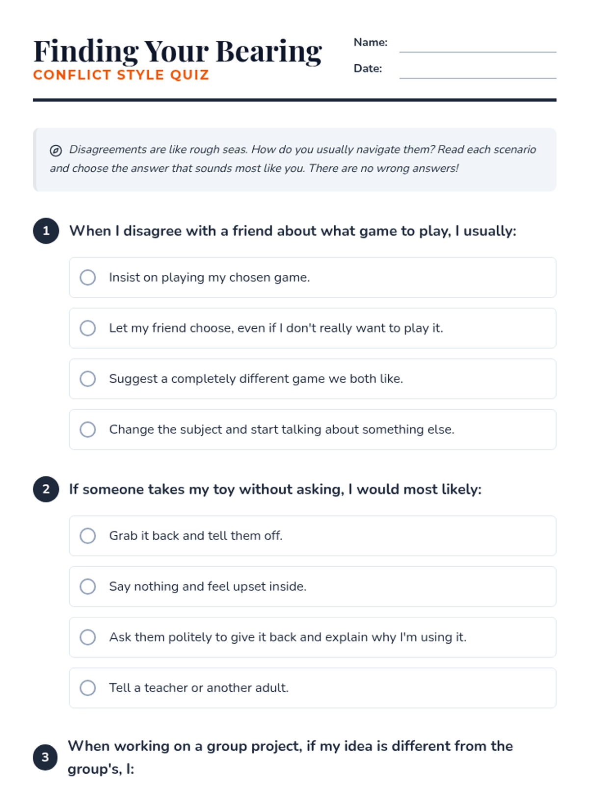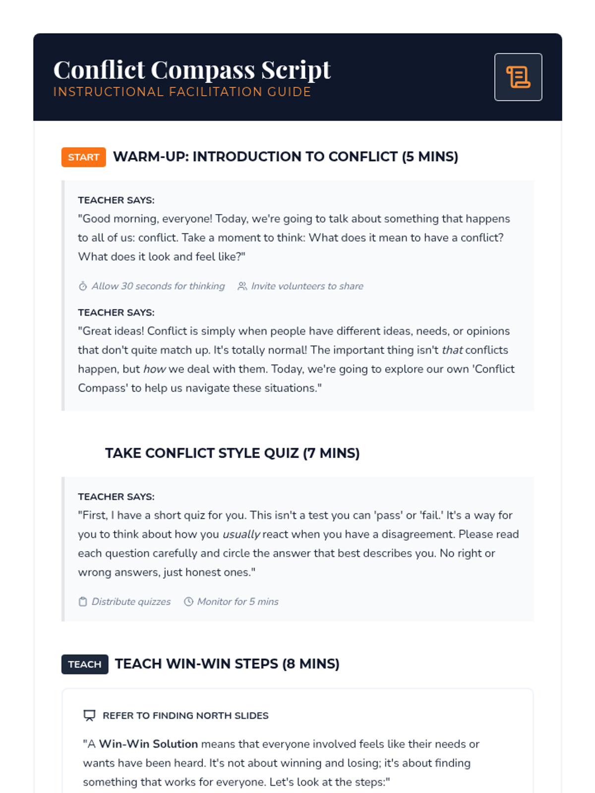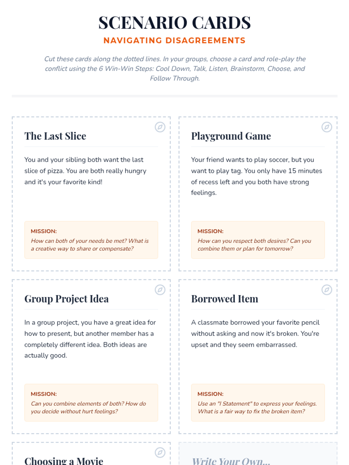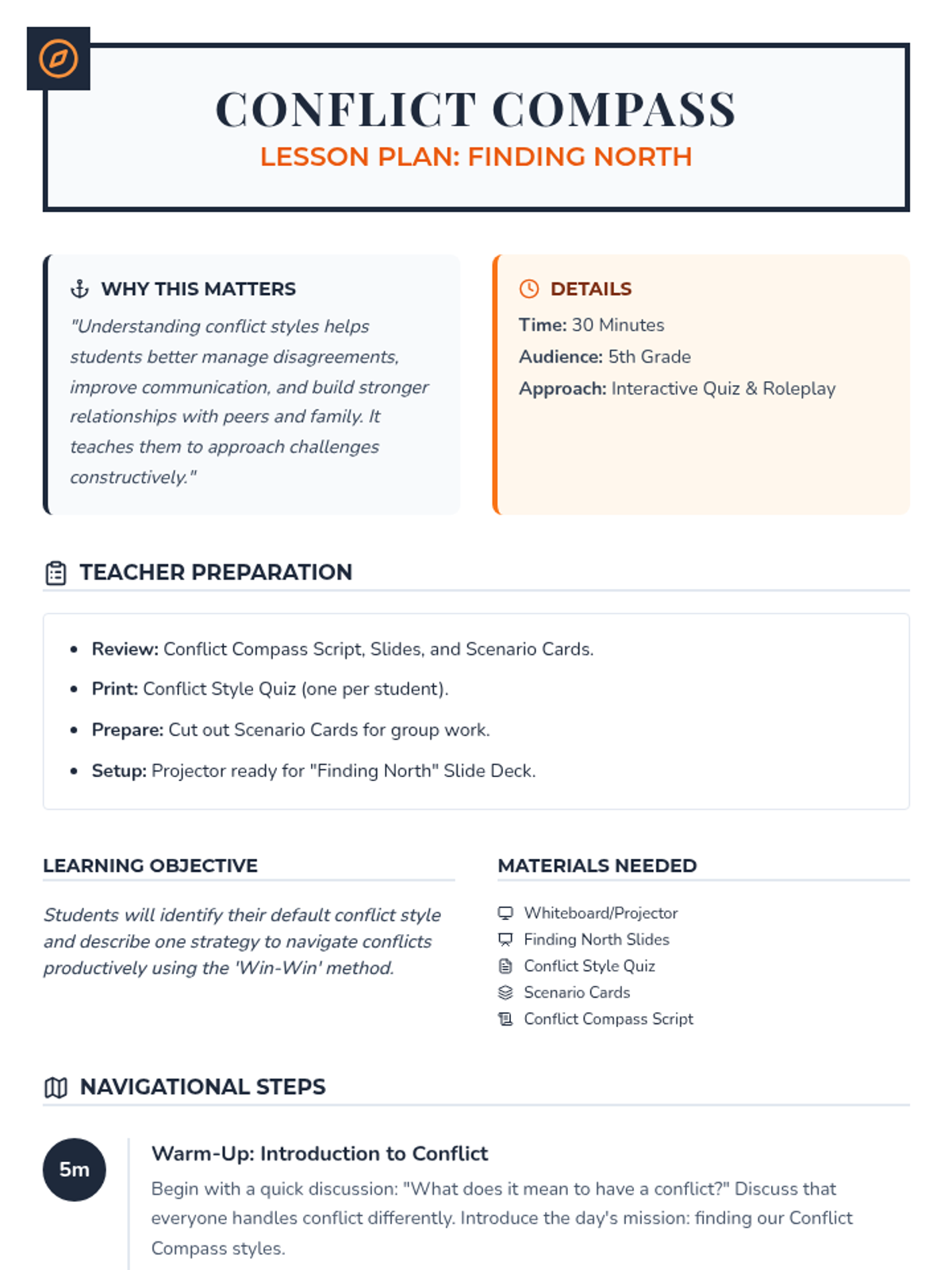 A 30-minute lesson for 5th graders to identify their conflict styles and learn the 'win-win' approach to resolution. Students use a 'Conflict Compass' theme to navigate disagreements effectively.