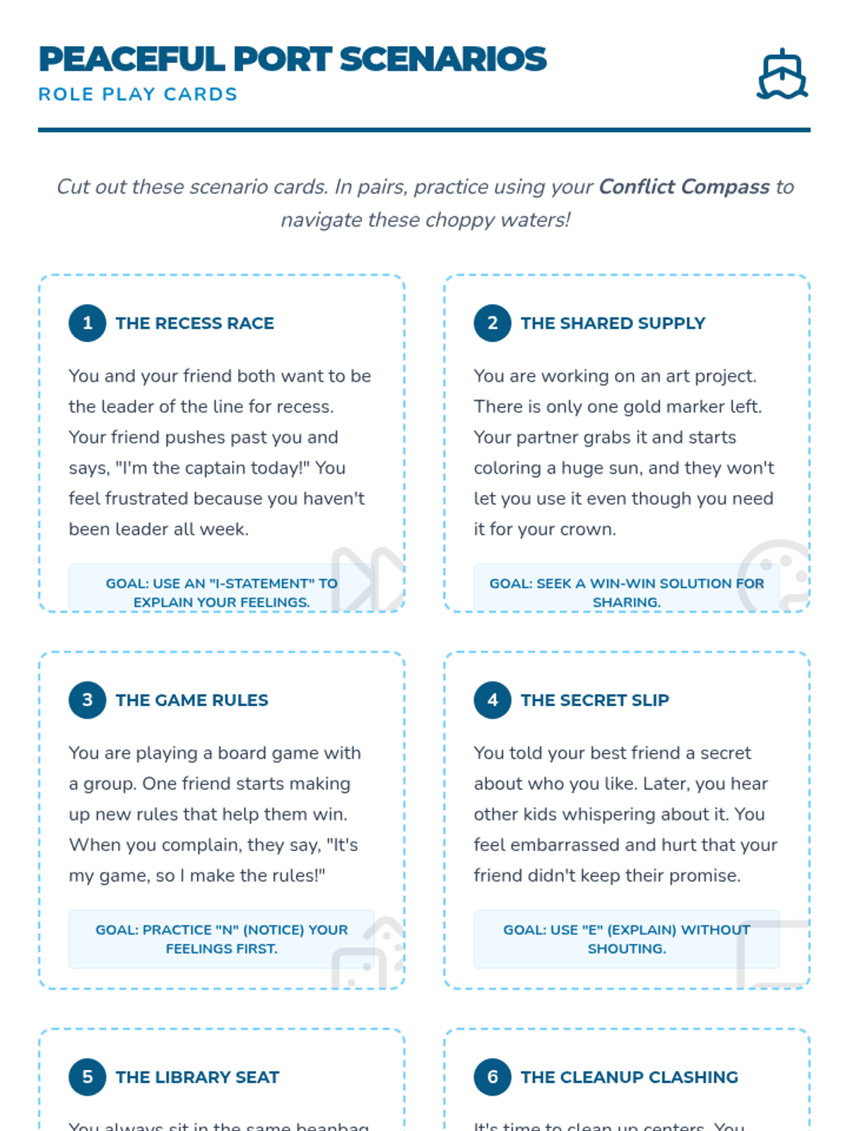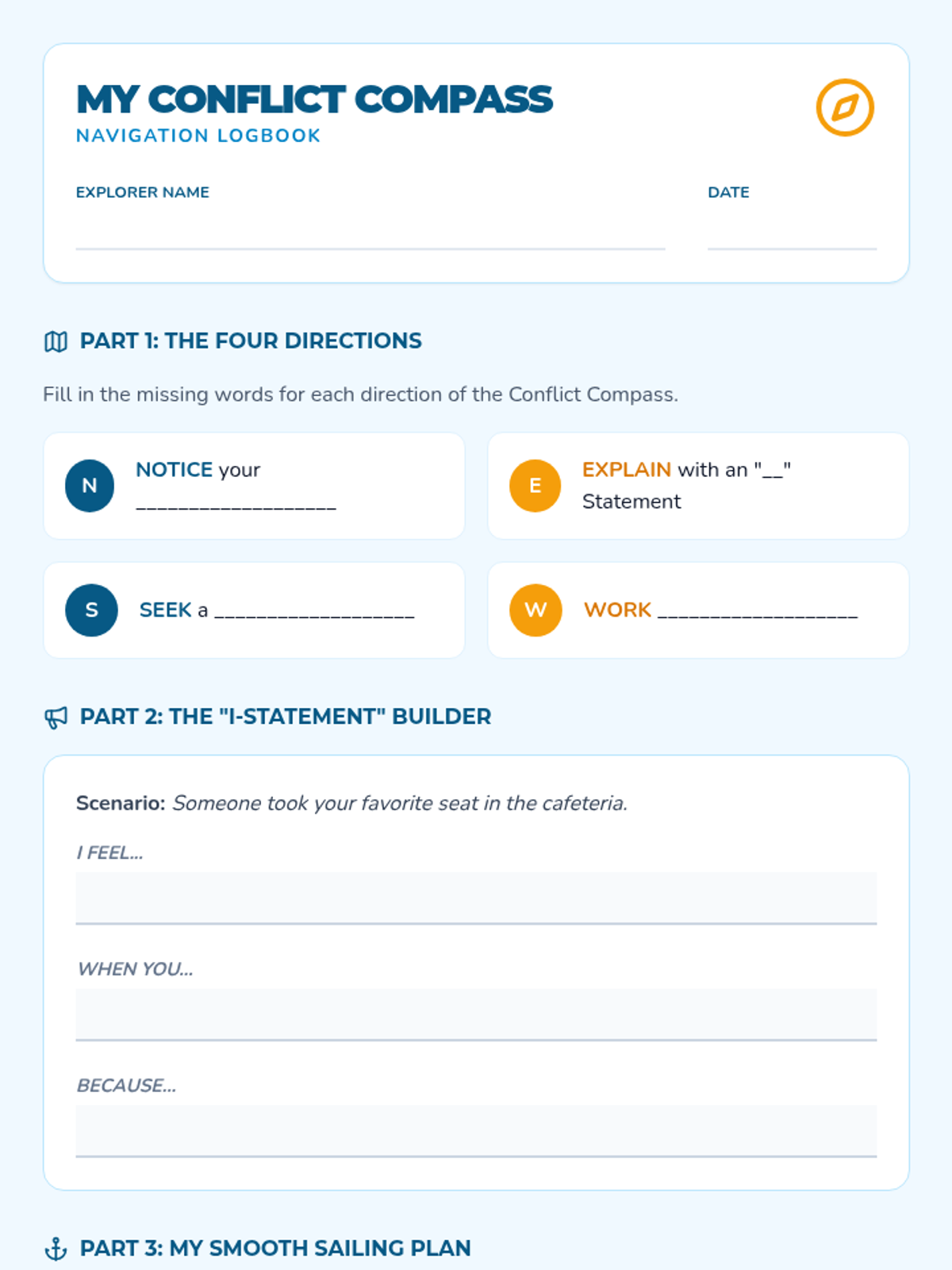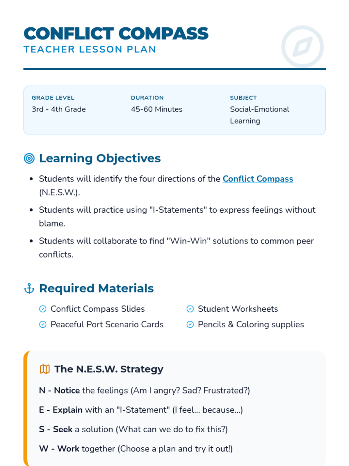 A comprehensive social-emotional learning lesson for grades 3-4 that teaches students how to navigate peer disagreements using a 'Conflict Compass' strategy, focusing on 'I-statements' and collaborative problem-solving.