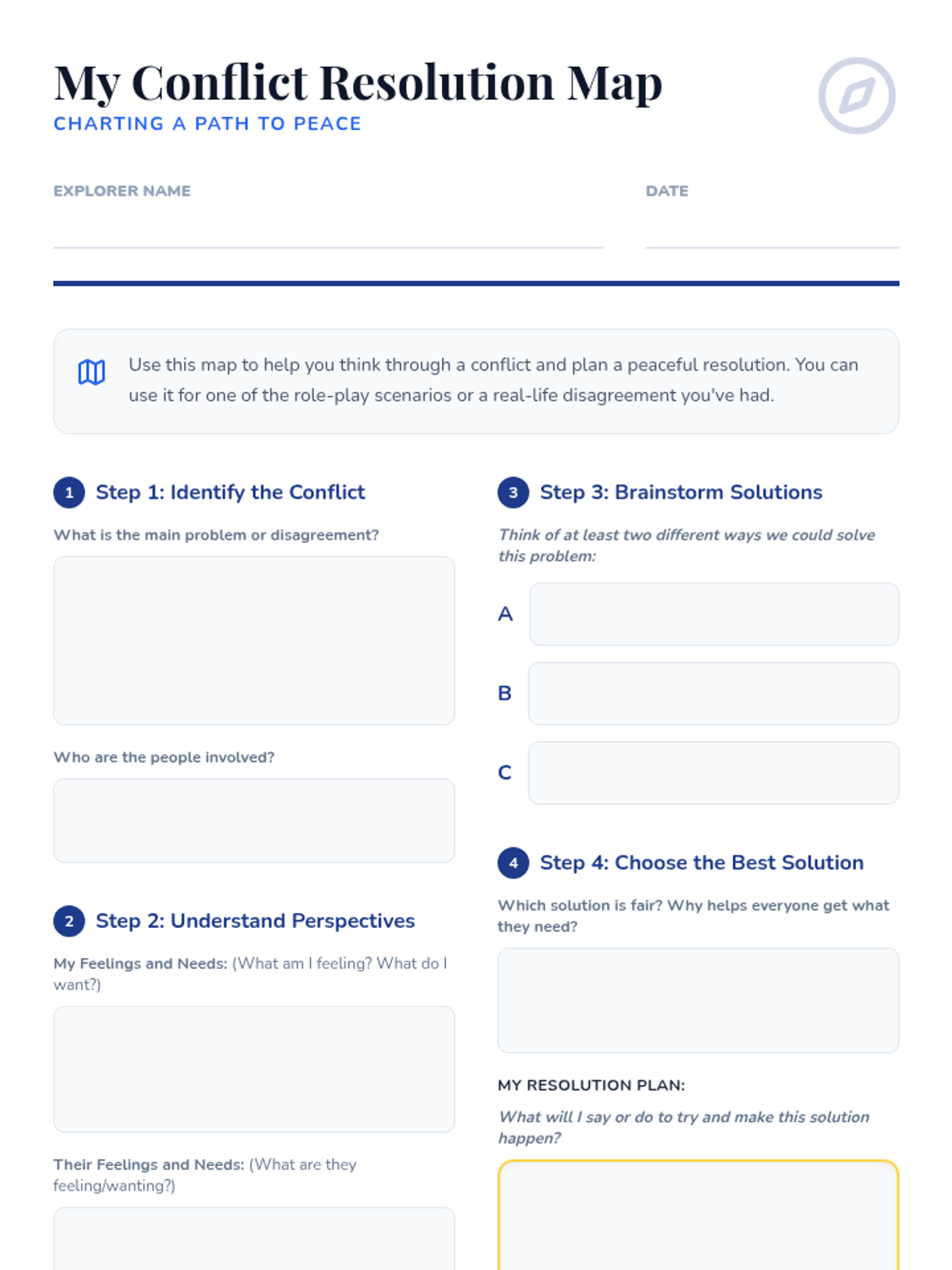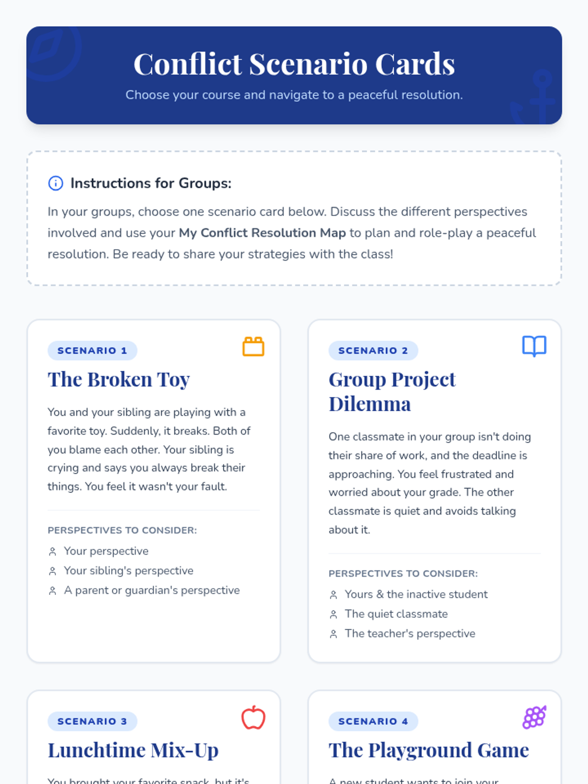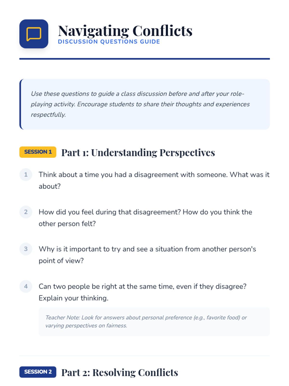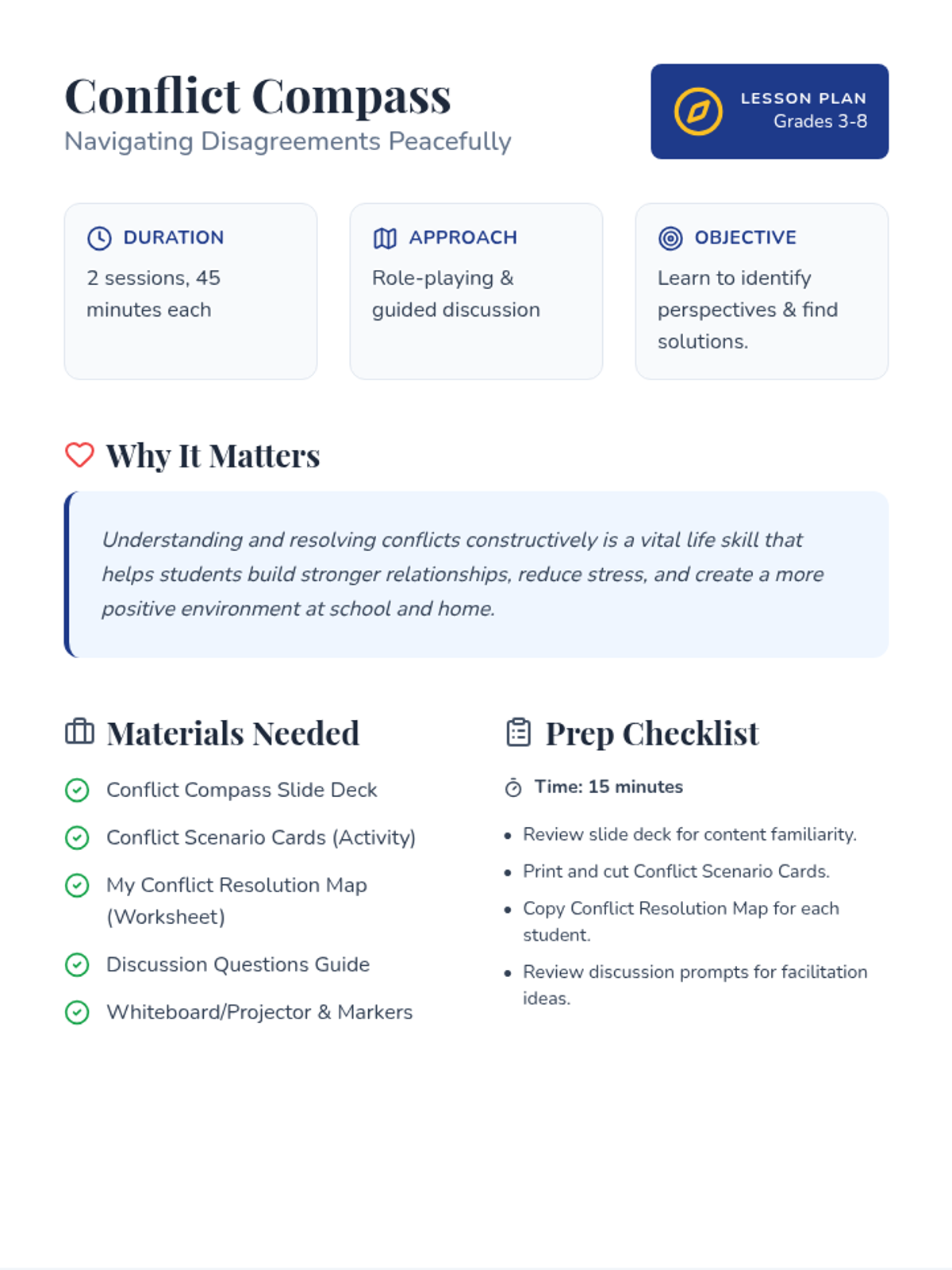 This two-session lesson equips students in grades 3-8 with essential skills for understanding and resolving conflicts constructively through perspective-taking, effective communication, and collaborative problem-solving.