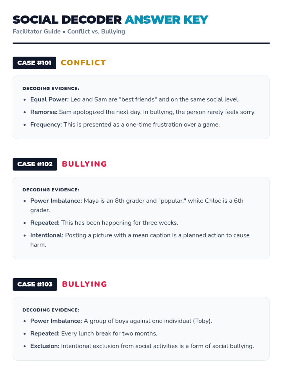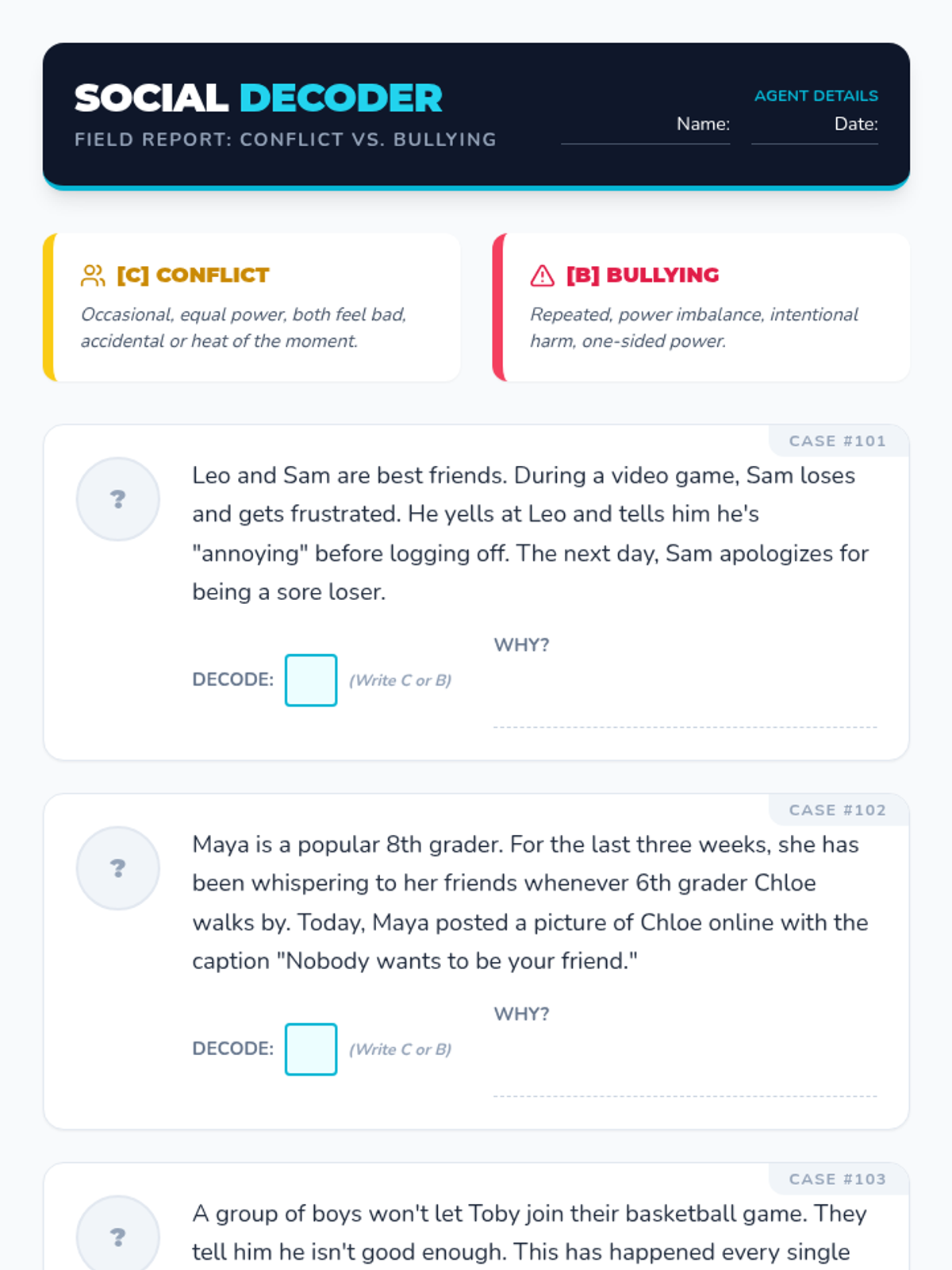 A lesson designed to help students distinguish between normal social conflict and bullying through clear definitions, comparison charts, and interactive scenarios. Perfect for telehealth or classroom settings.