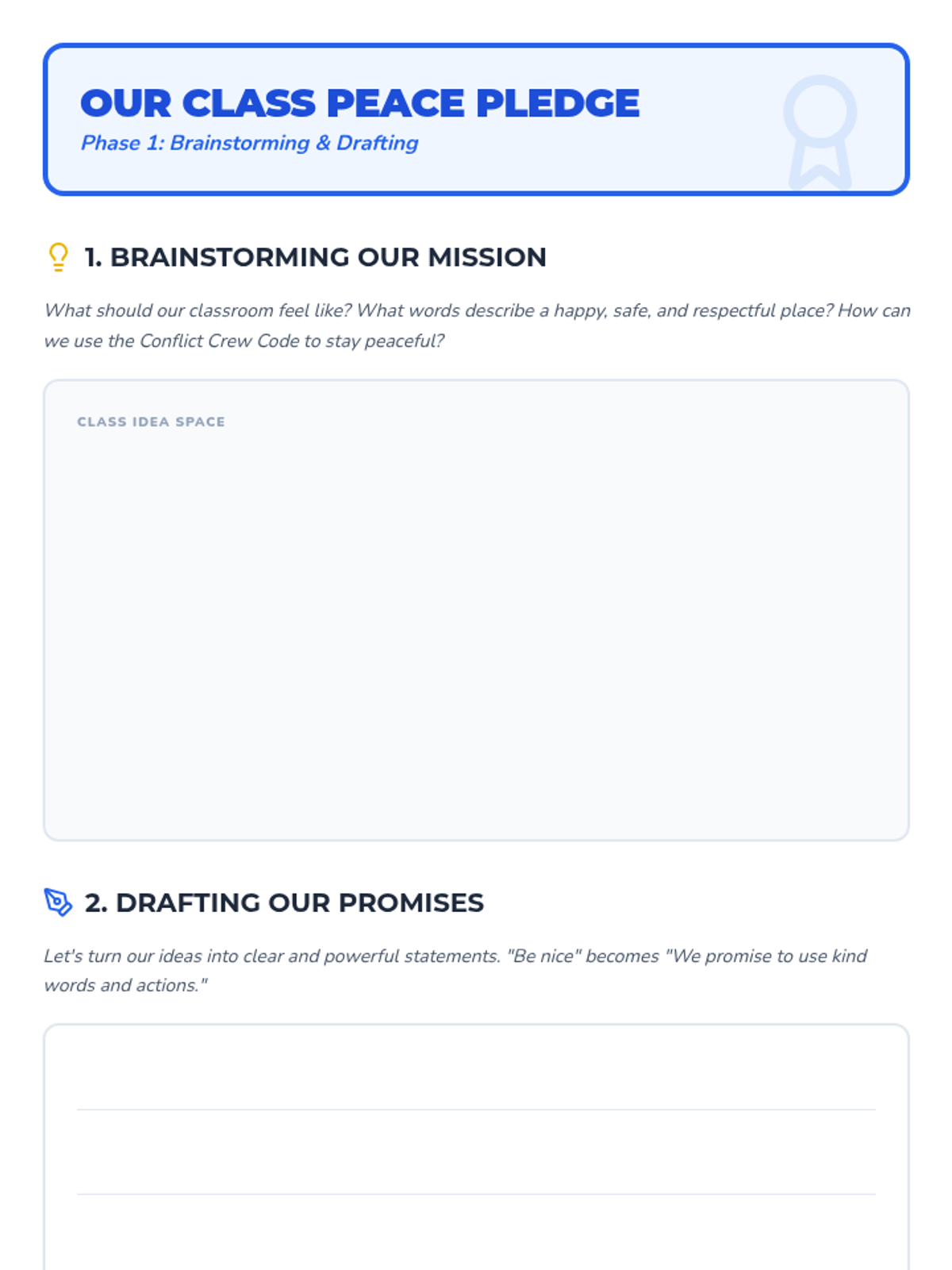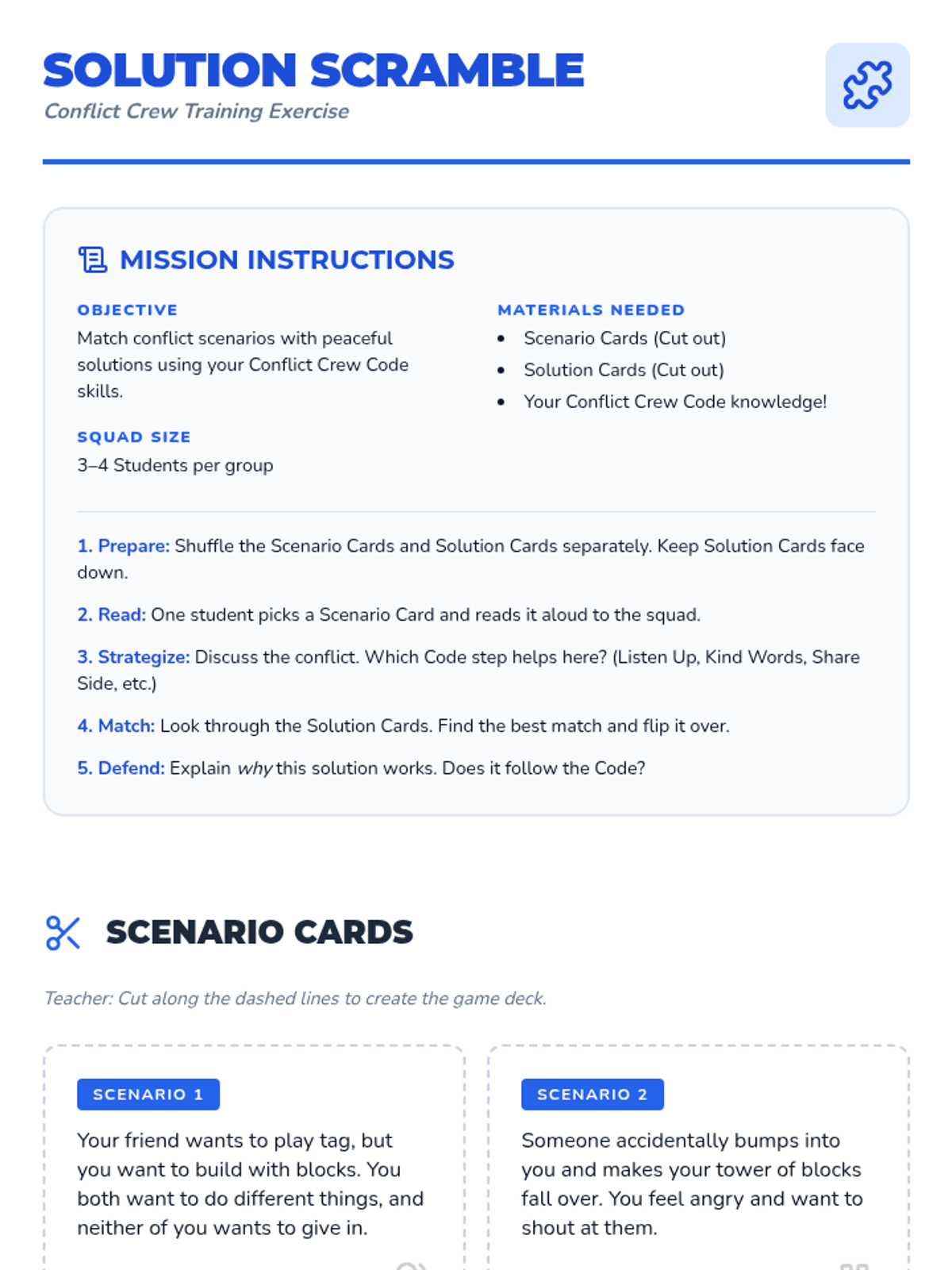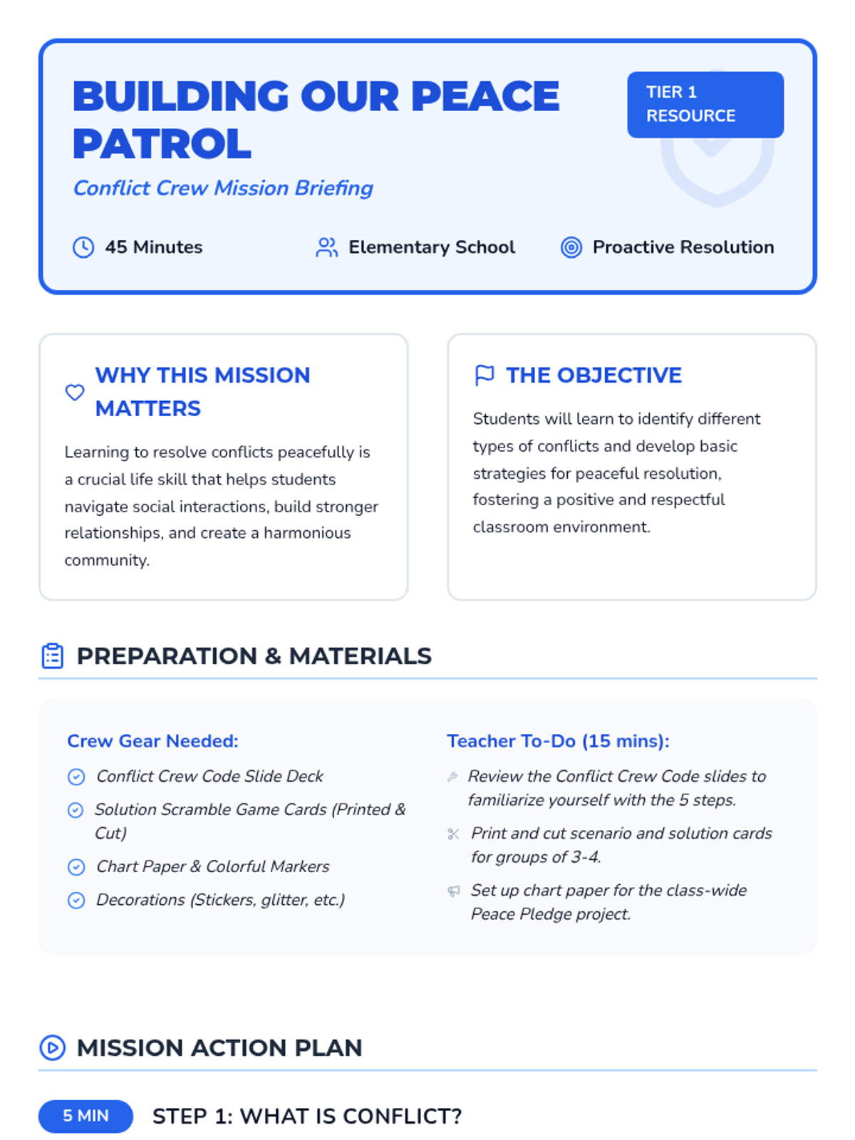 A high-energy lesson that transforms elementary students into a 'Conflict Crew,' teaching them actionable steps to resolve disagreements peacefully and collaboratively through discussion, gaming, and a class-wide pledge.