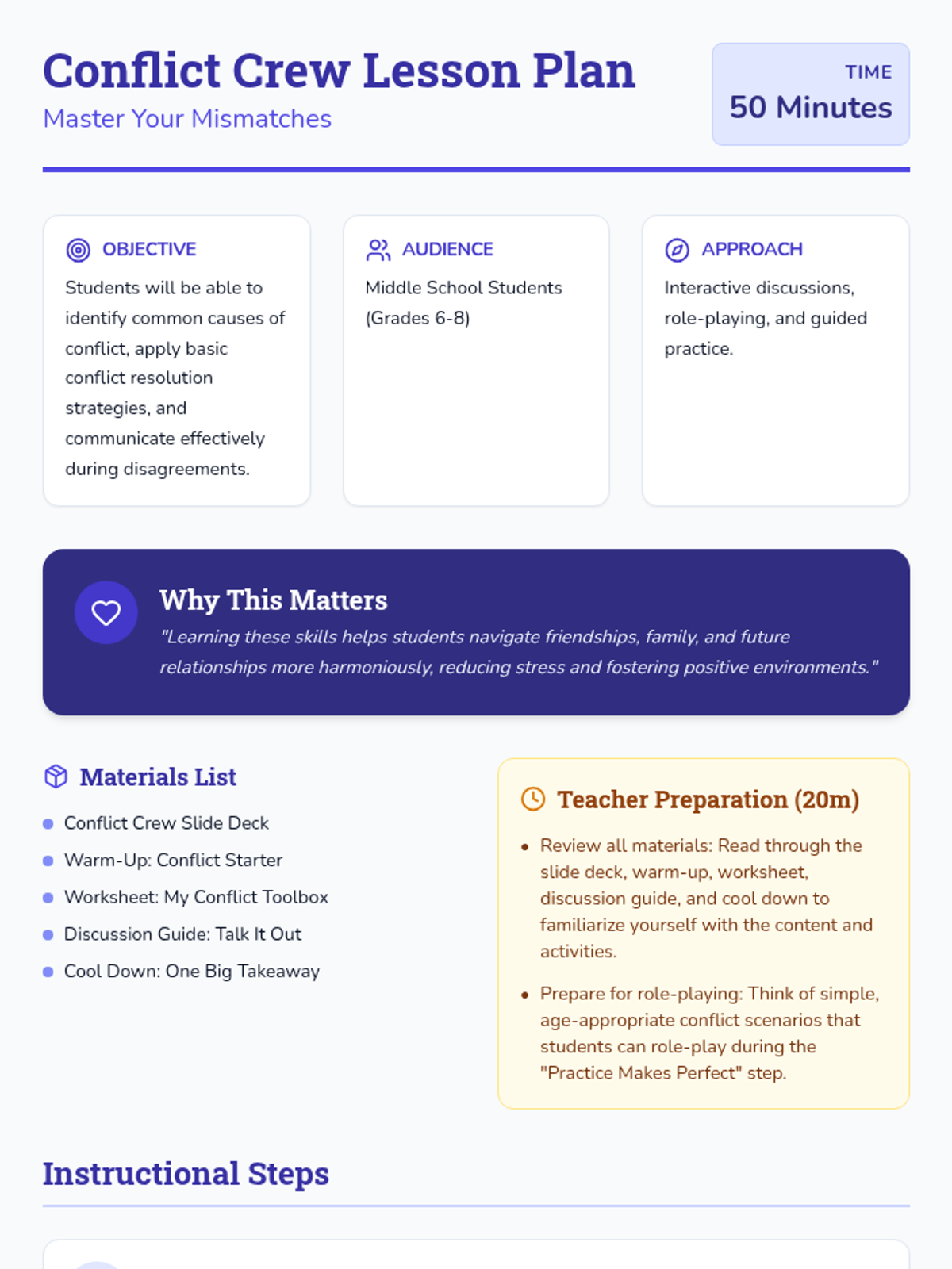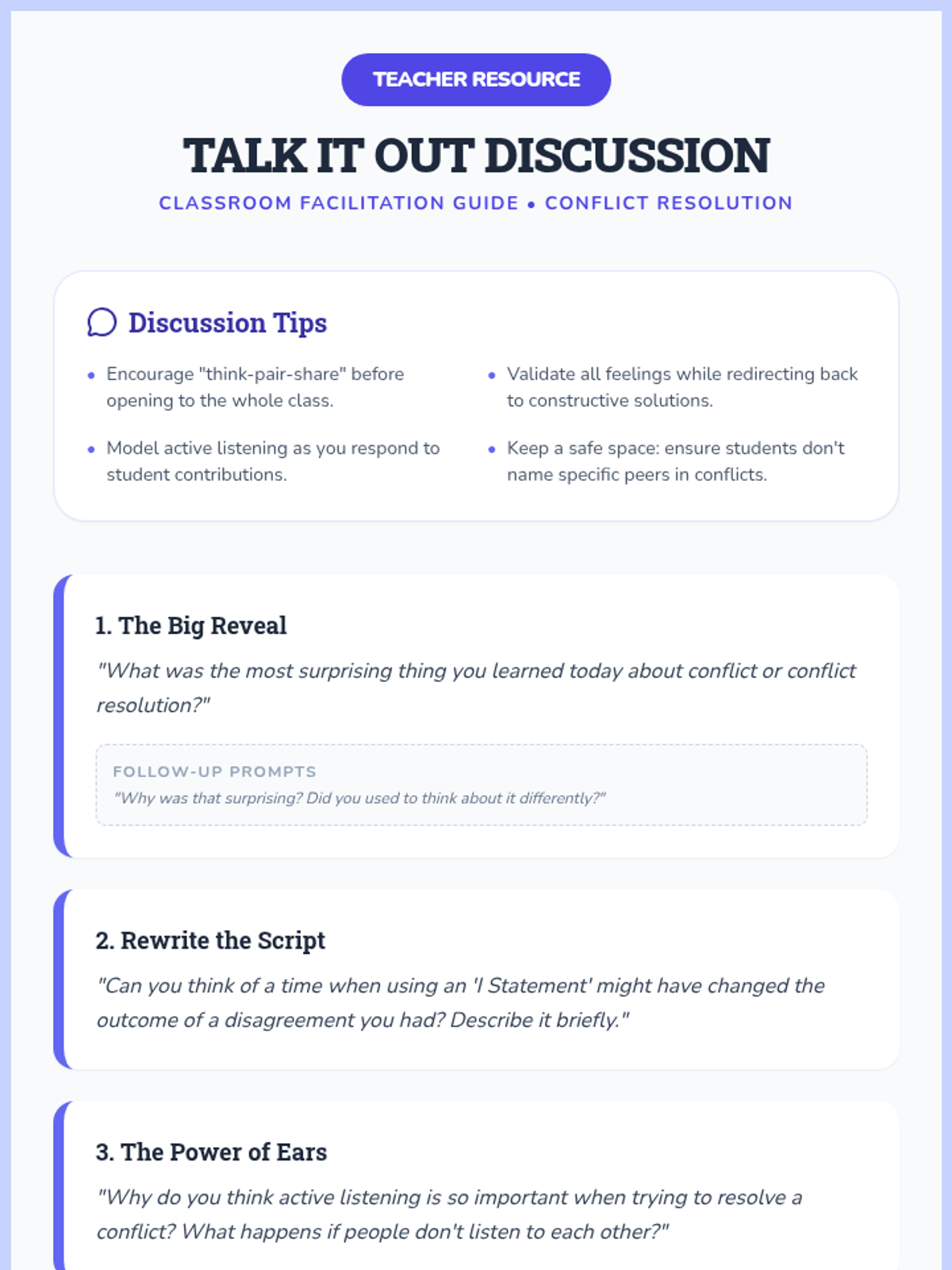 This lesson empowers students with essential conflict resolution skills, teaching them how to approach disagreements constructively and find peaceful solutions through "I Statements" and active listening.