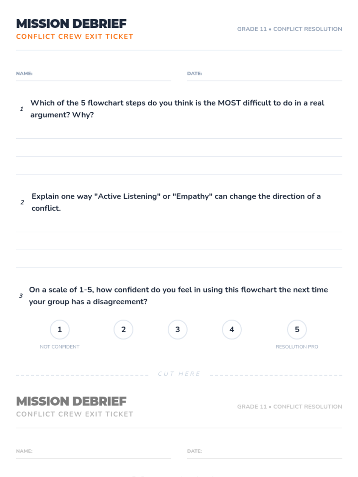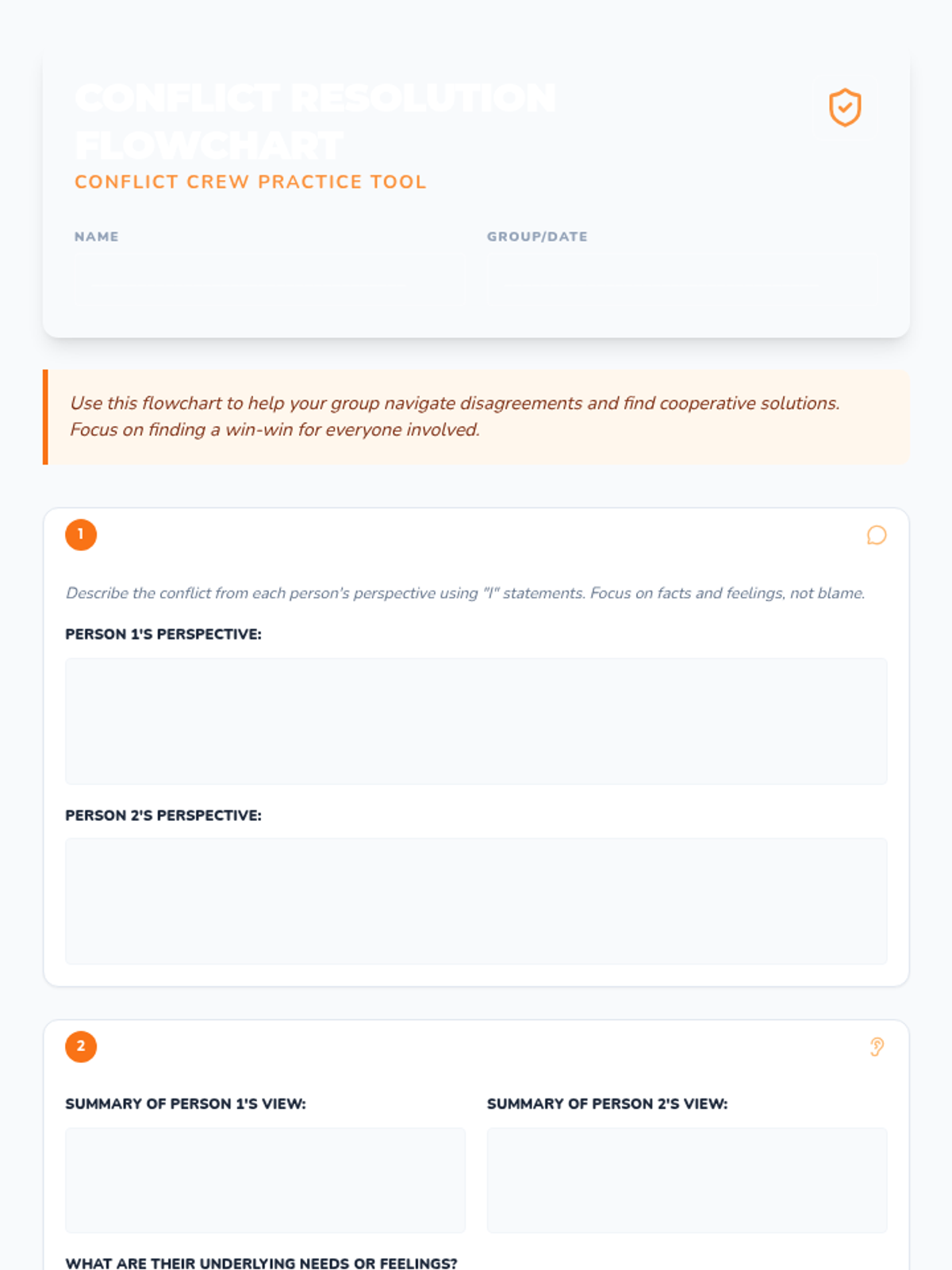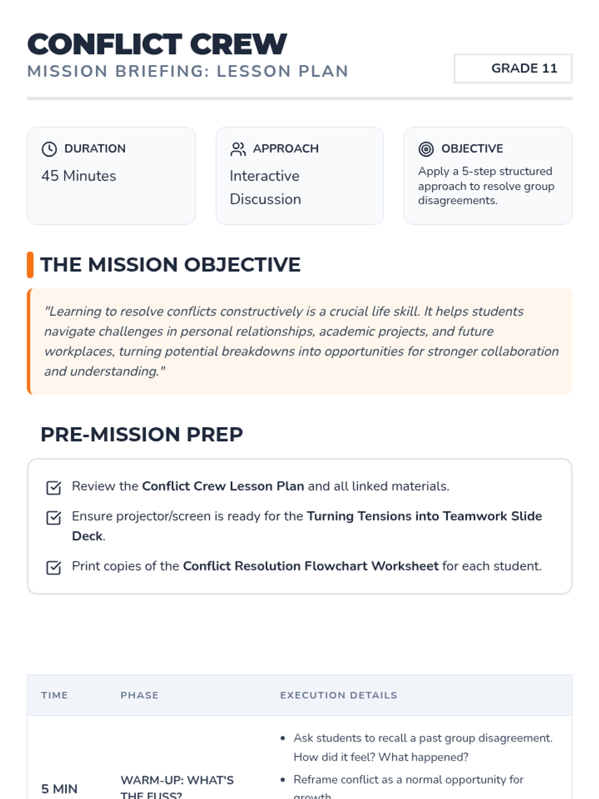 A 45-minute small group session for 11th graders focused on cooperative conflict resolution. Students learn to identify conflict sources and apply a 5-step flowchart to resolve disagreements constructively through role-play and discussion.