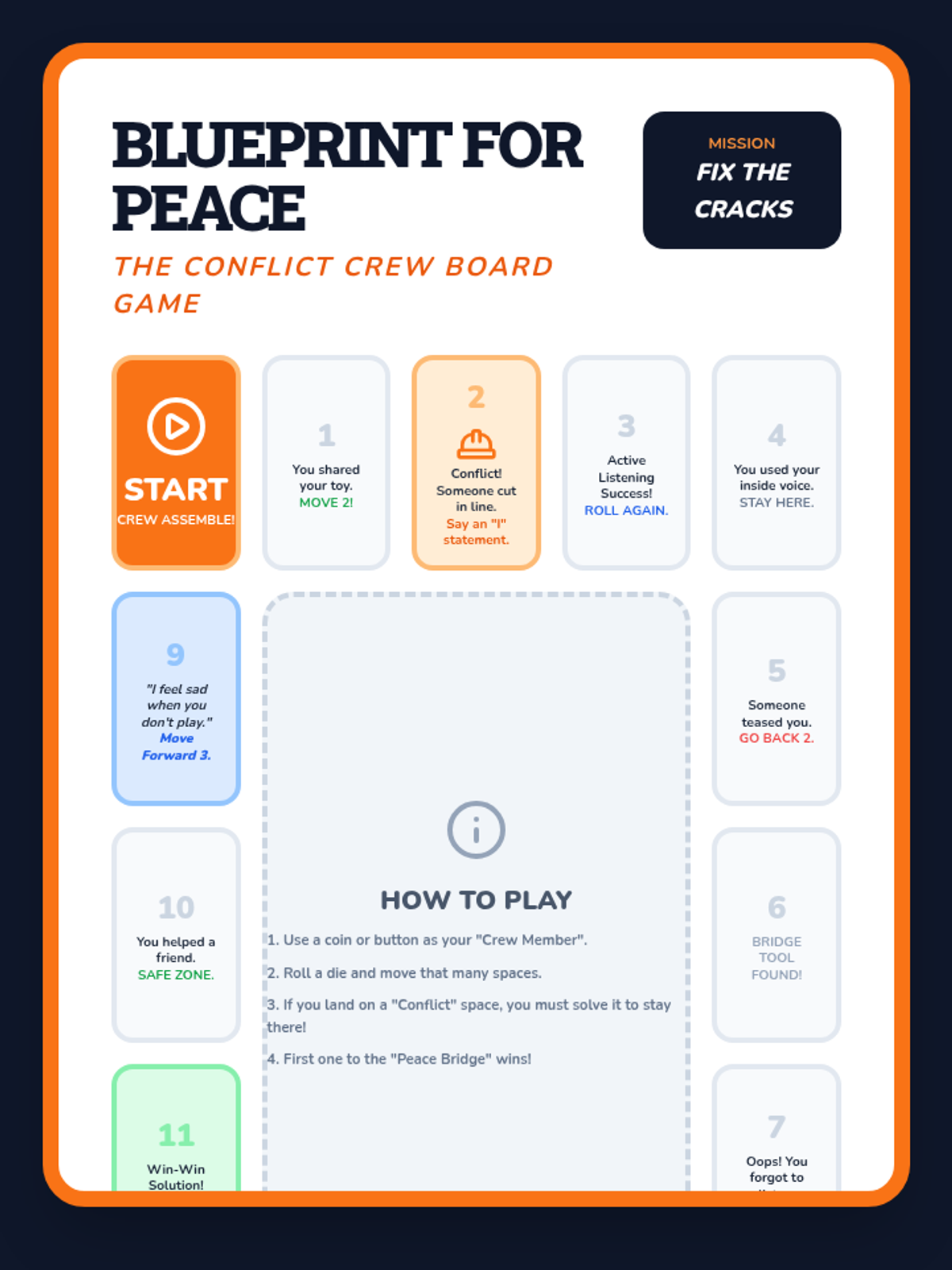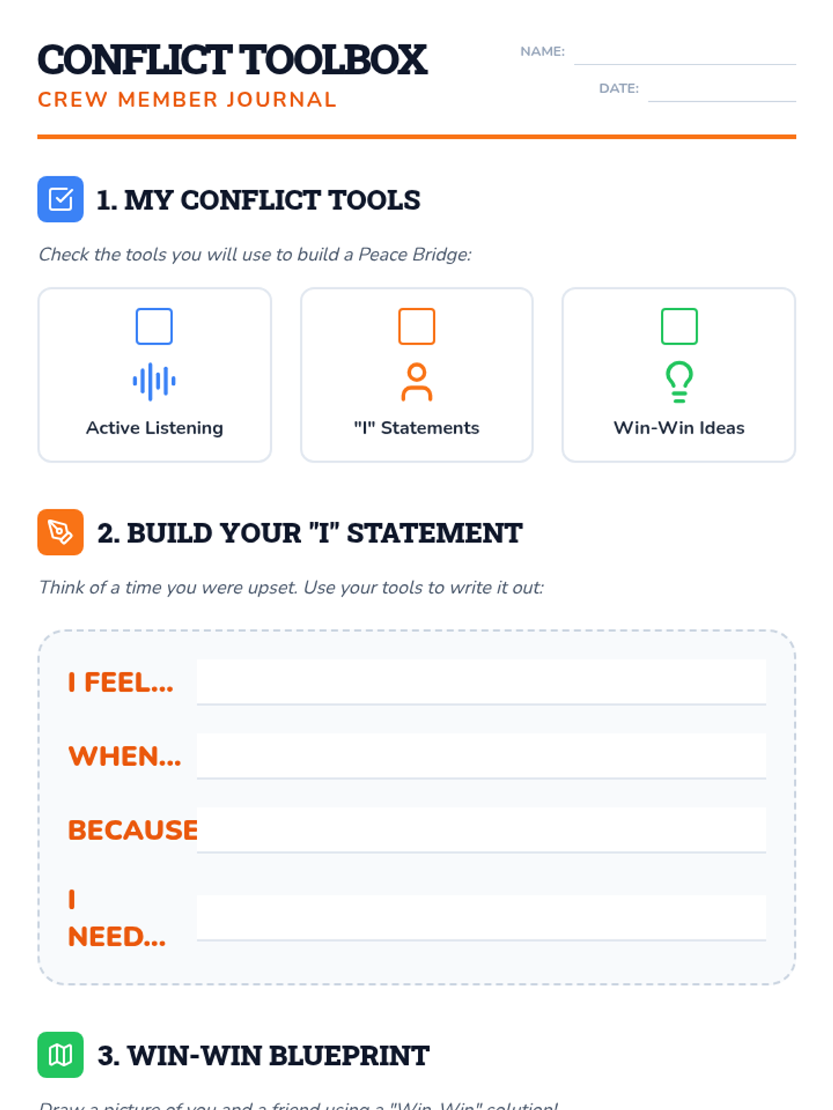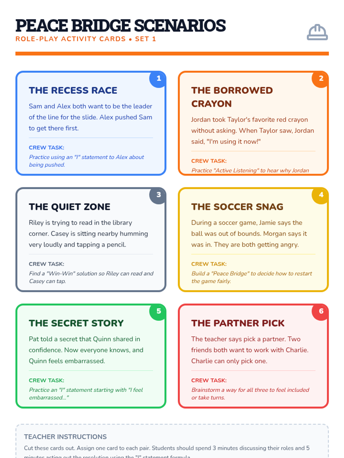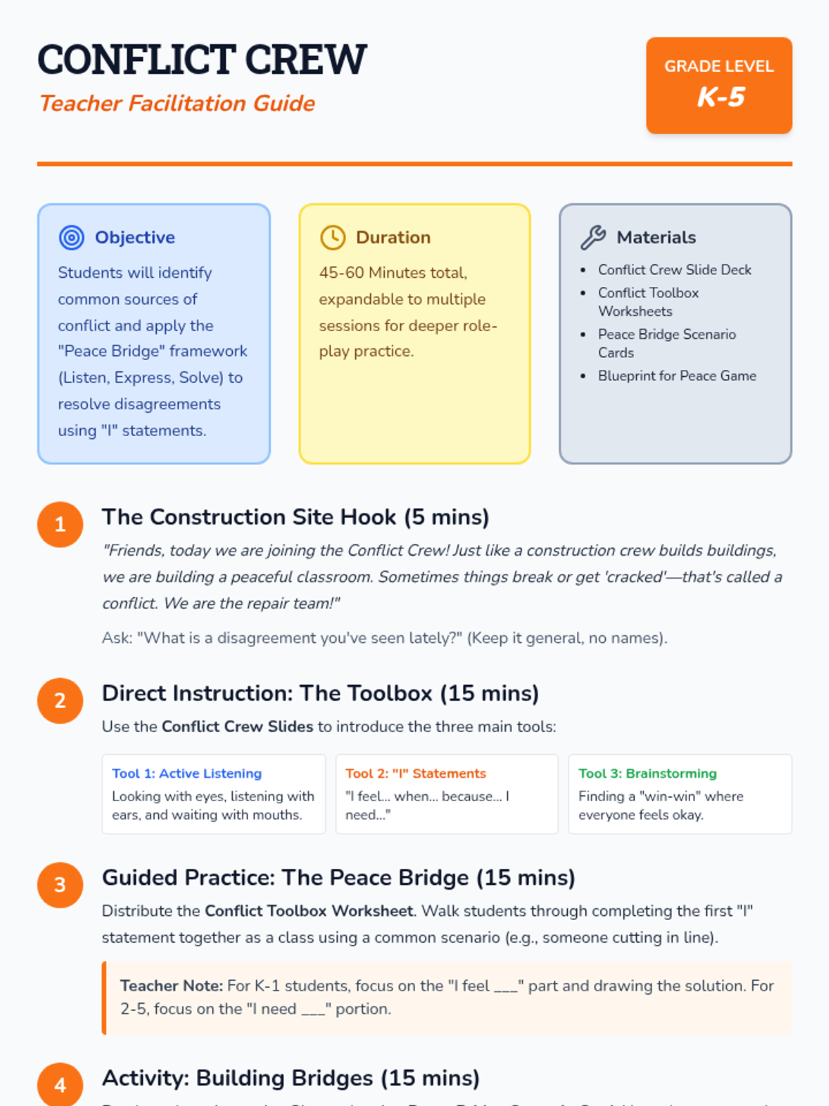 A comprehensive SEL lesson designed to teach K-5 students the 'Conflict Crew' framework for resolving disagreements. Students will learn 'I' statements, active listening, and the 'Peace Bridge' steps through interactive slides, role-playing, and a collaborative board game.