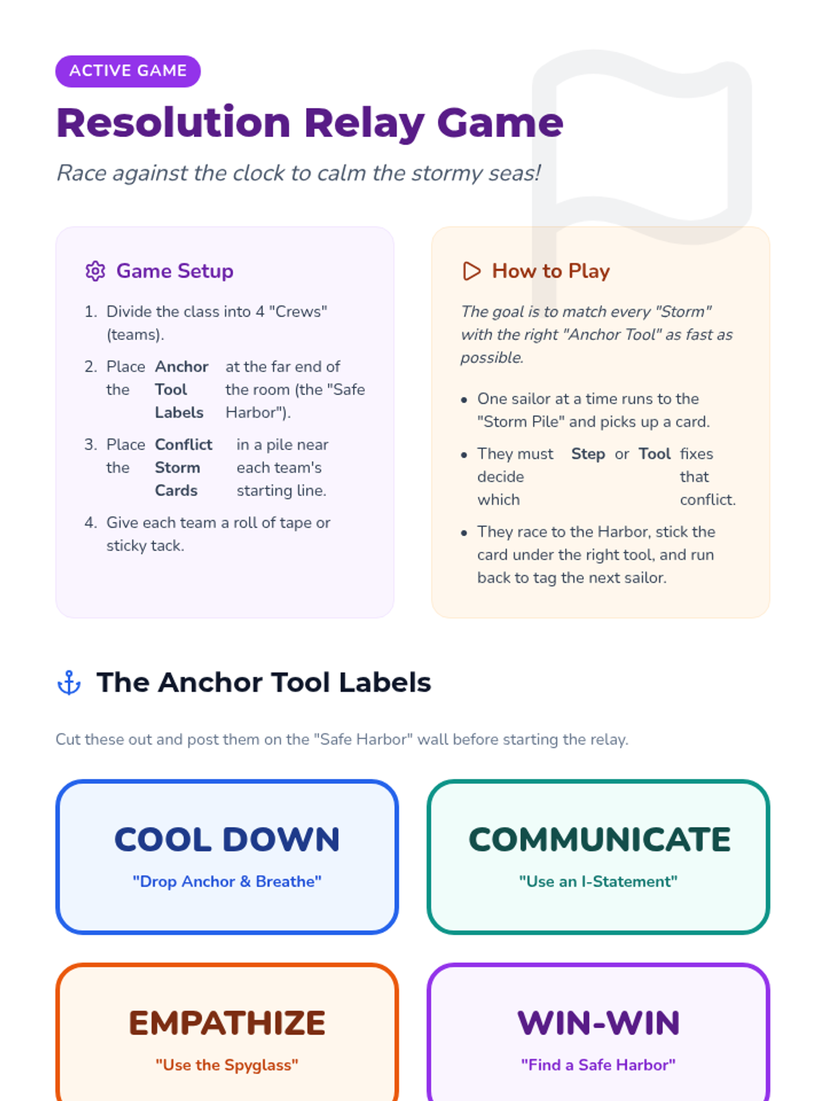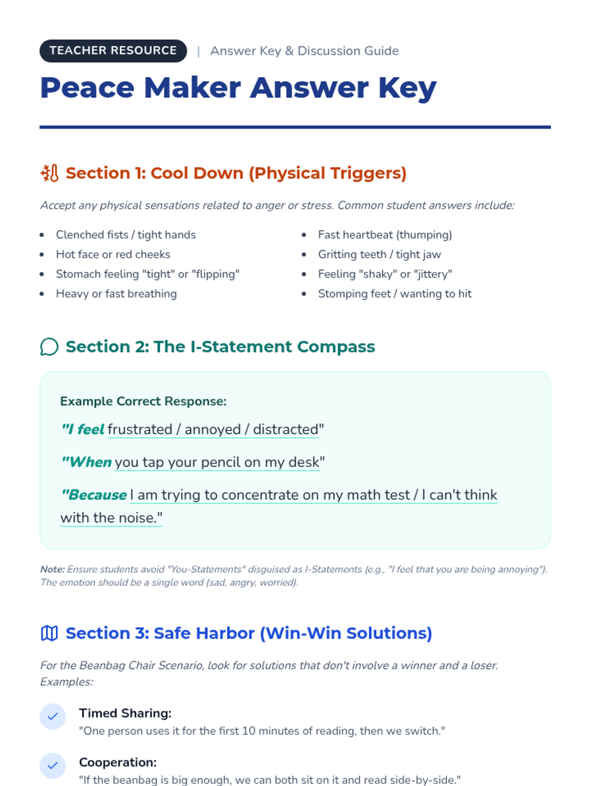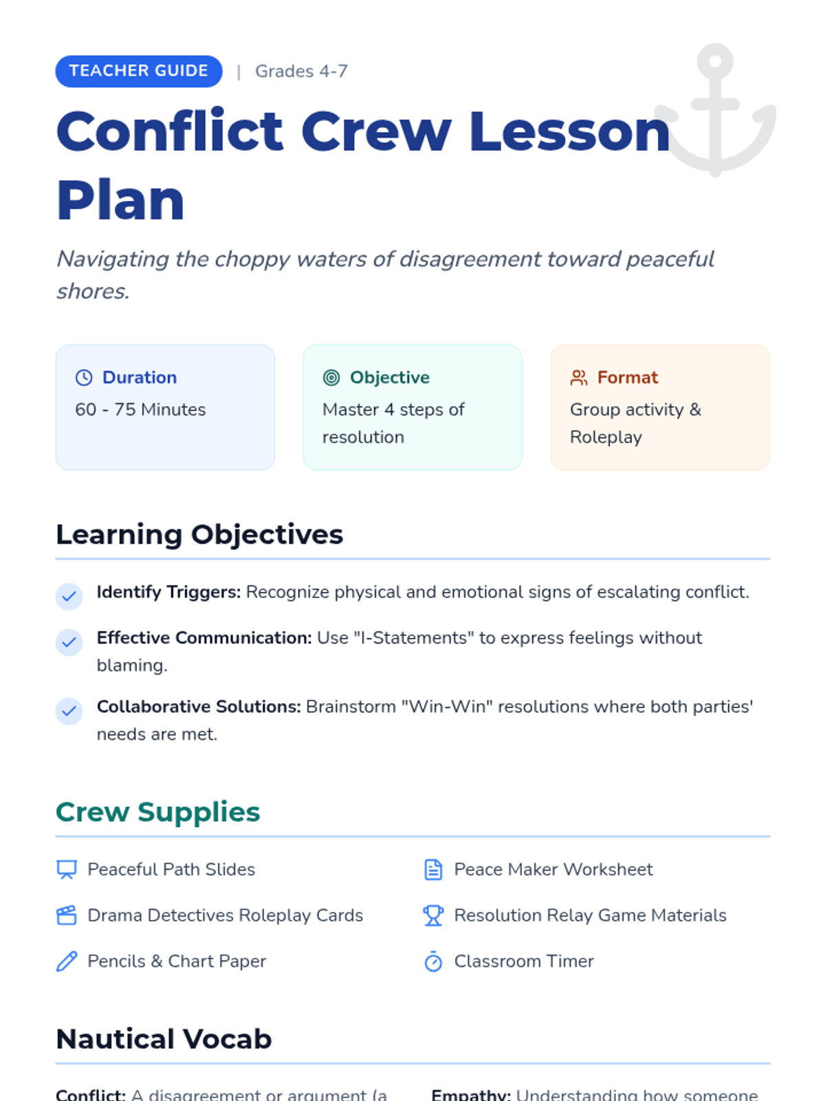 This lesson equips students with practical strategies for navigating disagreements and resolving conflicts peacefully. Through role-playing, games, and guided practice, students learn to communicate effectively and find win-win solutions.
