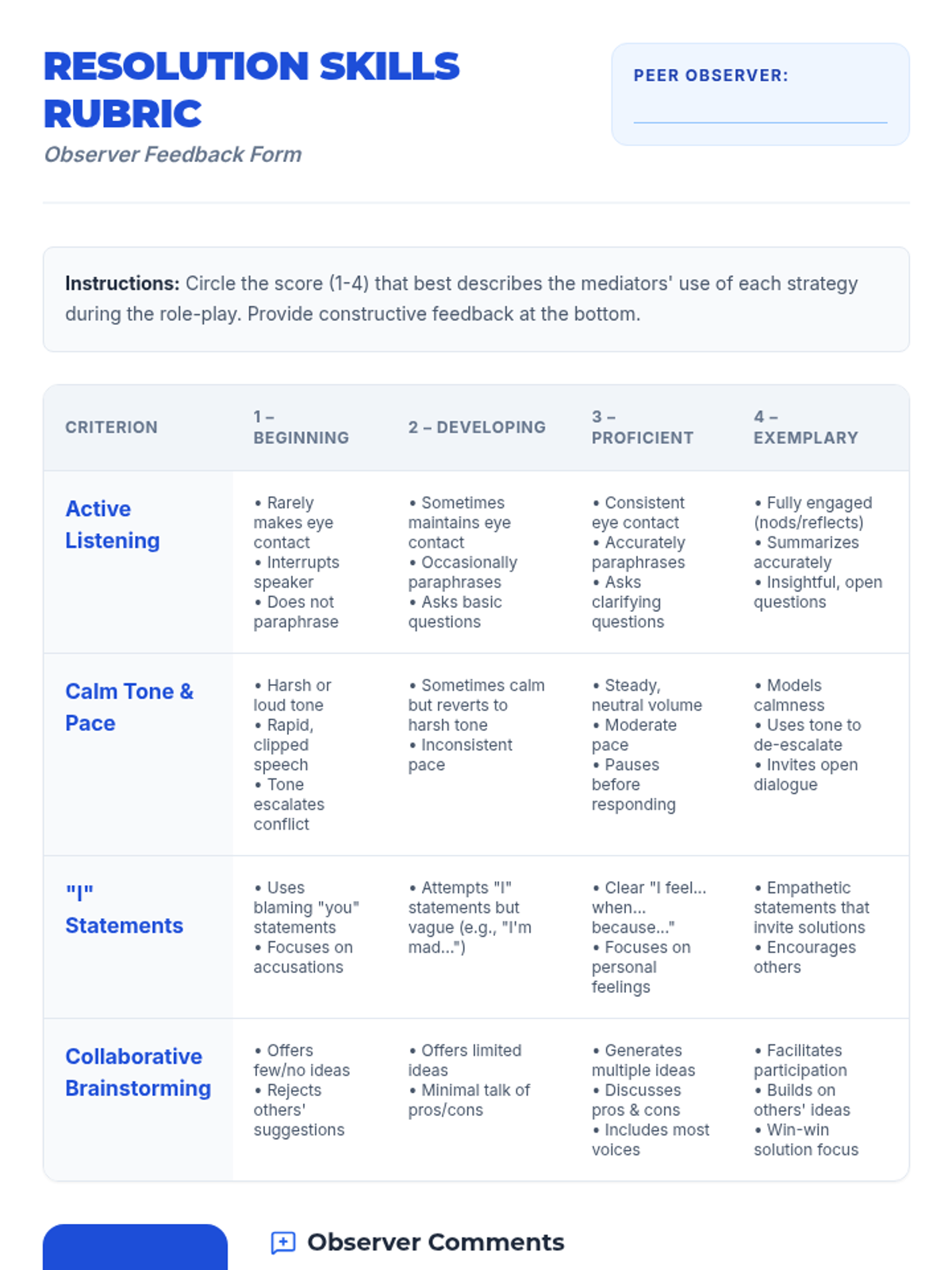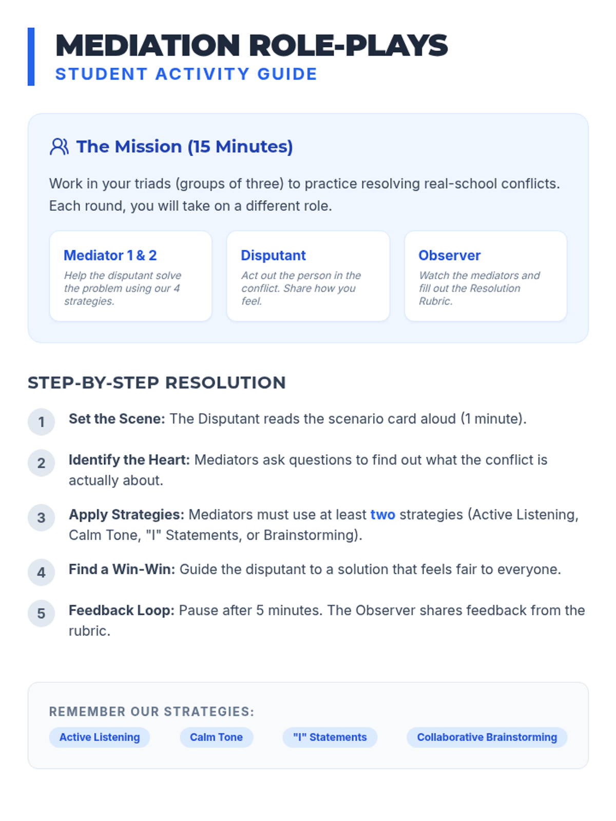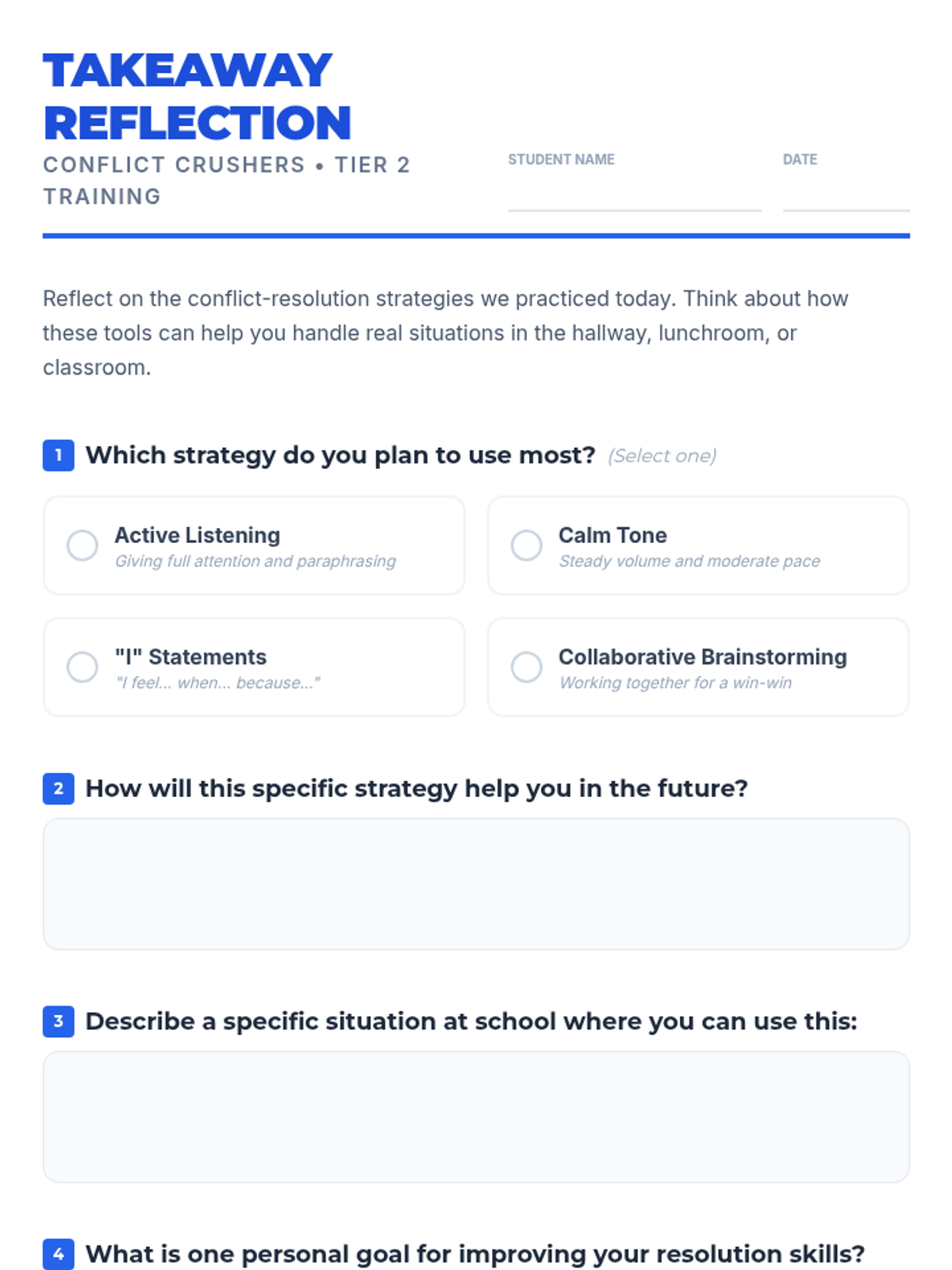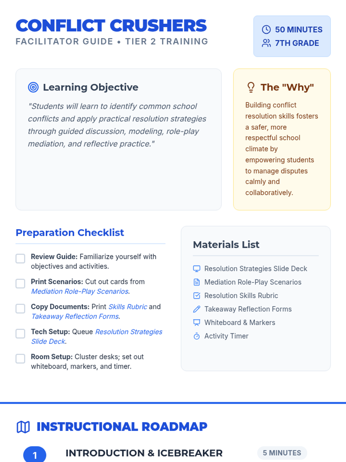 A 50-minute Tier 2 small-group training for 7th graders to build practical conflict resolution skills. Students learn and practice active listening, calm tone, 'I' statements, and collaborative brainstorming through role-play and reflection.