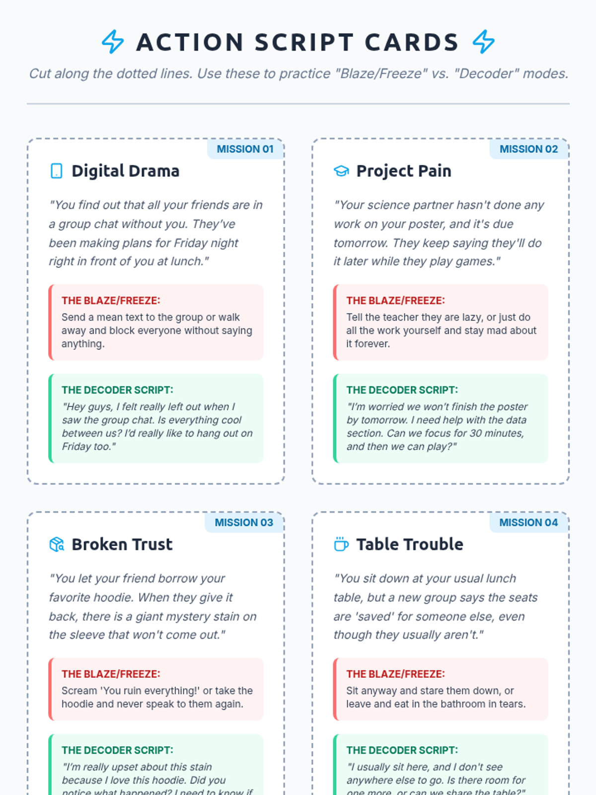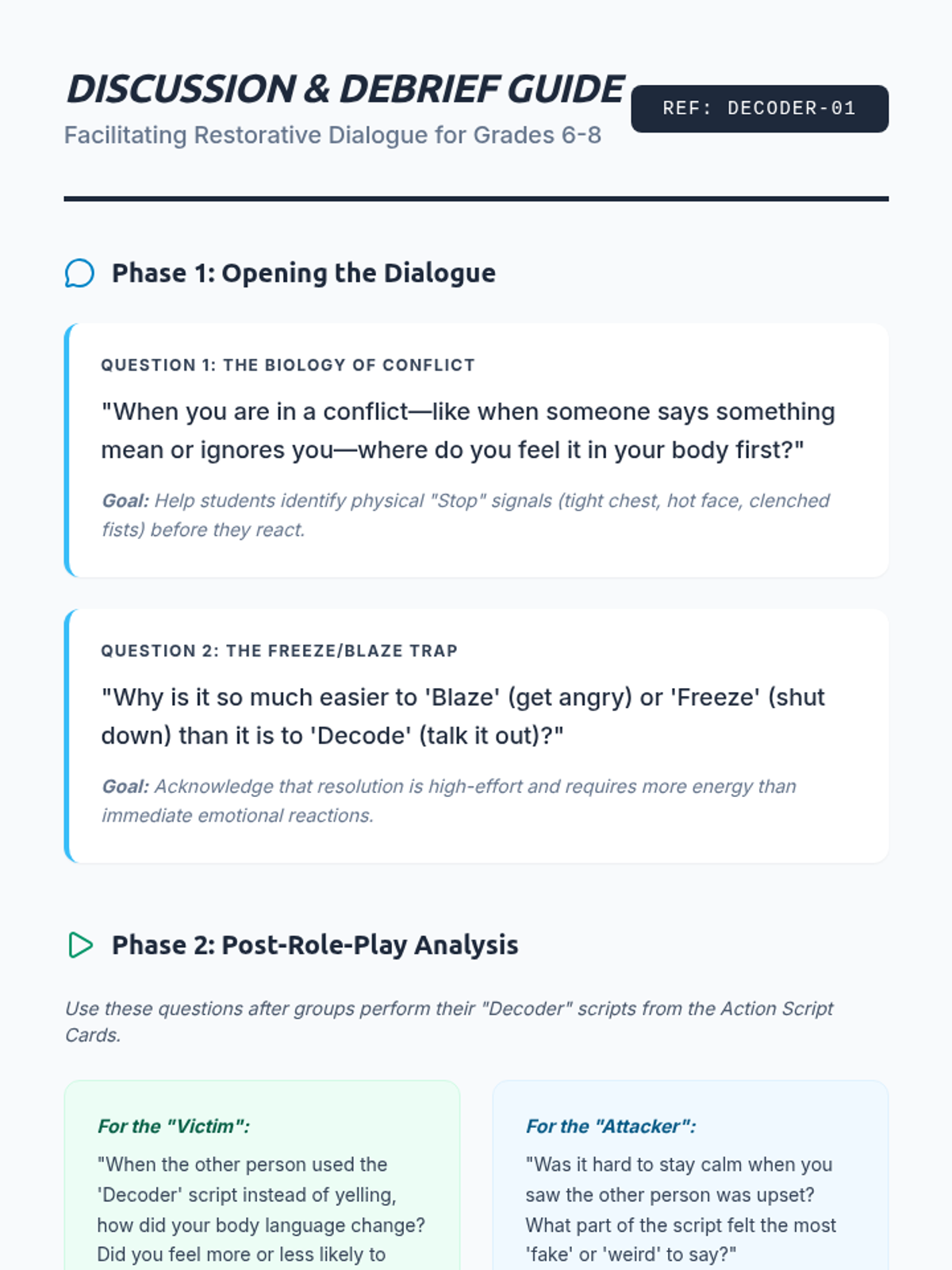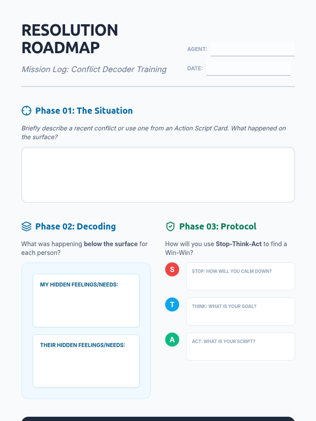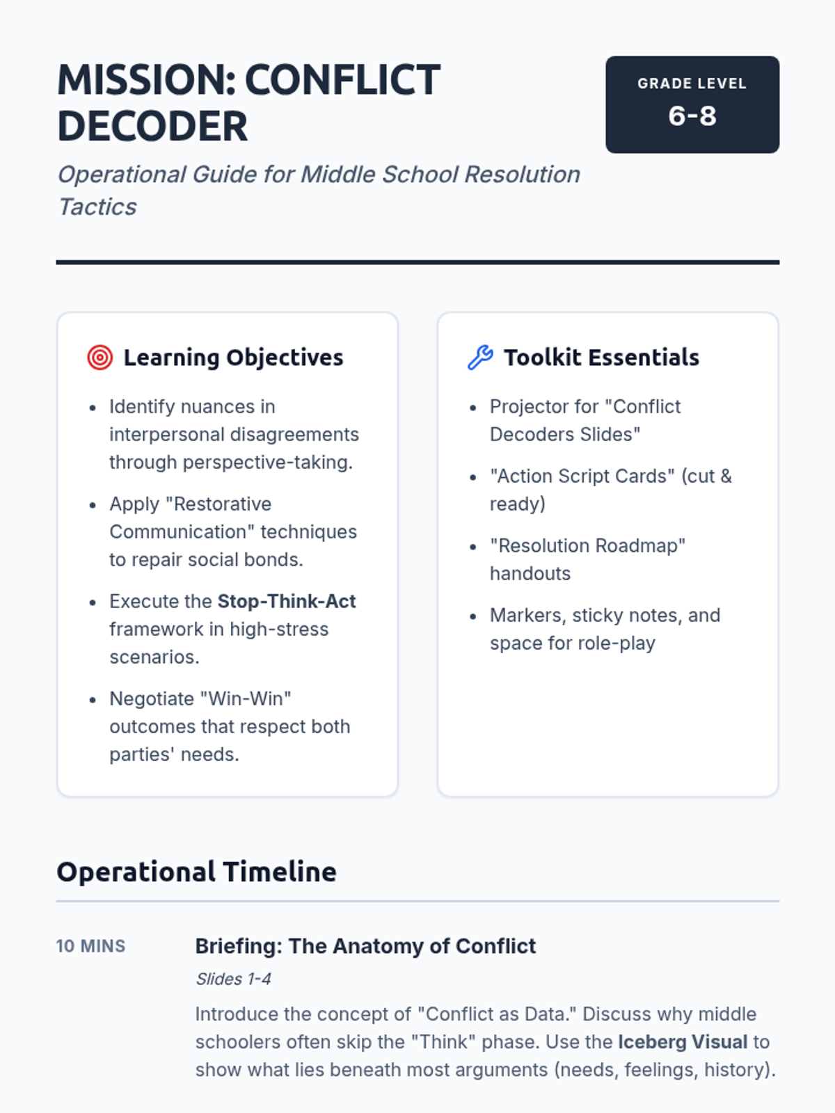 A comprehensive module for middle school students to master conflict resolution through perspective-taking, restorative communication, and the 'Stop-Think-Act' framework. Students decode real-world social scenarios to find mutually beneficial outcomes.