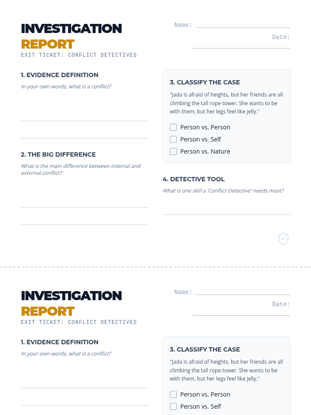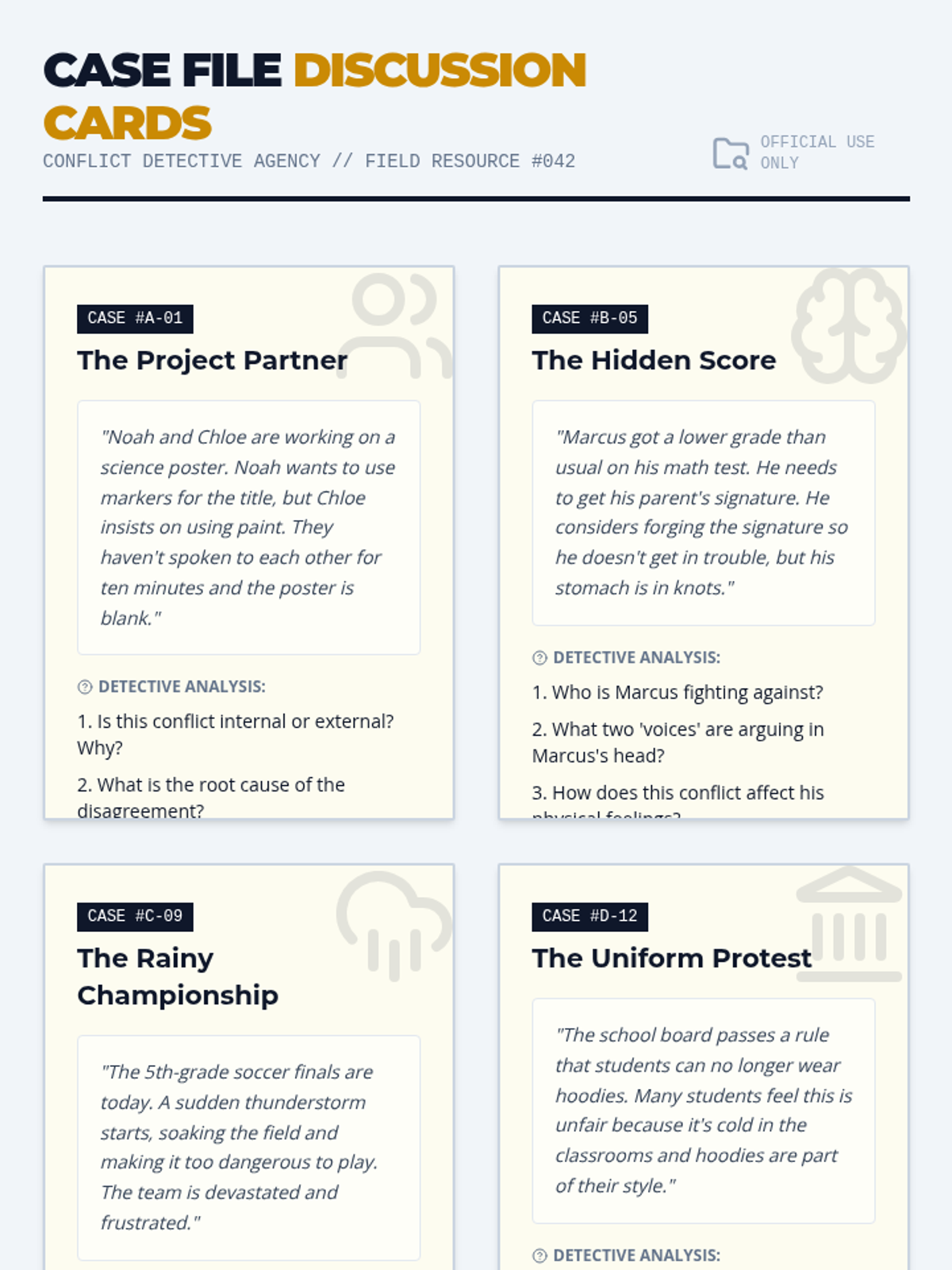 This lesson transforms students into 'Conflict Detectives' to identify and analyze different types of conflict. Through interactive slides and small-group case file discussions, students learn to distinguish between internal and external conflicts and explore healthy resolution strategies.