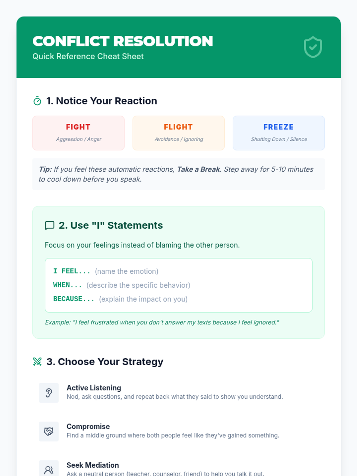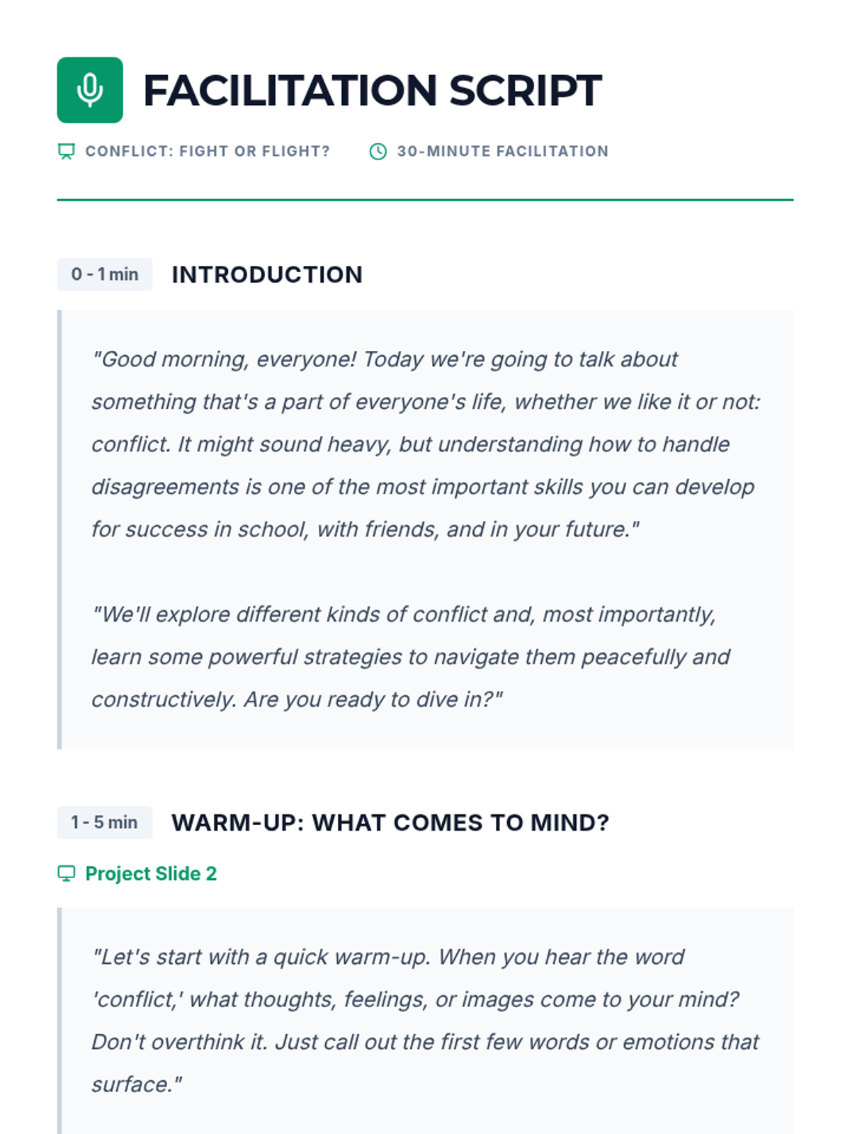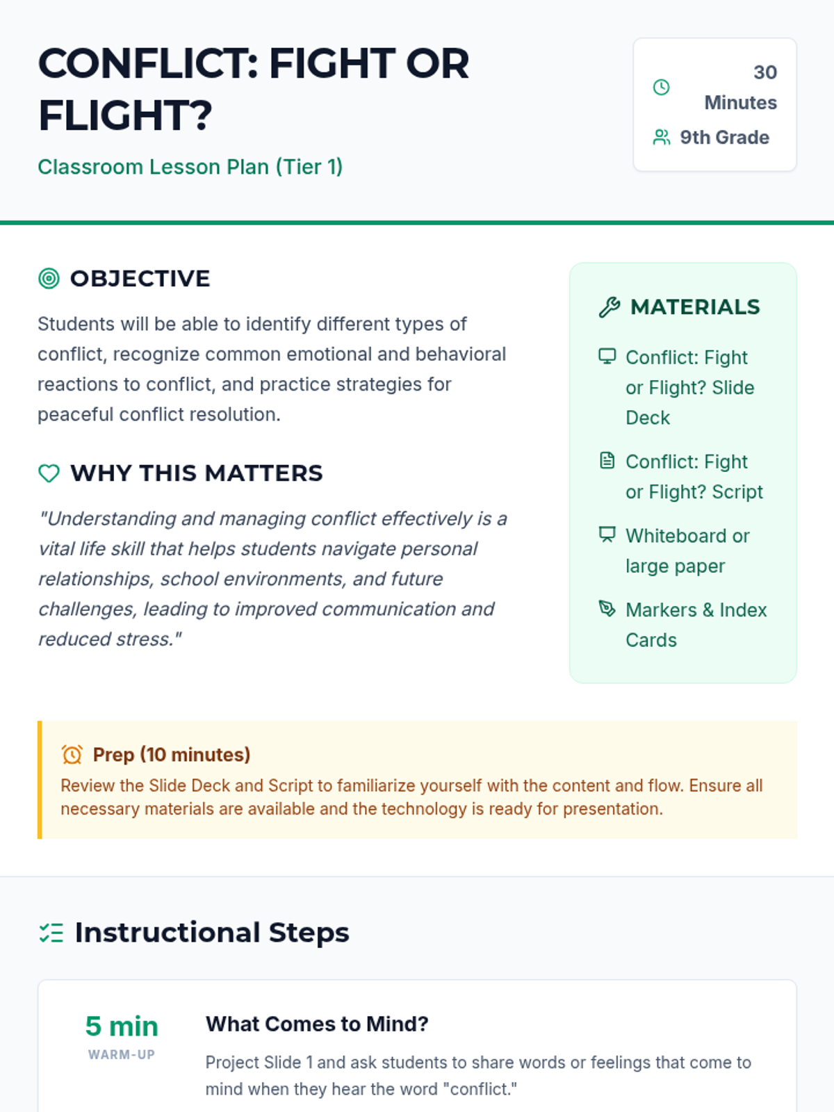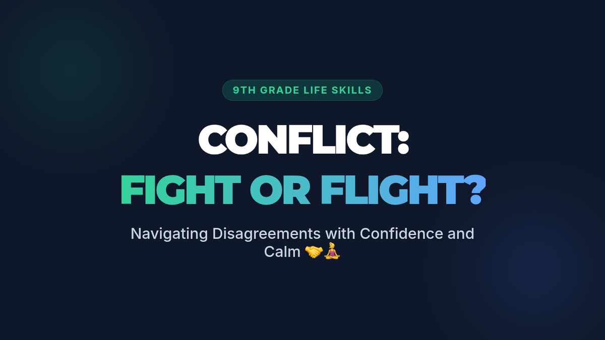 A 30-minute lesson for 9th graders exploring the nature of conflict, biological stress responses (fight, flight, freeze), and practical strategies for peaceful resolution. Students reflect on their own reactions and learn to use 'I' statements and active listening.