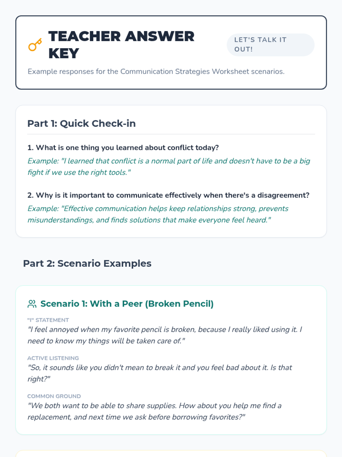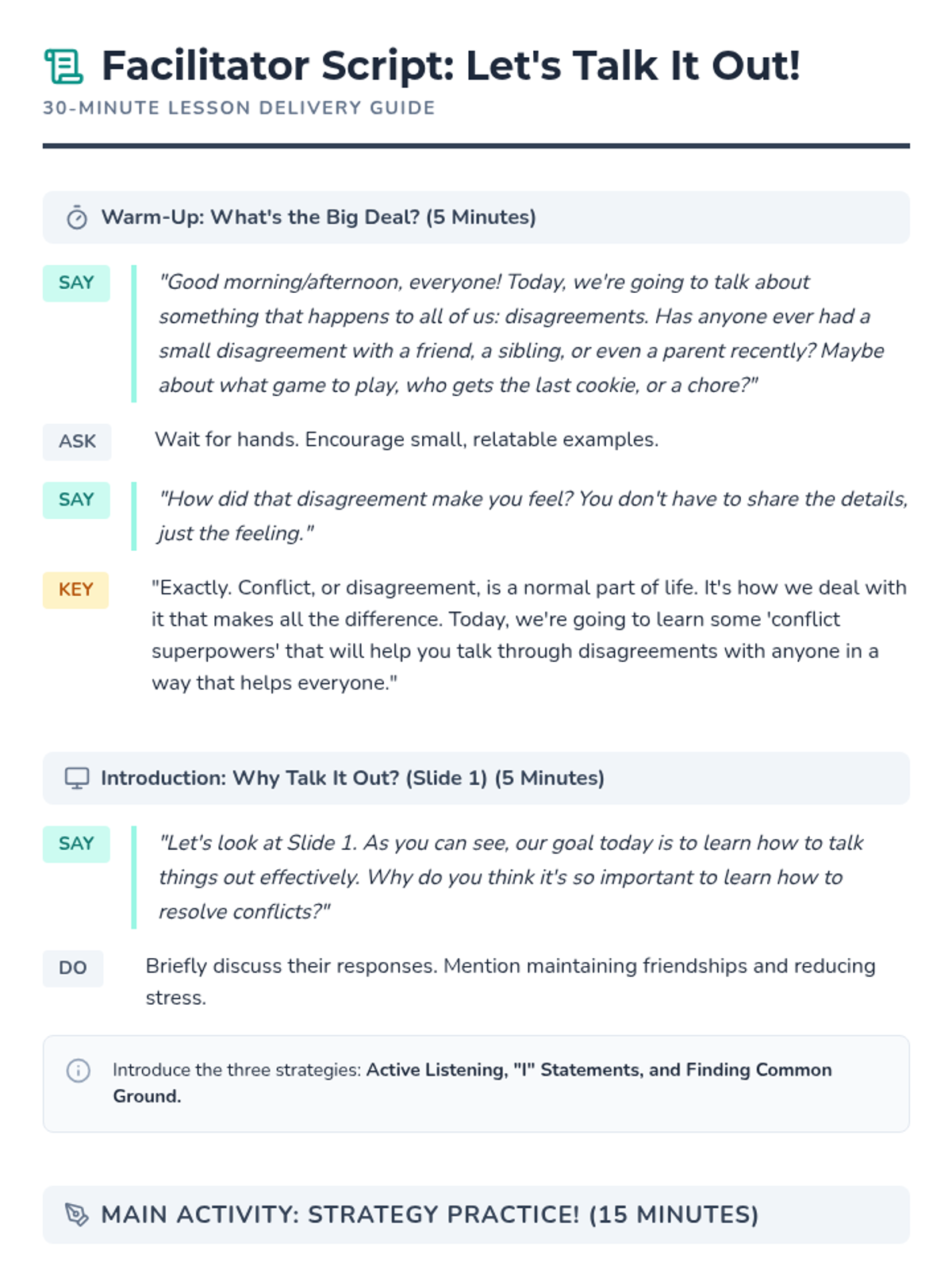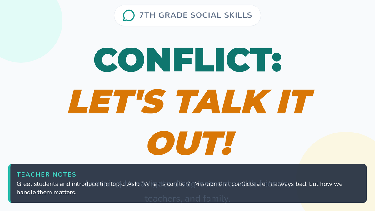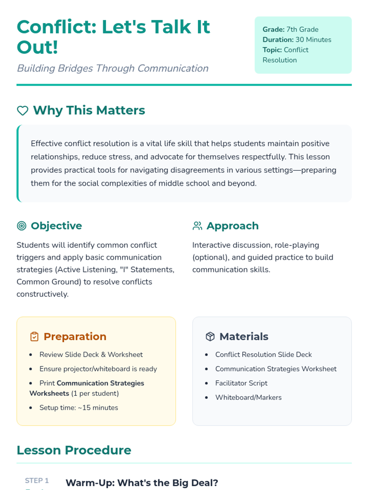 A 30-minute lesson for 7th graders focusing on conflict resolution through Active Listening, 'I' Statements, and Finding Common Ground. Students practice these skills through real-world scenarios involving peers, teachers, and family.