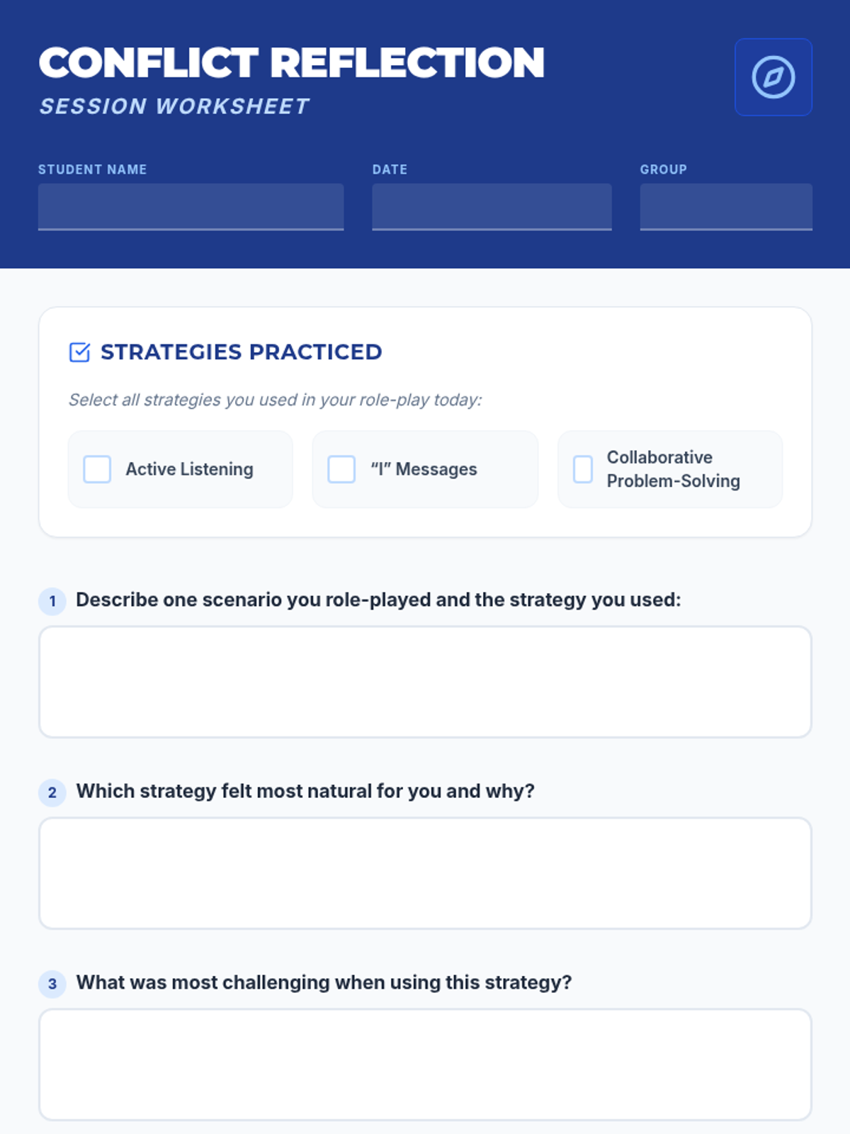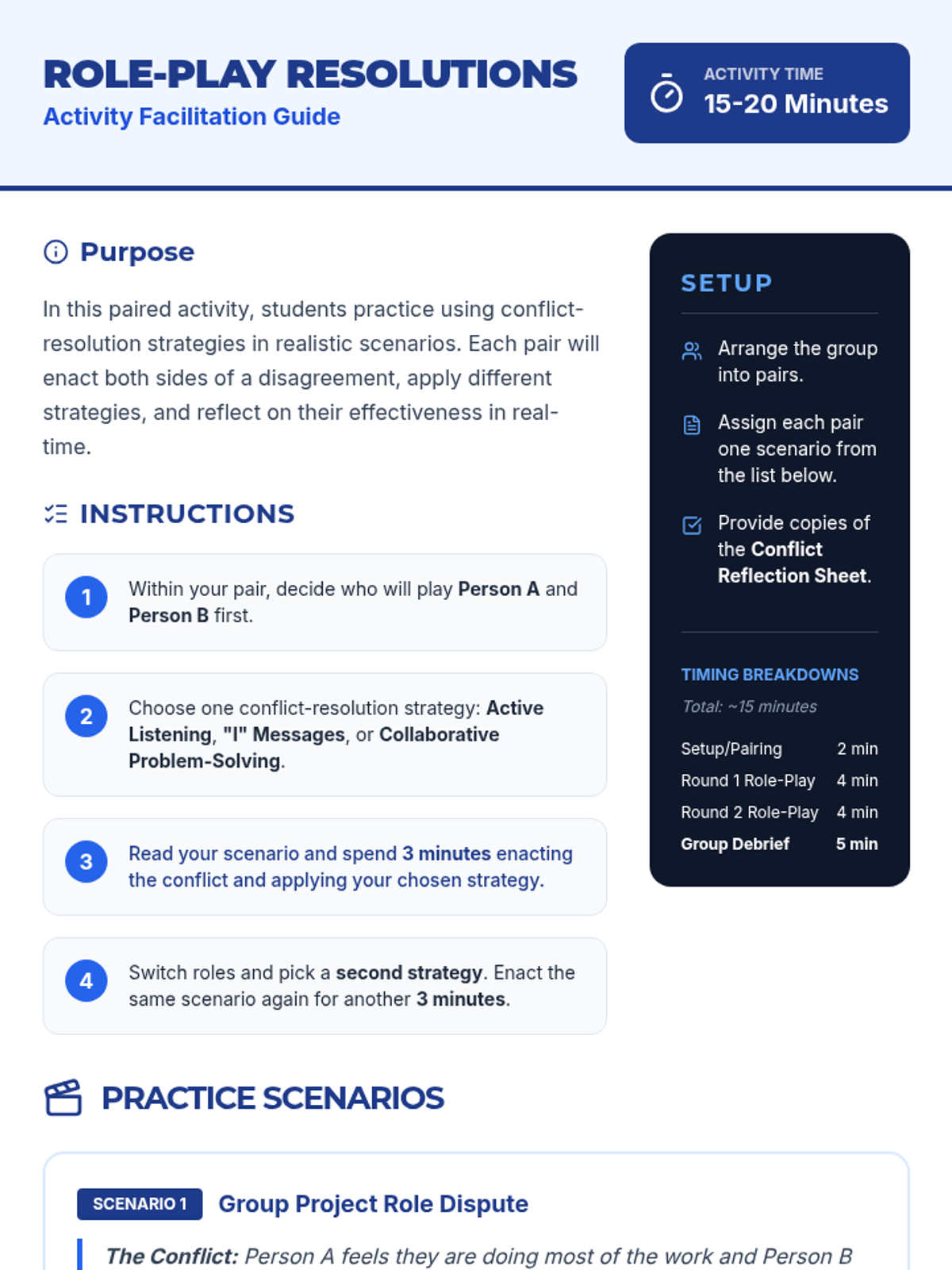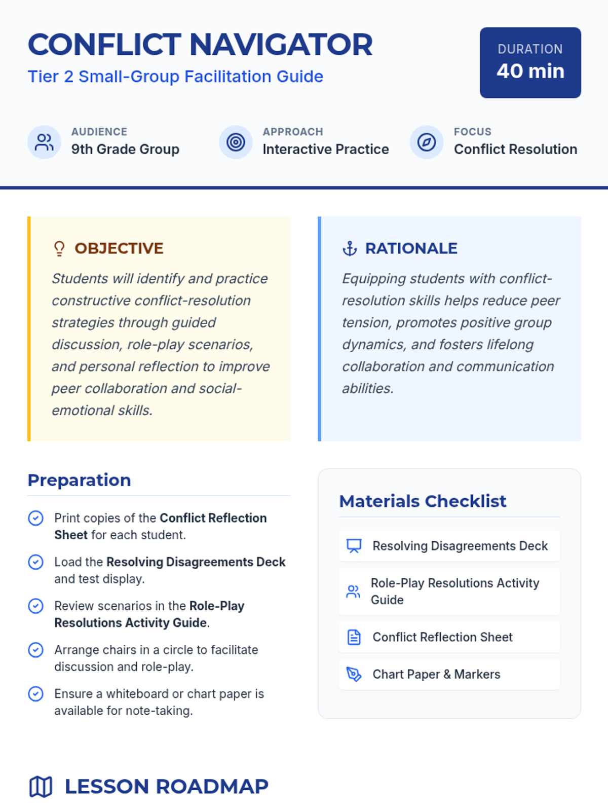 A 40-minute Tier 2 small-group lesson for 9th graders to learn and practice constructive conflict-resolution strategies like active listening, 'I' messages, and collaborative problem-solving.