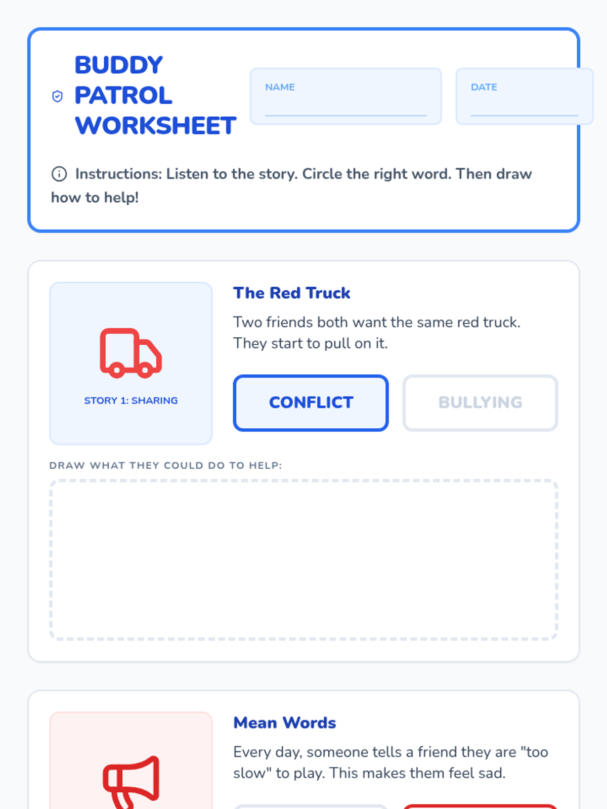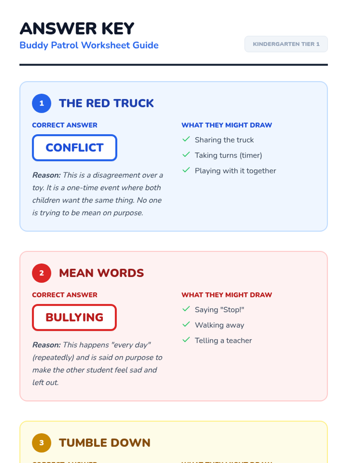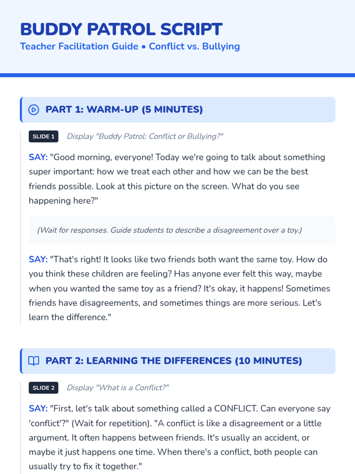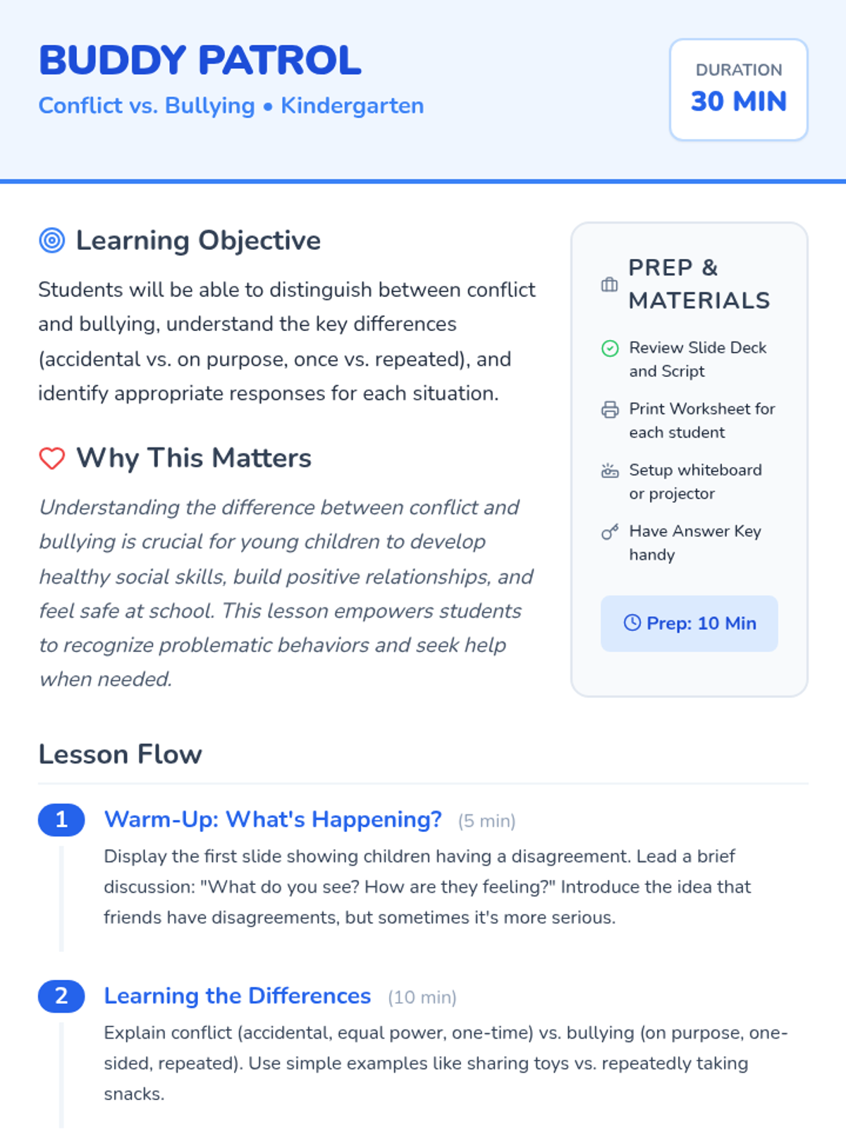 A 30-minute Kindergarten lesson that helps students distinguish between accidental conflict and intentional, repeated bullying through relatable scenarios and guided practice.
