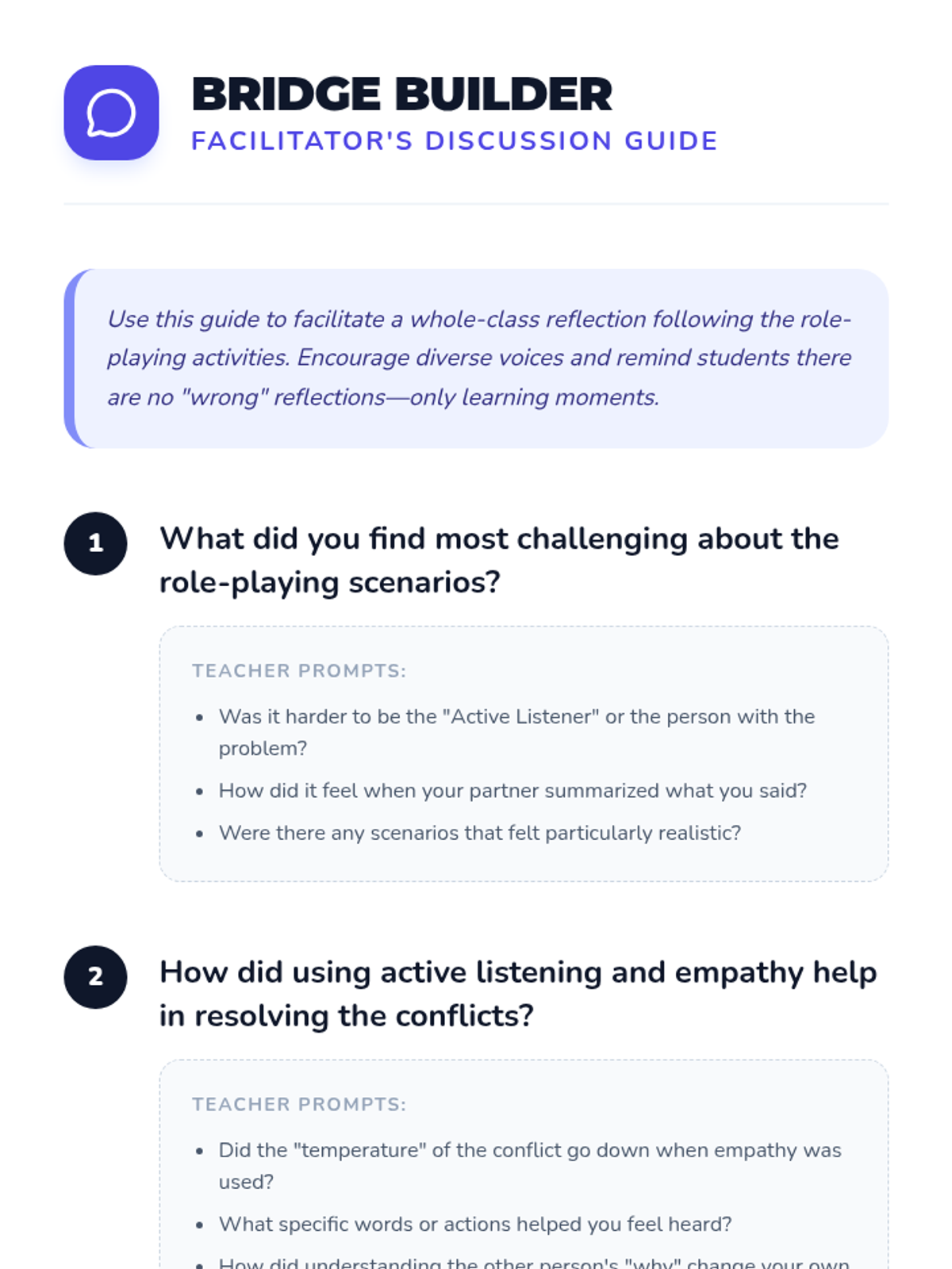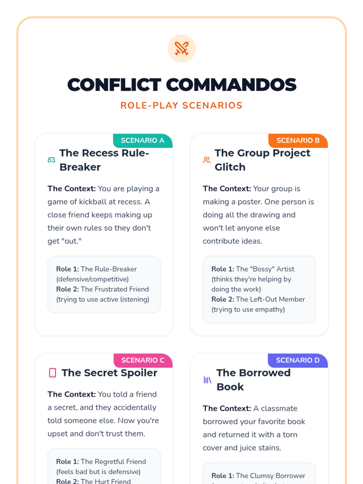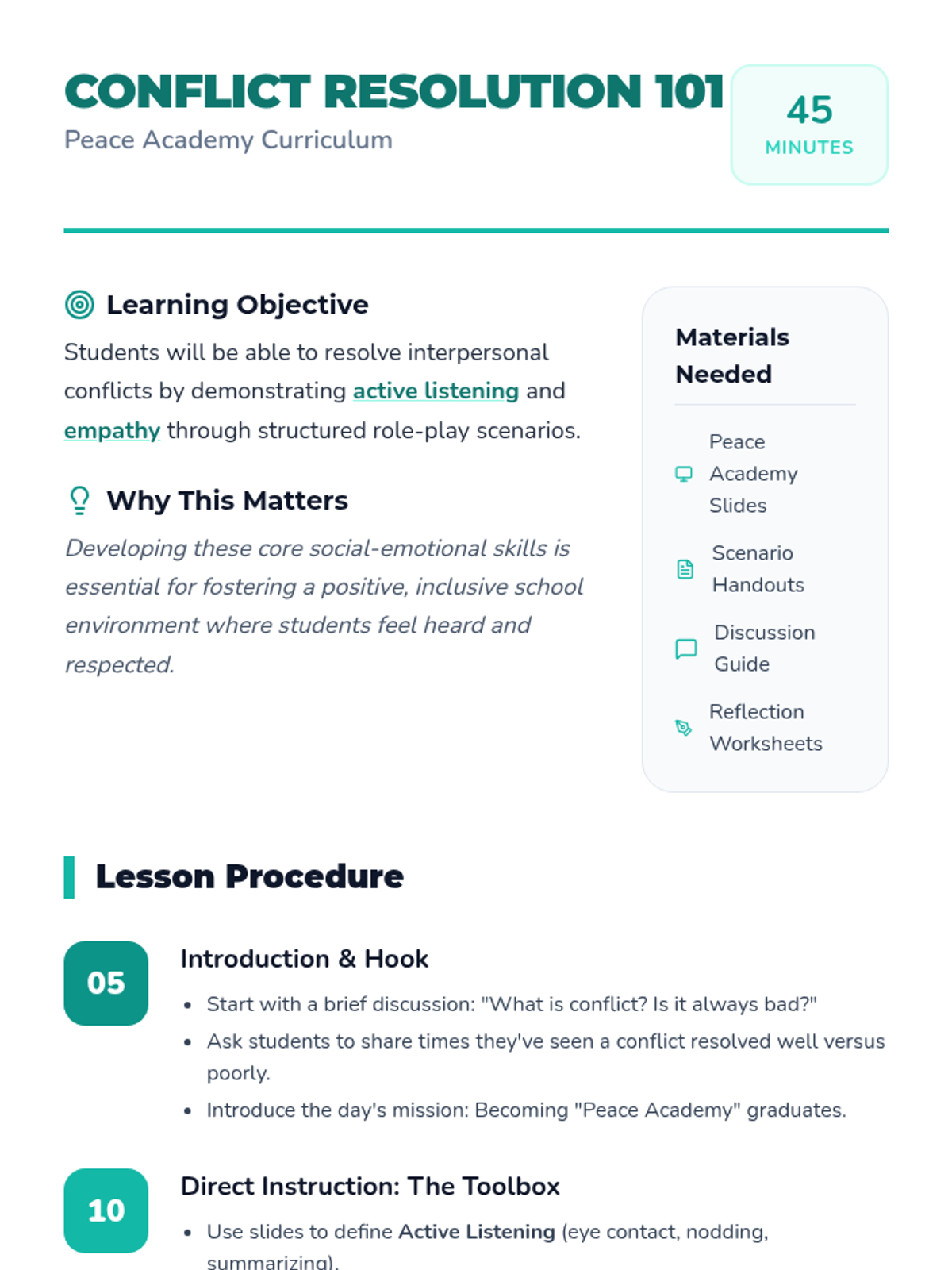 A comprehensive 45-minute lesson for 5th graders to master conflict resolution through active listening and empathy using role-playing activities.