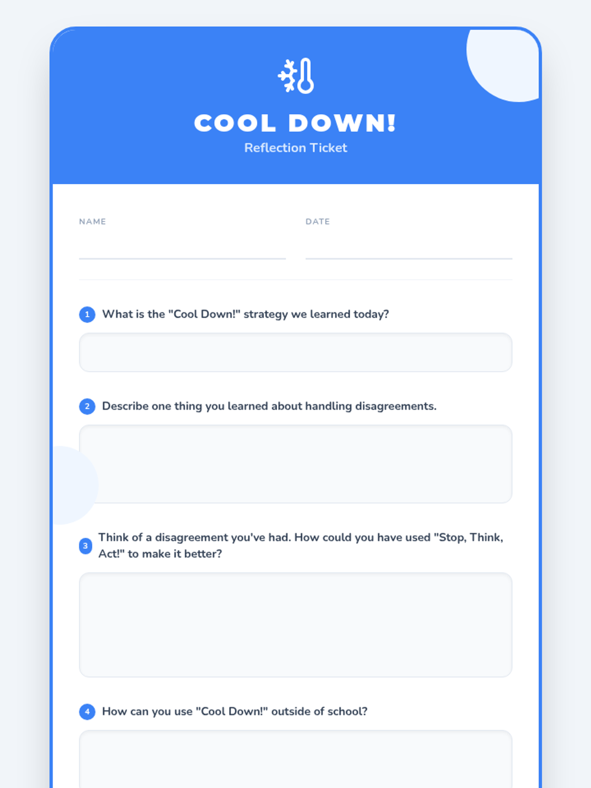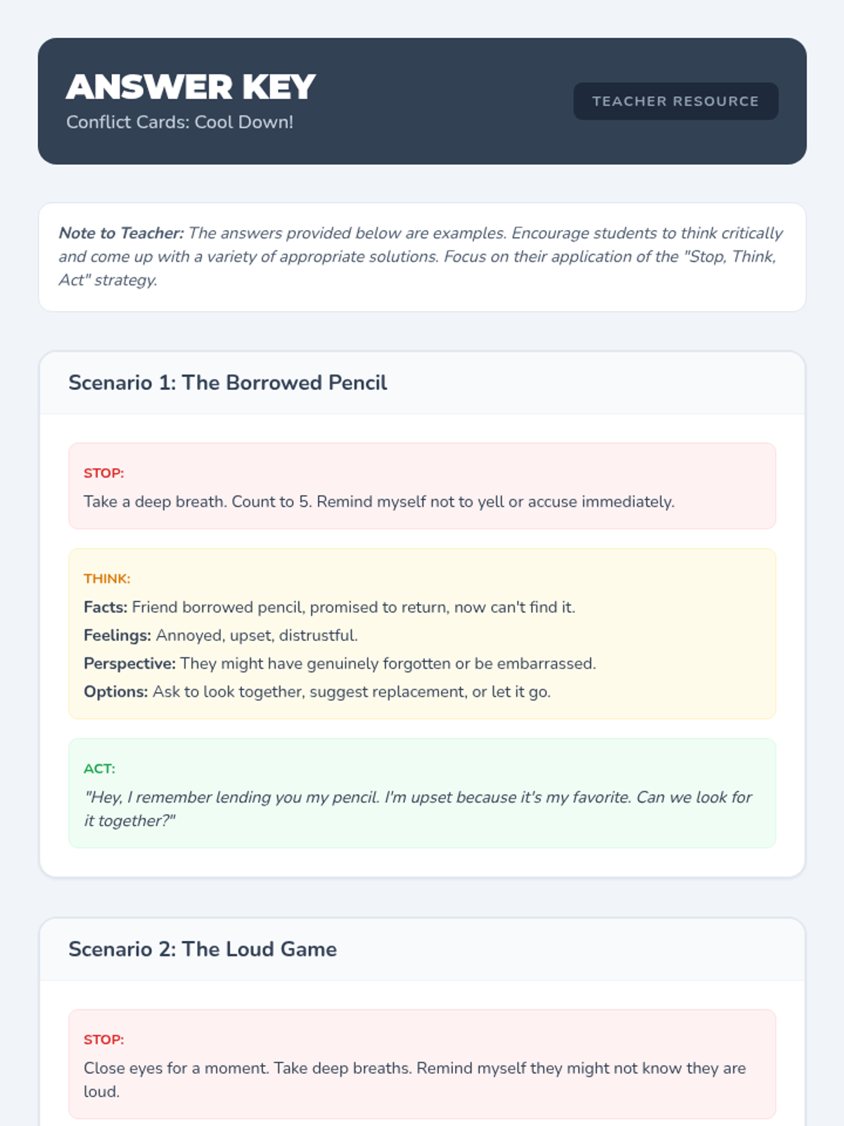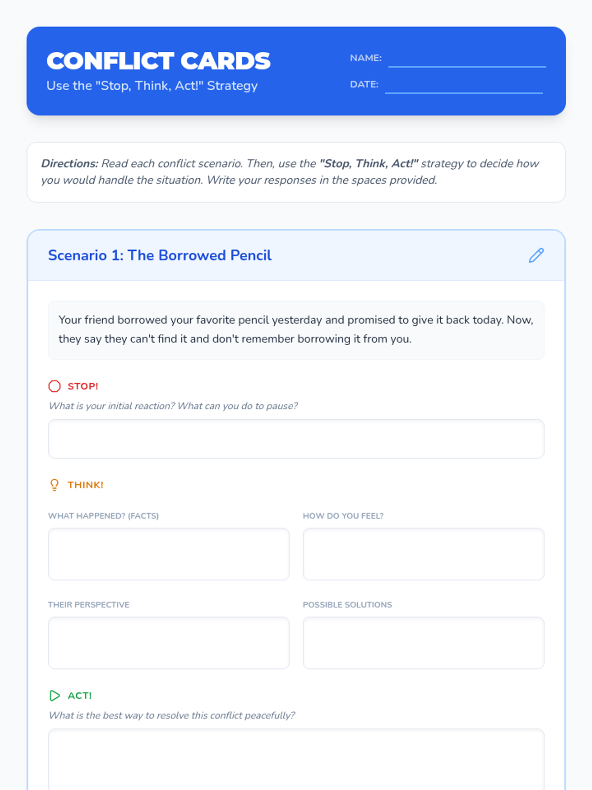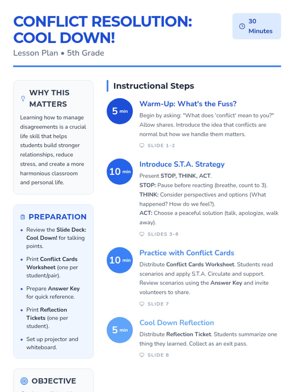 This lesson teaches 5th-grade students essential conflict management skills, focusing on identifying conflicts and using a simple three-step resolution strategy (Stop, Think, Act). Students will learn how to approach disagreements constructively, fostering a more positive and respectful classroom environment.