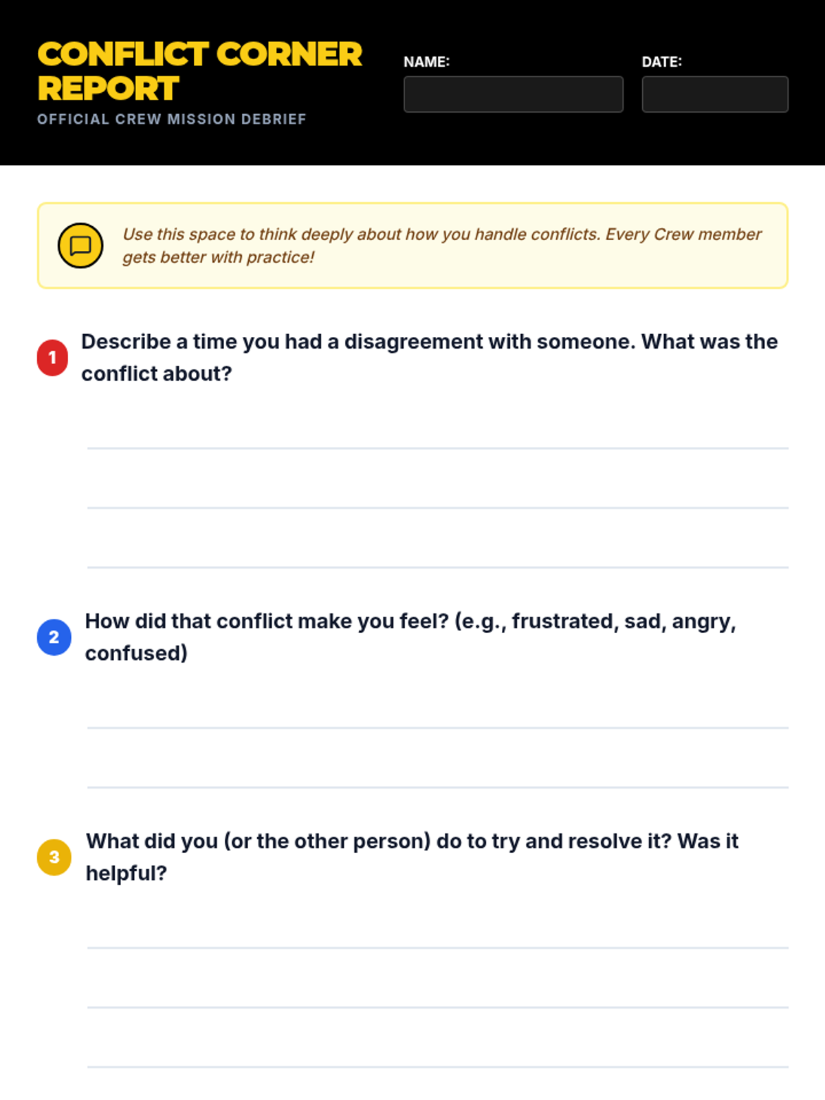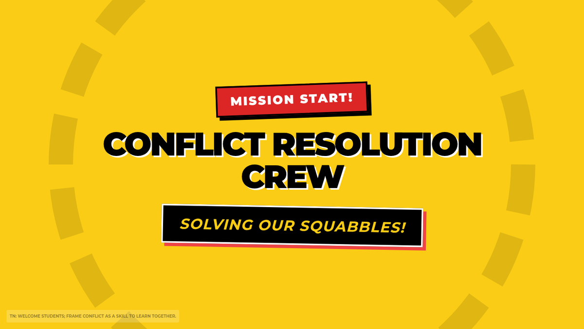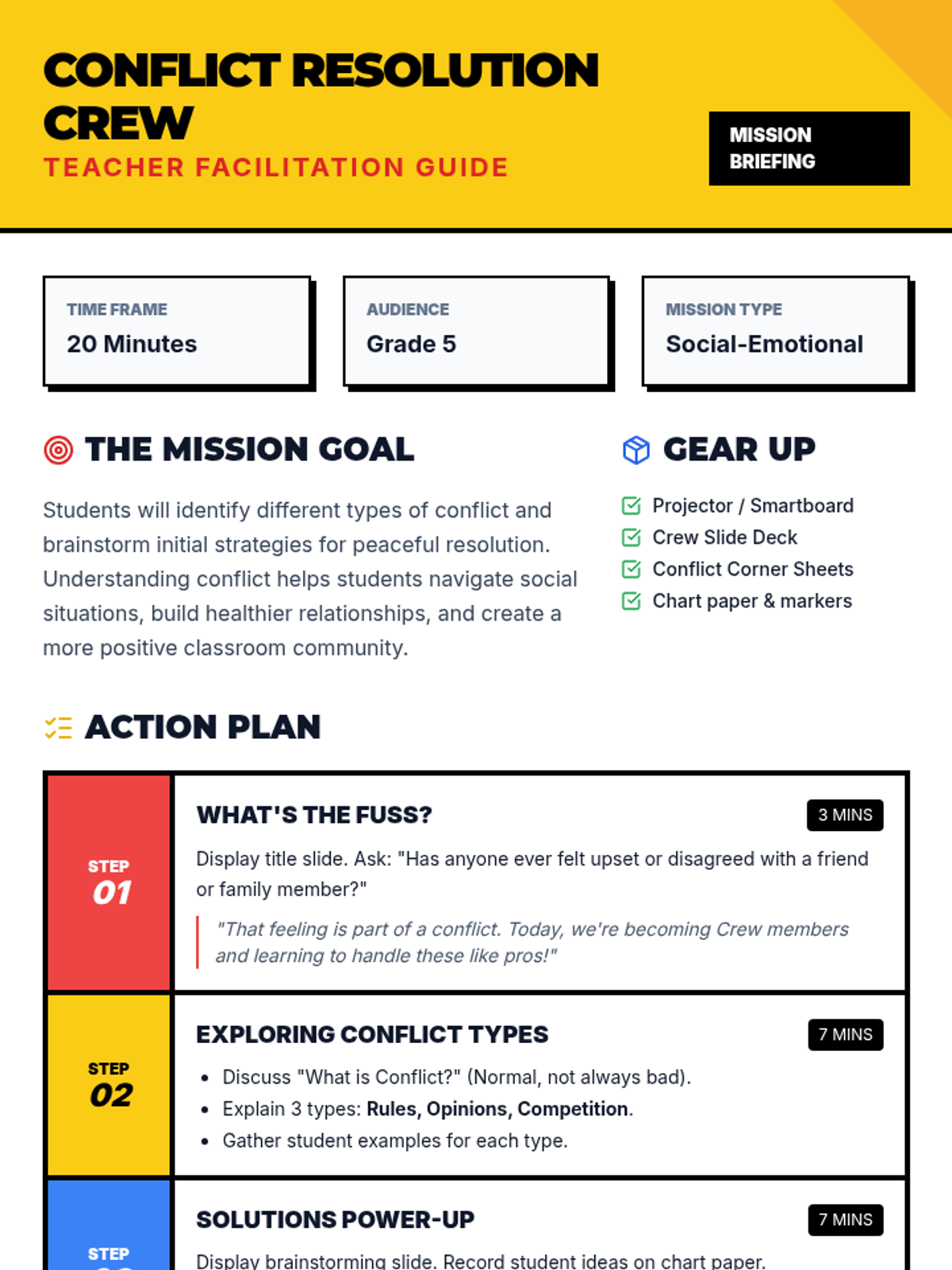 A 20-minute morning meeting lesson for 5th graders to identify conflict types and brainstorm peaceful resolution strategies using a 'Crew' superhero theme.