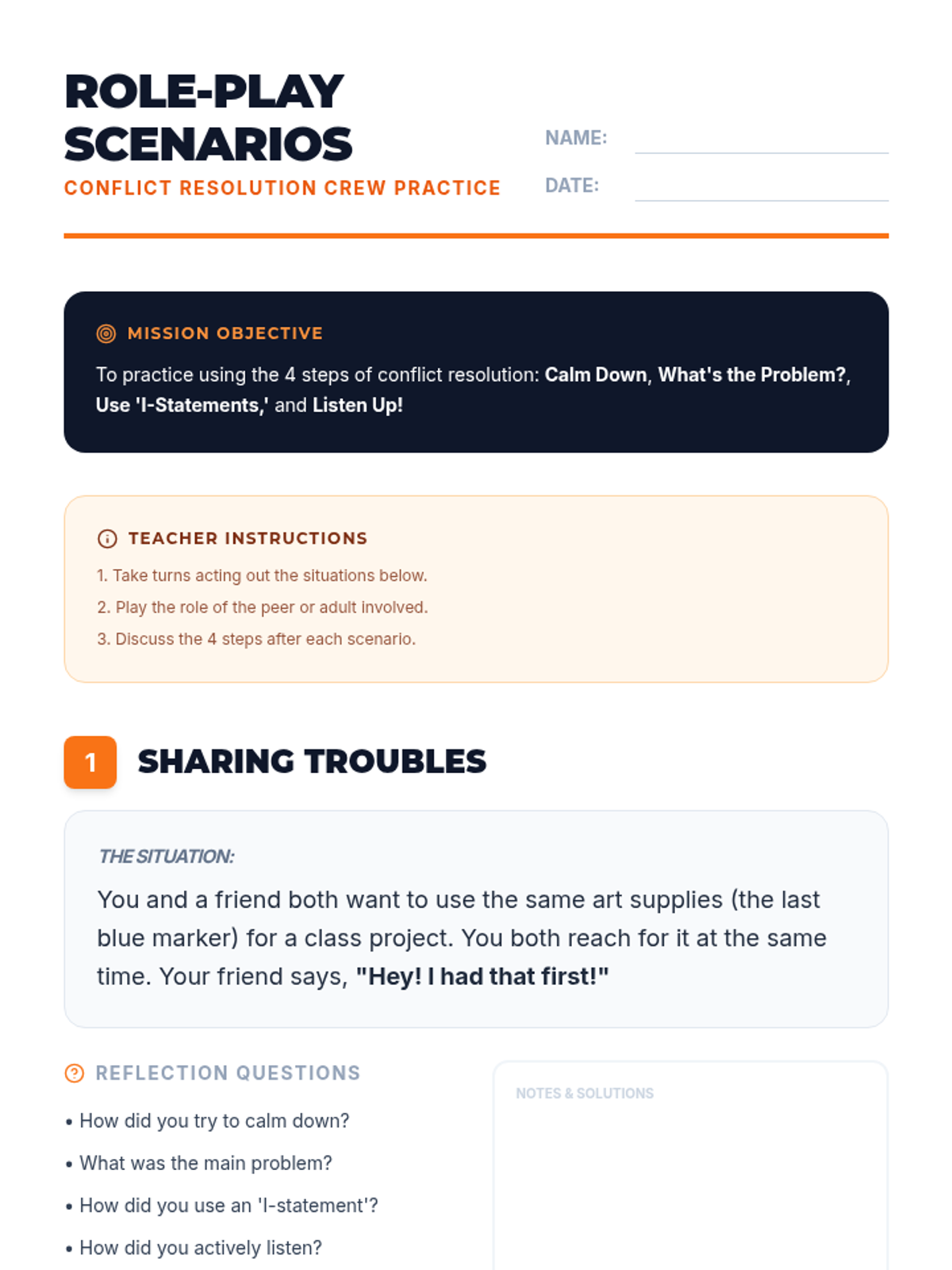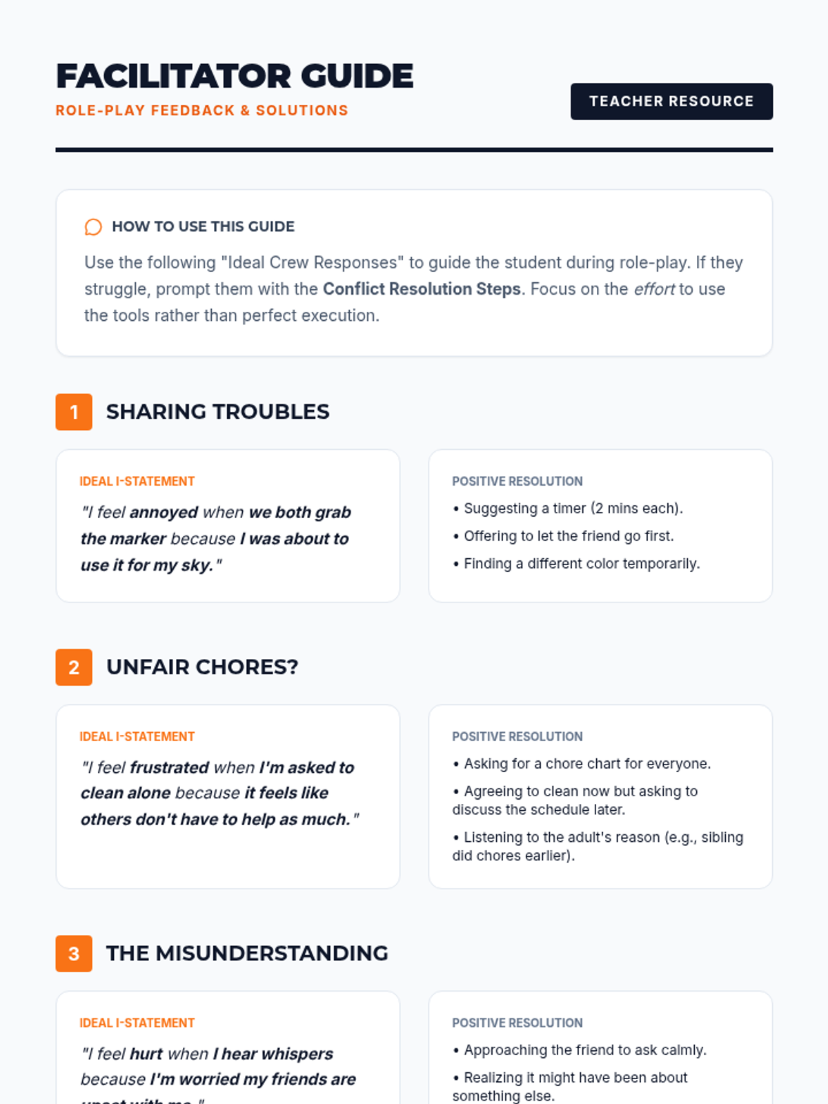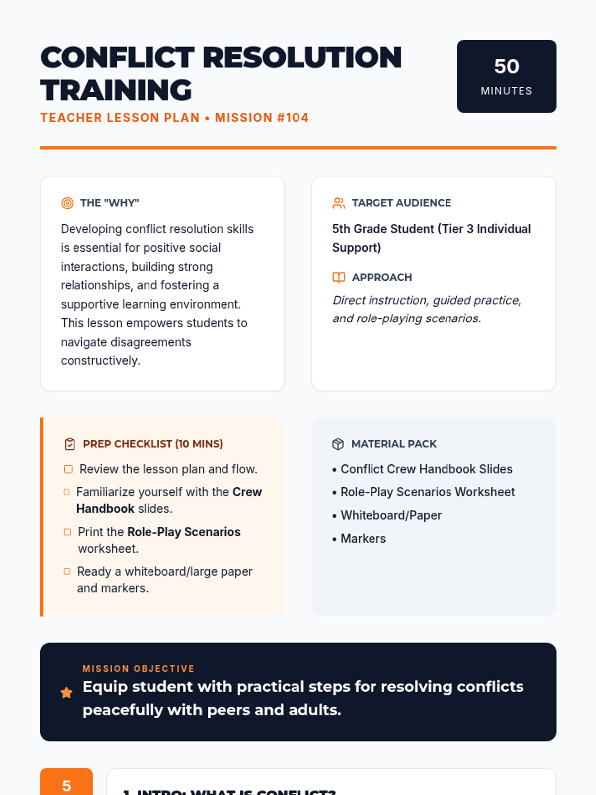 A 50-minute individual lesson for 5th graders focused on practical conflict resolution steps like I-statements and active listening through role-play and guided instruction.